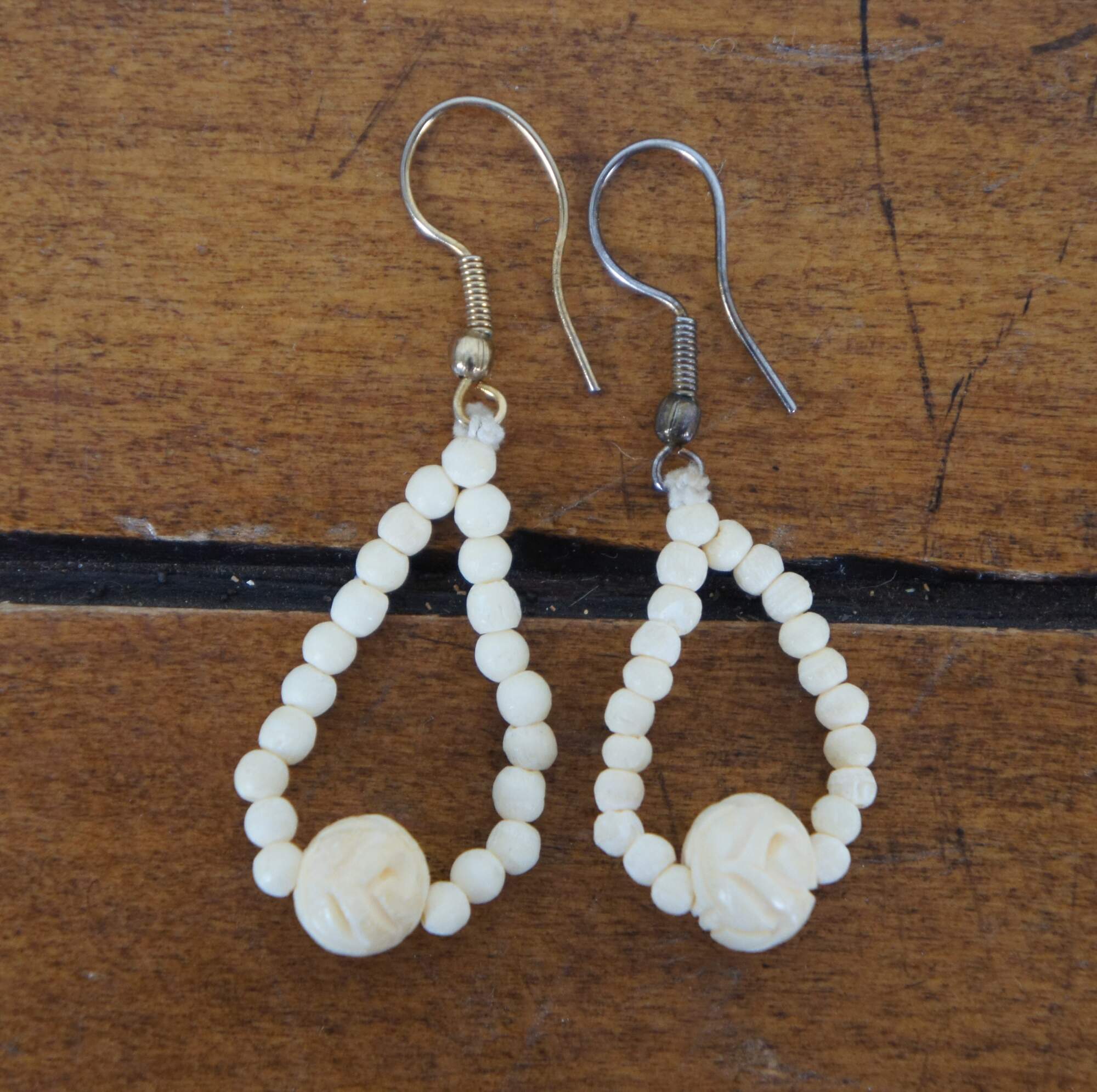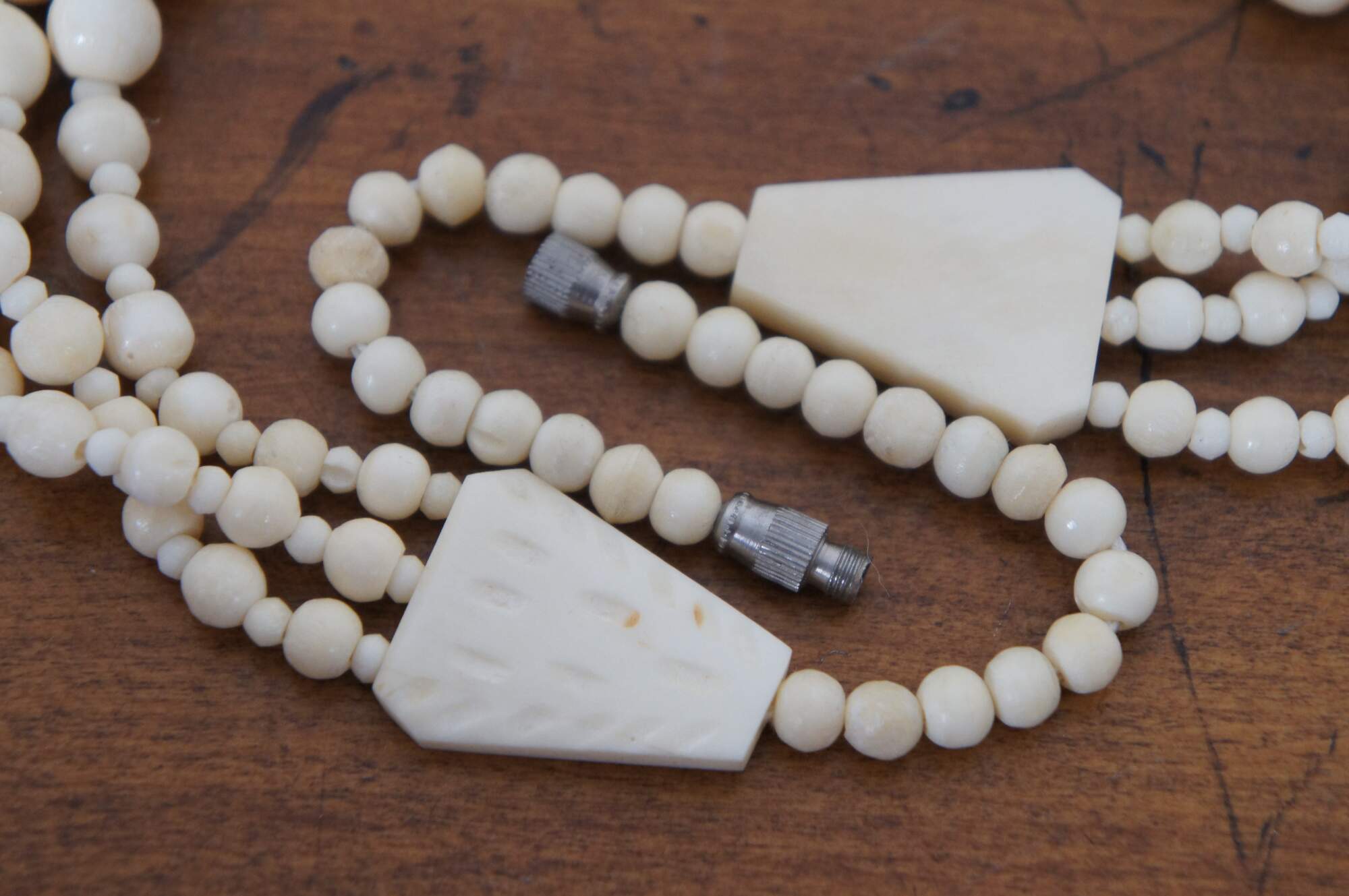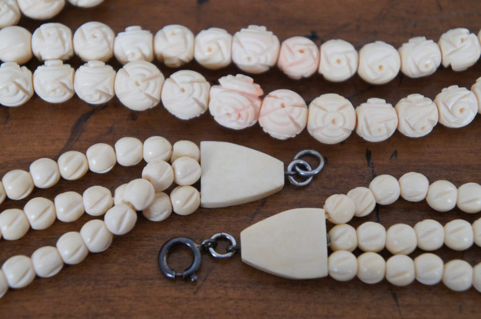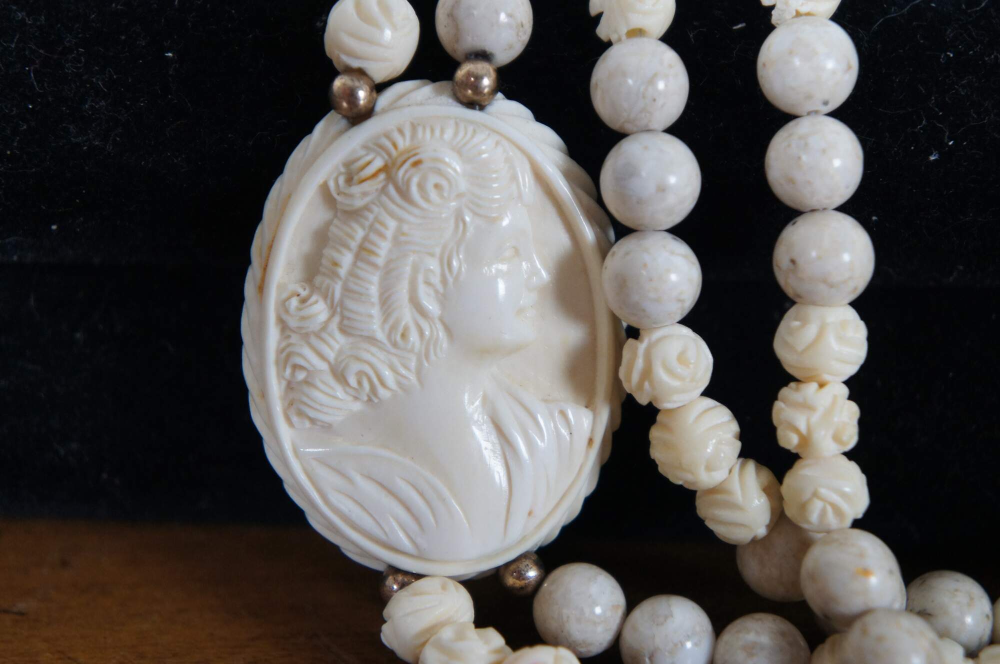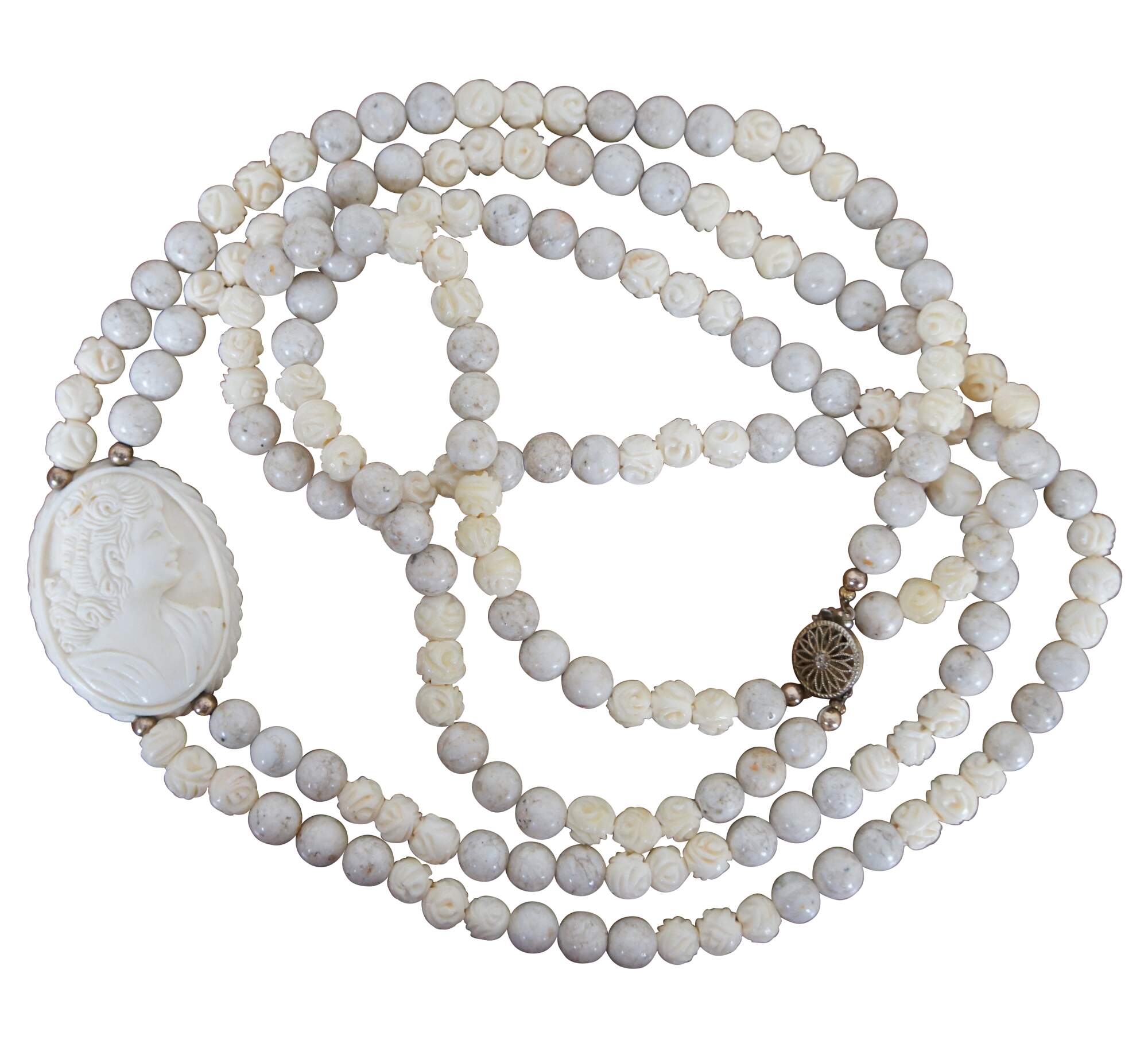 Set of three antique / vintage multi-strand beaded necklaces, one with smooth, round, graduated beads, one with graduated floral carved beads, and one with round carved floral beads alternating with round stone beads and an asymmetrically placed cameo. Set also includes a set of dangle earrings with fishhook back.