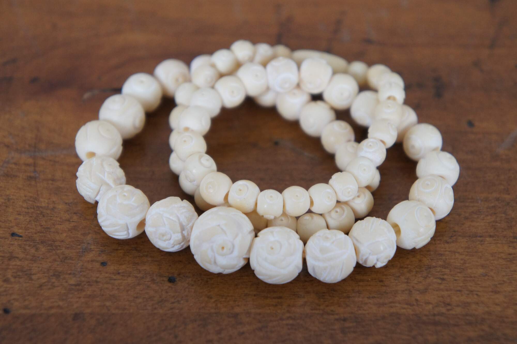 Lot of 6 antique and vintage necklaces crafted of round, floral, graduated carved bone beads and barrel clasps.