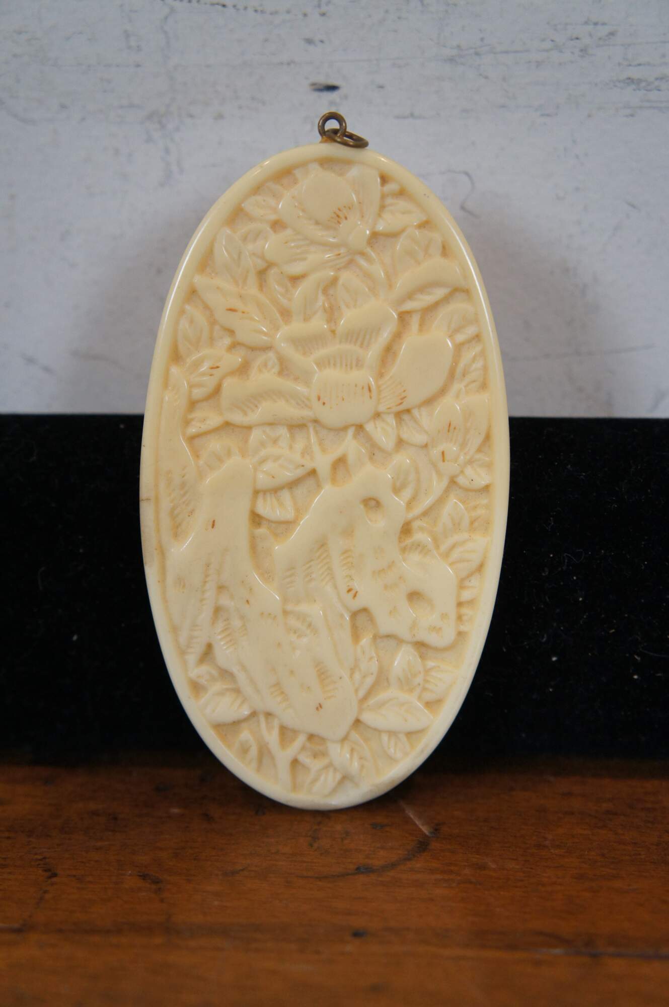 Lot of 17 early to mid 20th century hand carved bone jewelry pieces including two pairs of rose / flower screw back earrings, one rope twist ring, six rose pins / brooches, one morning glory brooch, one edelweiss brooch, one daisy brooch, one lily brooch, one bird brooch, and one large floral pendant that may actually be Bakelite.