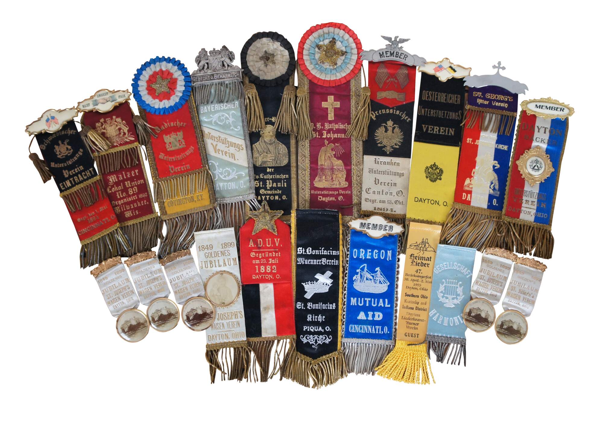 Large rare lot of 41 assorted late 19th – early 20th century antique labor union ribbons / pins, primarily from the German speaking community of Dayton, Ohio, plus a smattering of other cities including Cincinnati, Piqua, and Canton Ohio; Covington, Kentucky; and Milwaukee, Wisconsin.