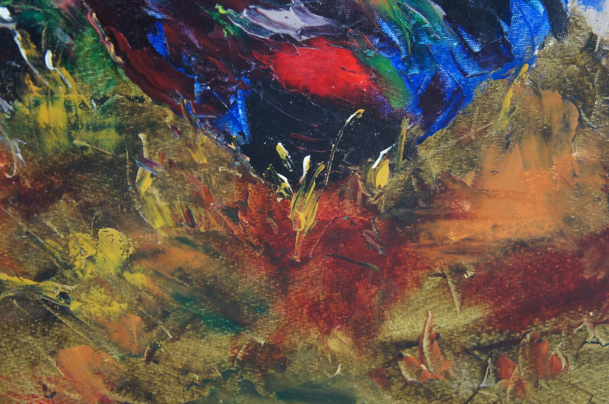 Vintage Impressionist country farmhouse oil painting featuring a pair of a Roosters / birds in a colorful spectrum of light. Signed lower left.