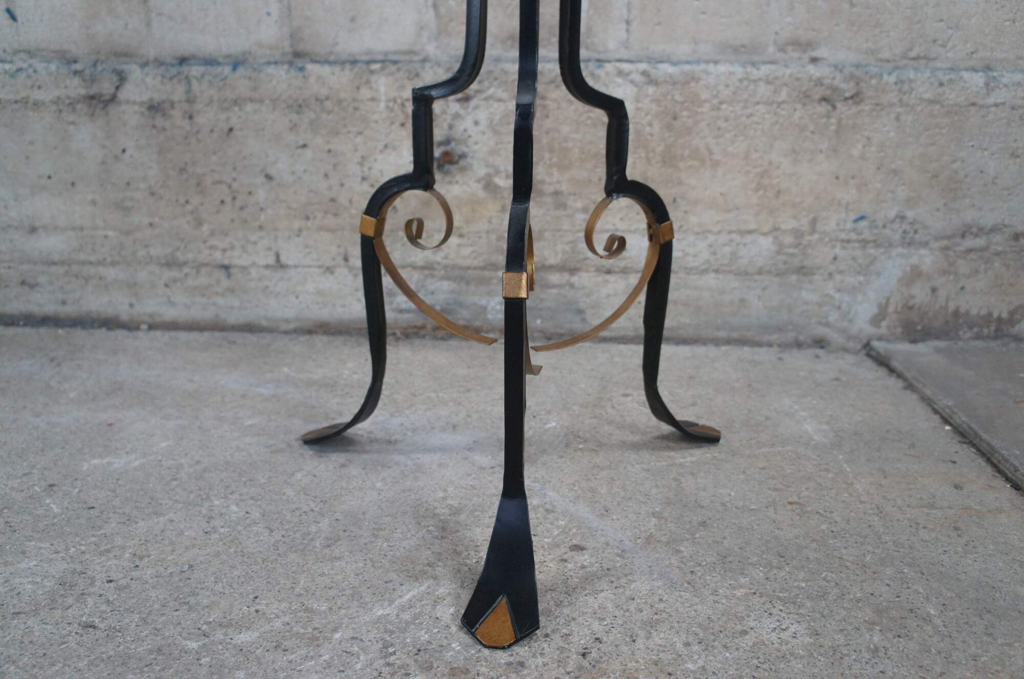 An elegant impressive pair of 20th century plant stands / sculpture pedestals. Made from black wrought iron and finished in black with touches gold to give them a French Empire or Regency flare. Features a round sunburst style top over a tristed iron center leading to a tripod pedestal base with flared feet. Beneath the top is a sculptural branched boquet and leaf design. A remarkable pair that will desplay well in any space.