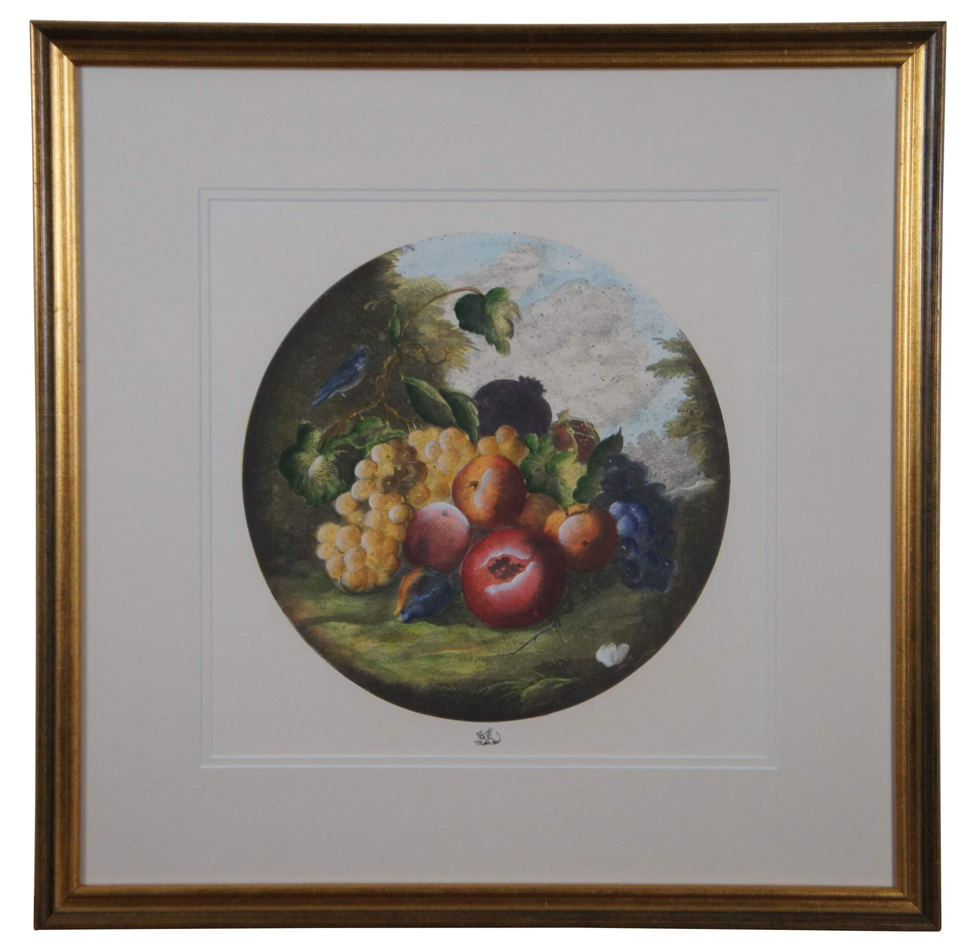Pair of vintage lithograph prints showing still life of fruit (grapes, peaches, apples, oranges) accented with a grasshopper, a bluebird, and butterflies. Printed as a round image with a makers mark of a dragon reclined beneath.