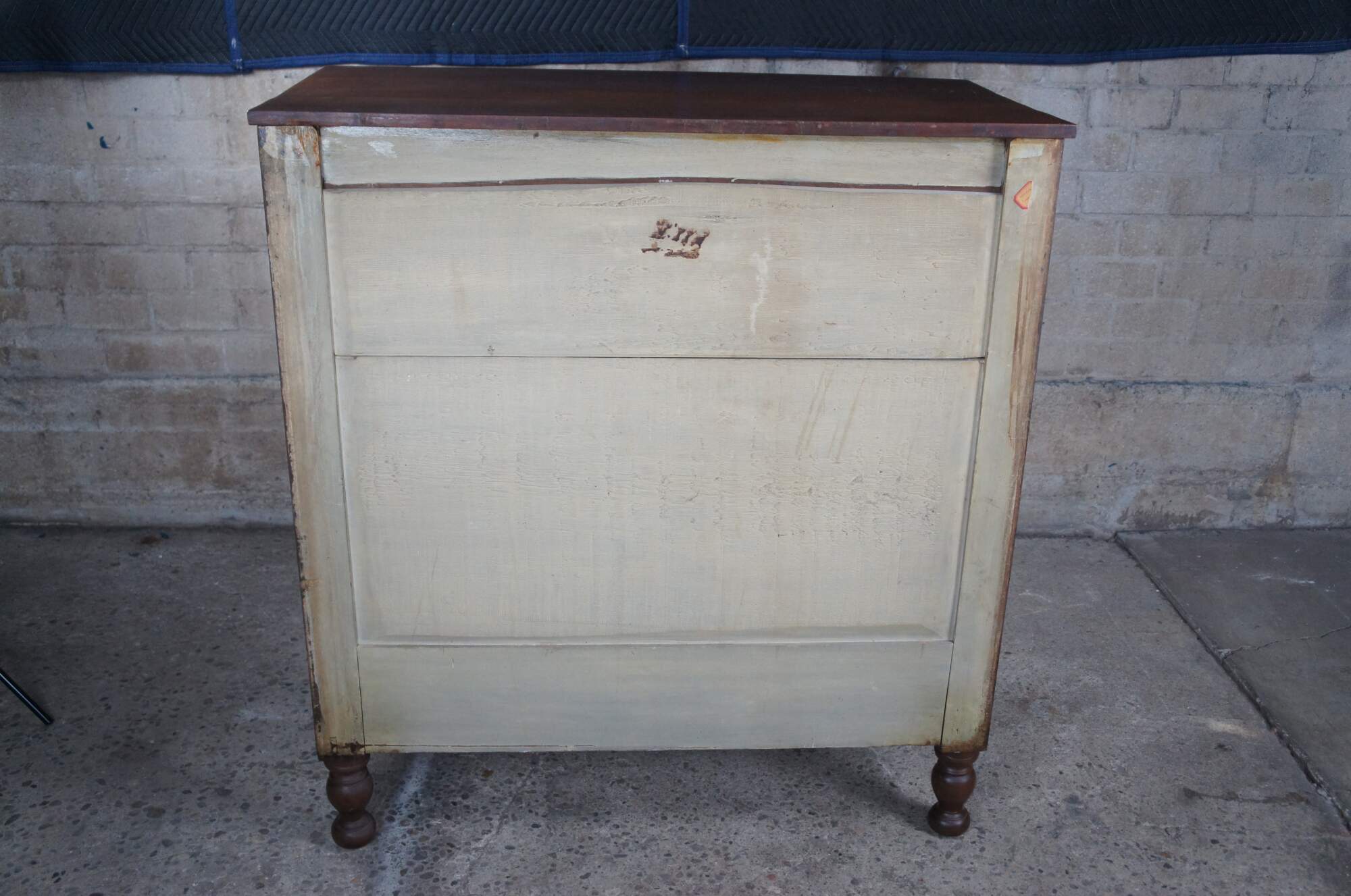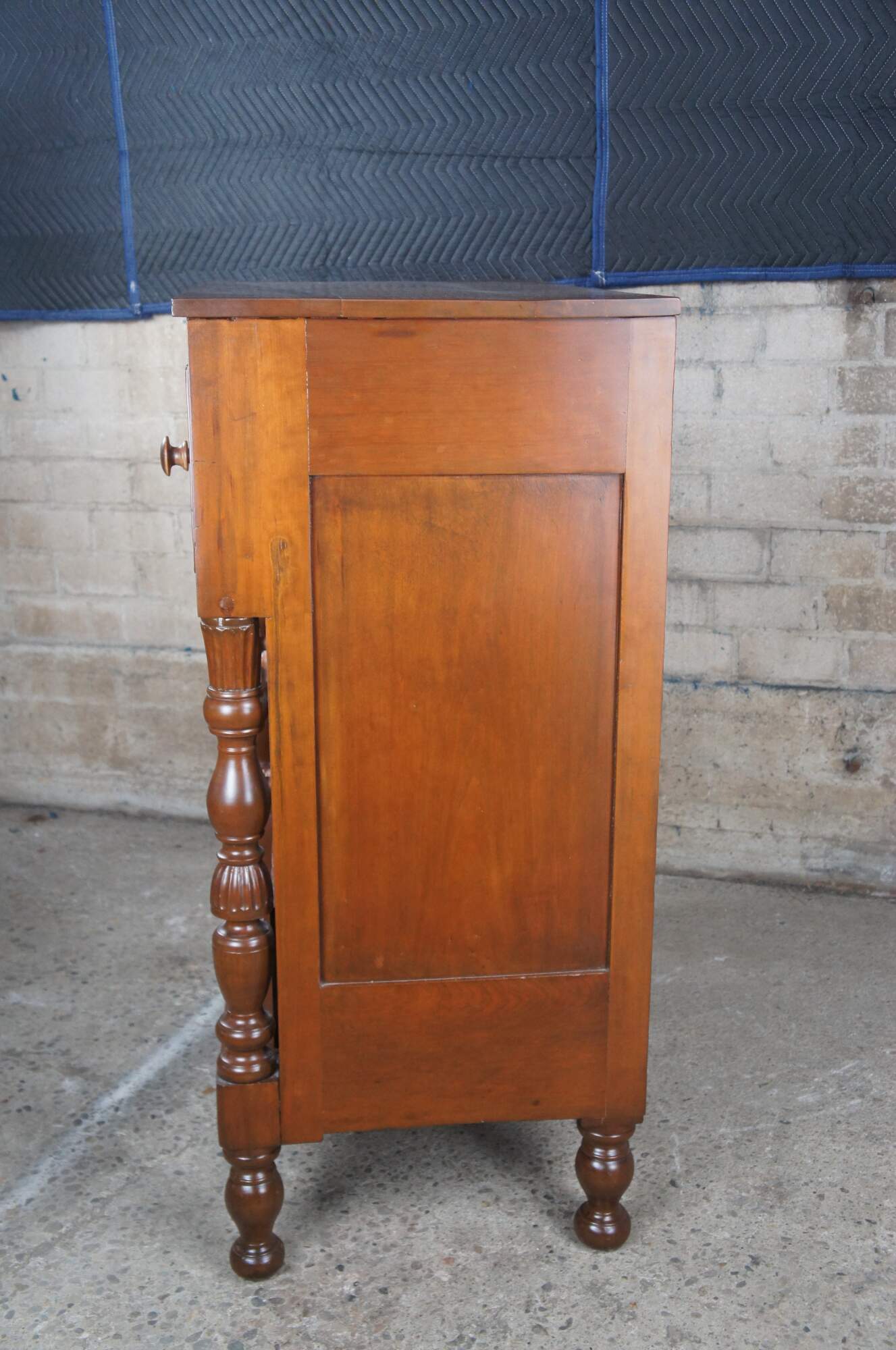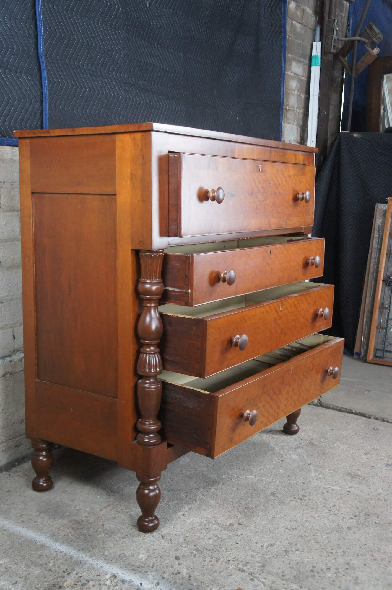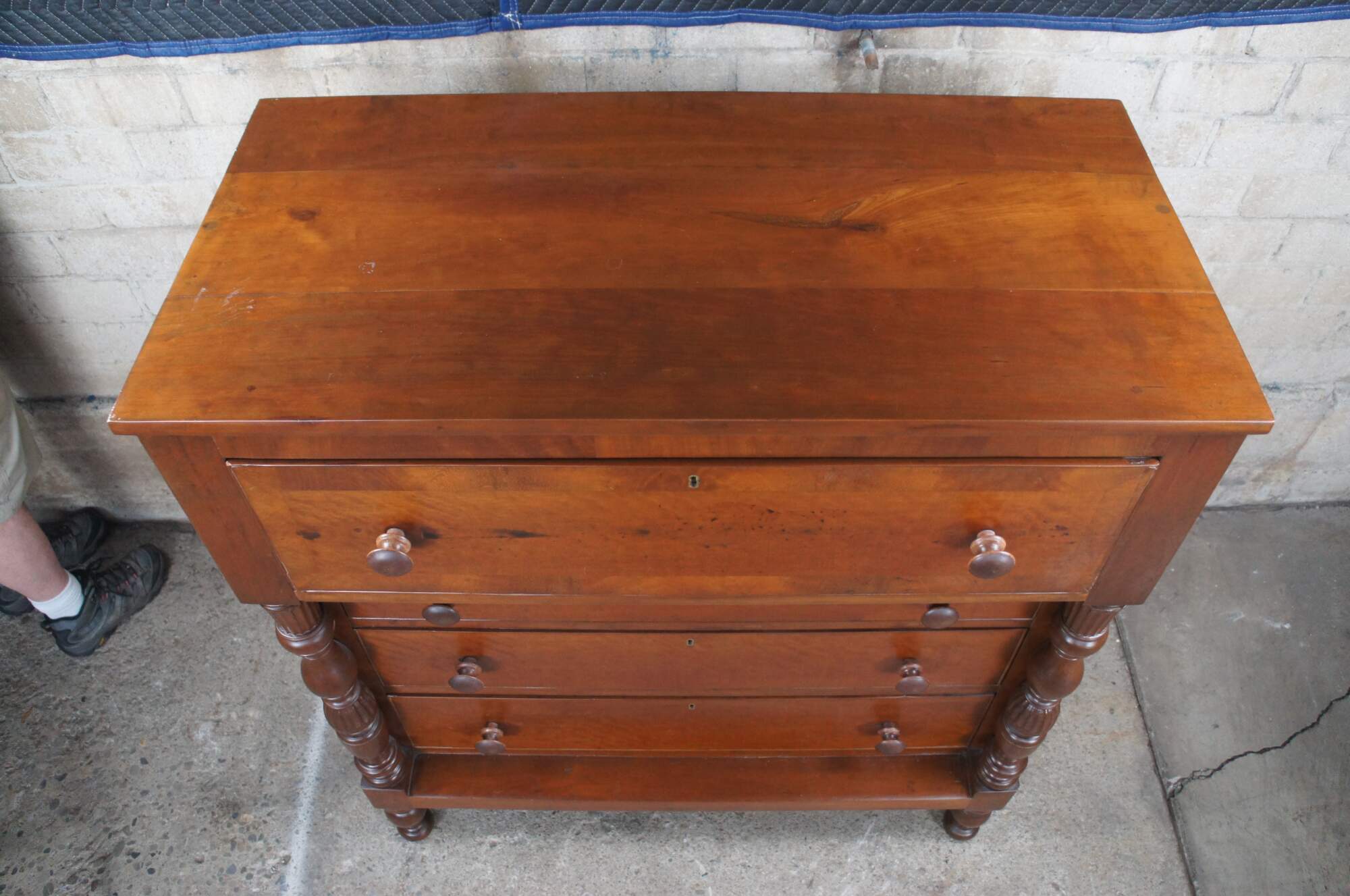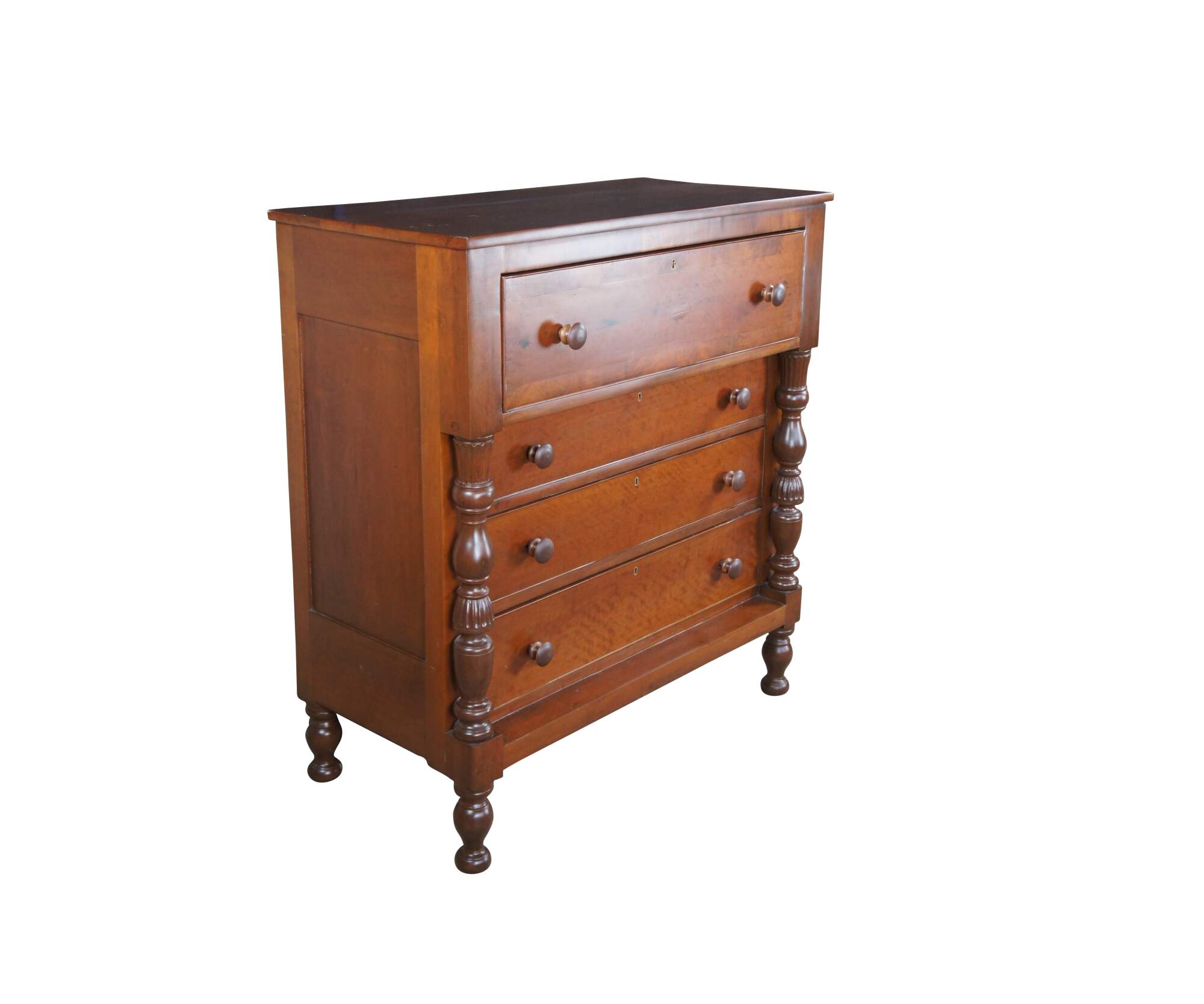 A large and impressive Victorian chest of drawers, circa 1870s. Made from Cherry with walnut banding. Features 4 hand dovetailed drawers with a pronounced top. The stiles showcase whole turned, fluted and ribbed columns. The case is raised over turnip feet. A warm addition to any space.