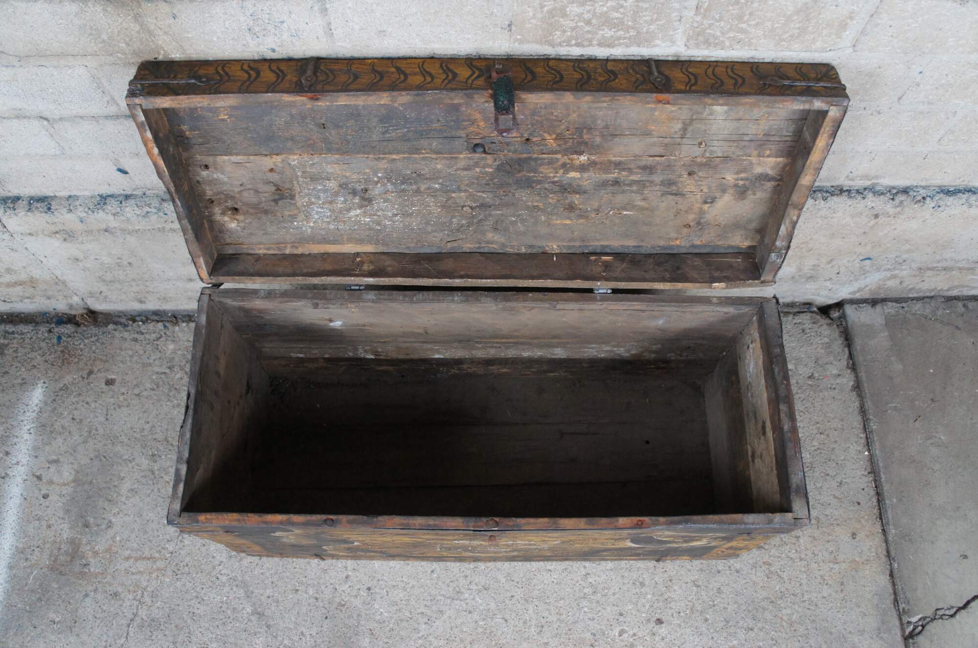 An impressive Tibetan storage from the first quarter of the 20th century. A wooden frame richly finished with lacquered leather hide and banded iron hardware. The front is hand-painted with a tiger at the center and framed in tigere stripes The tops, sides and back have an orange tiger stripe framing with blue framing. Common motifs in Chinese and Tibetan Buddhist art, tigers are symbols of strength, fearlessness, power, and authority.