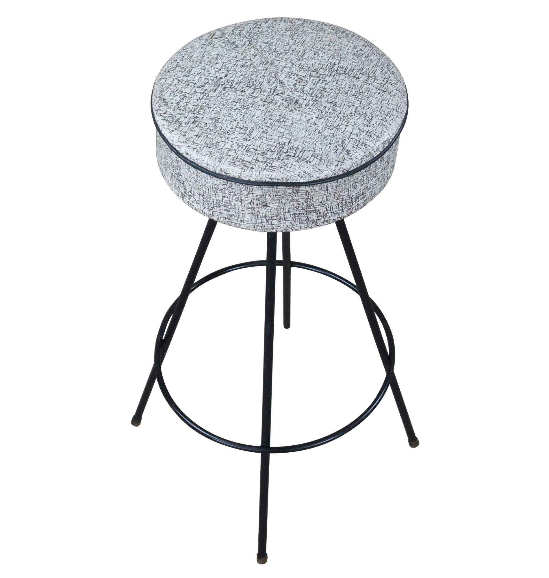 Atomic era bar stools. Made from wrought iron with a vinyl seat. Features a round seat over 4 legs leading to foot rest and capped feet.