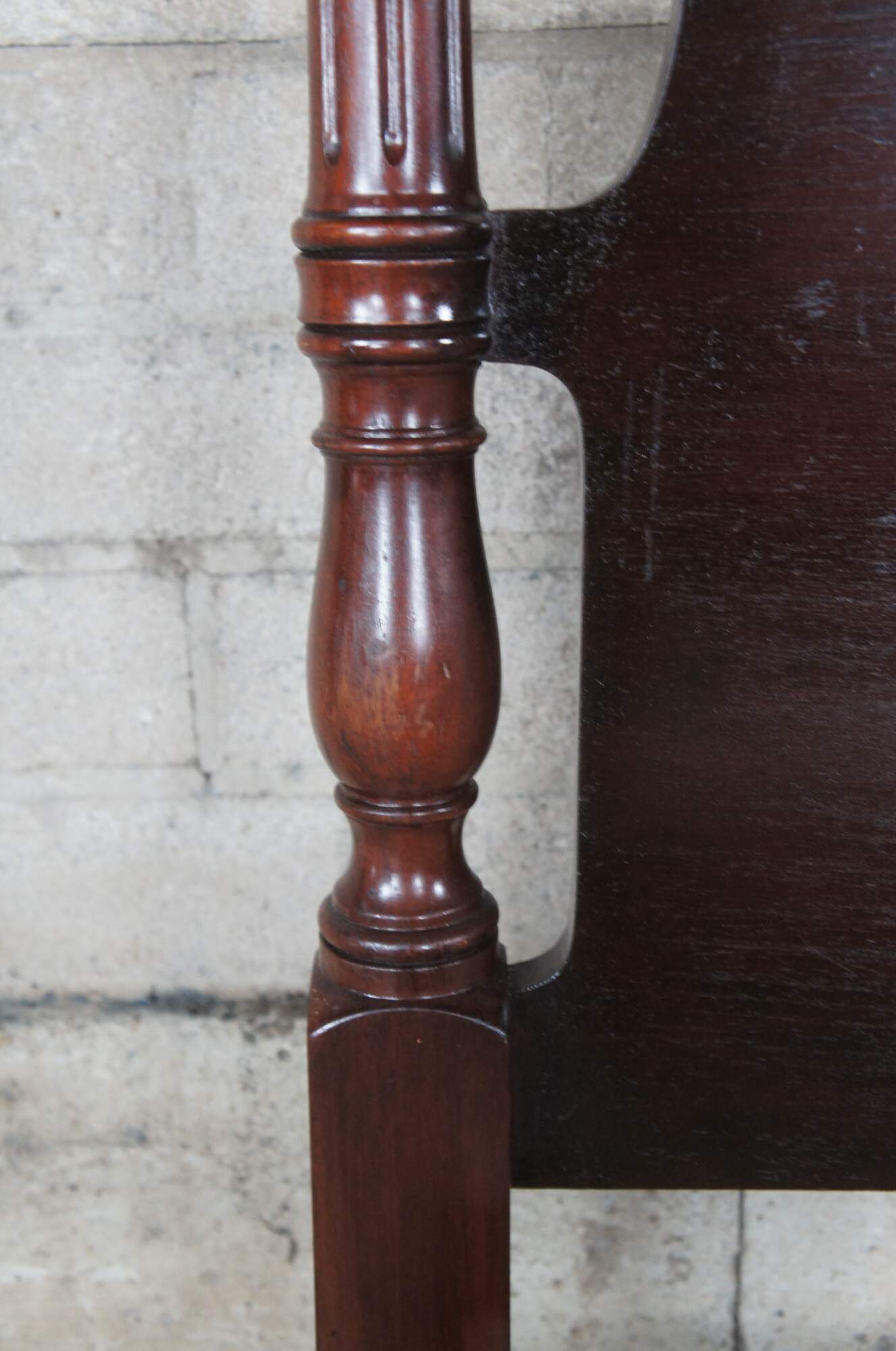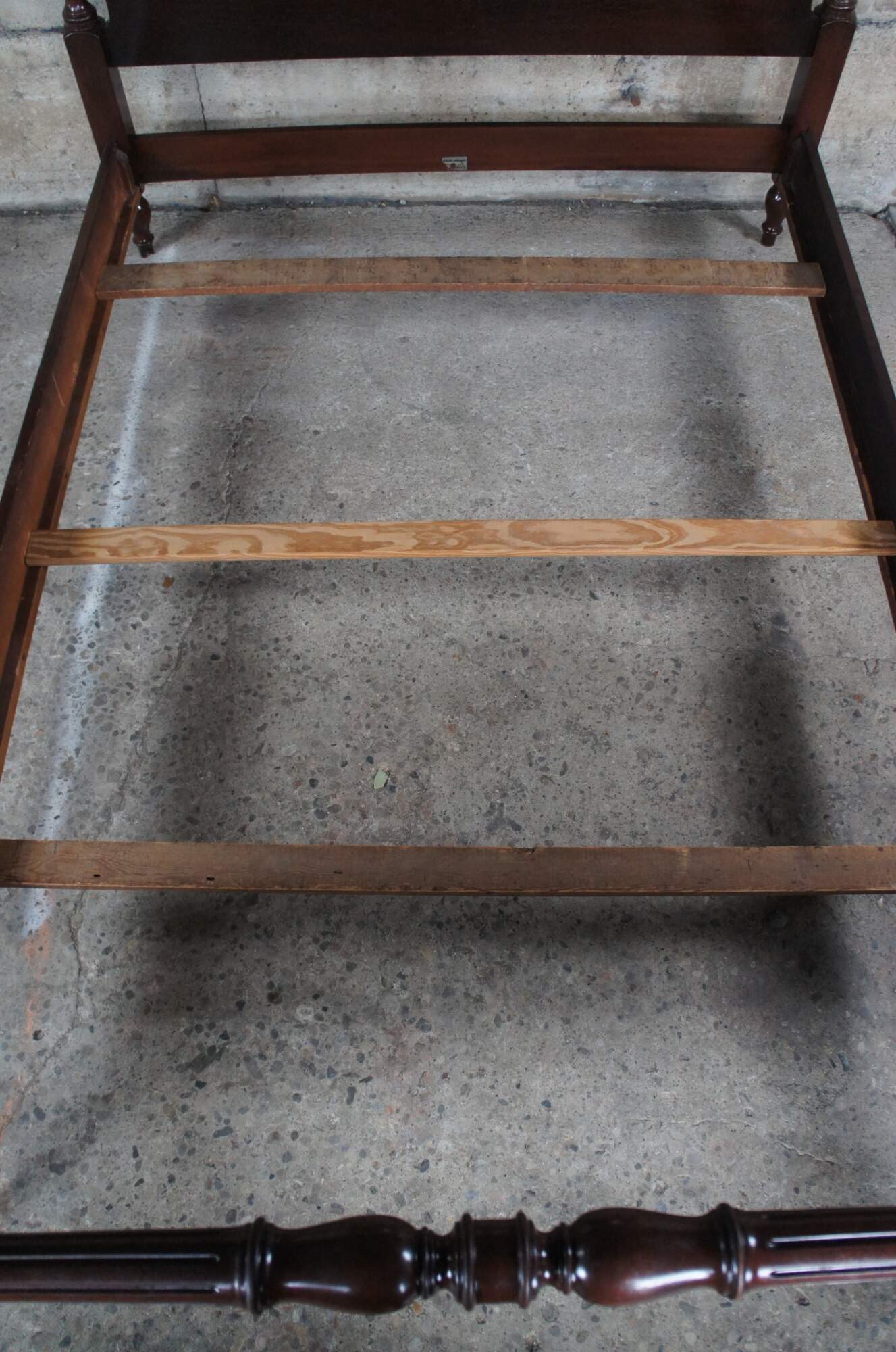 Sheraton style full size bed by West Michigan Furniture Co., circa 1940s. Made from mahogany with an open pediment headboard. features turned and fluted posts with trophy finials. The bed is supported by turnip feet.