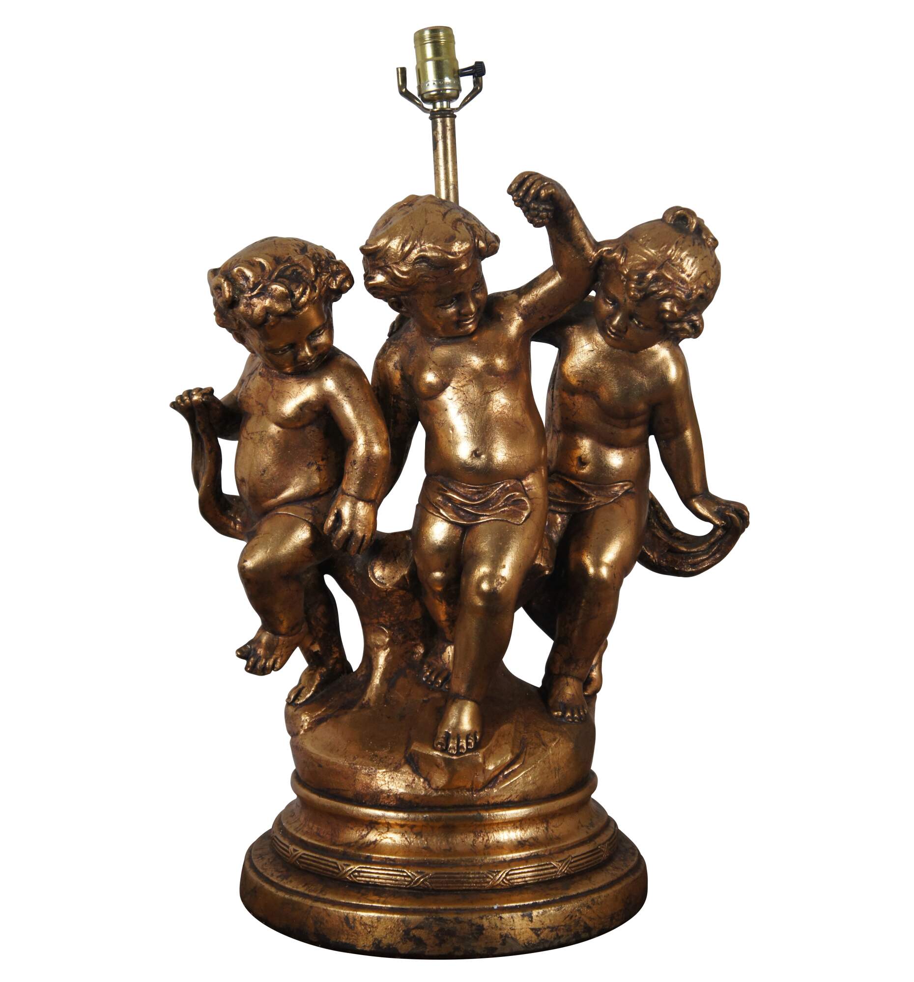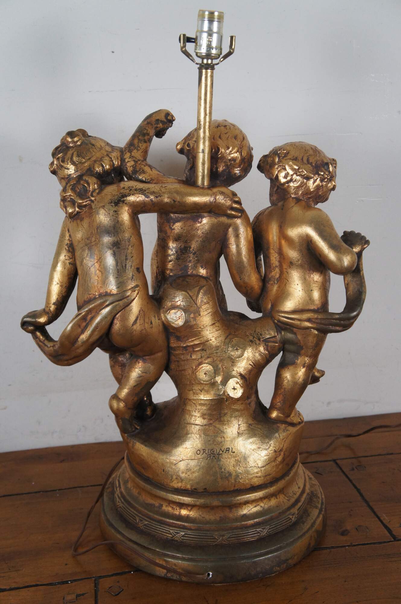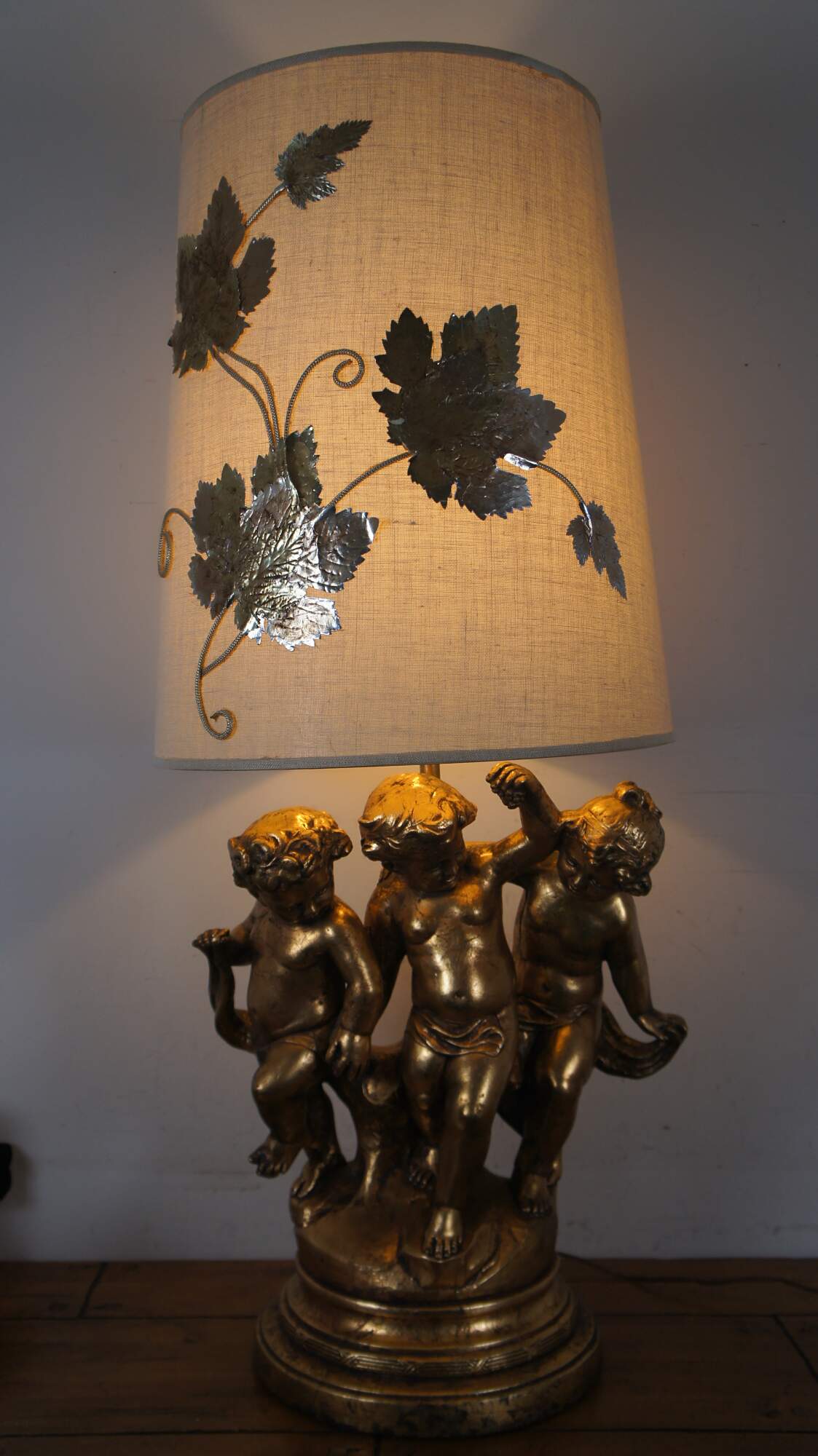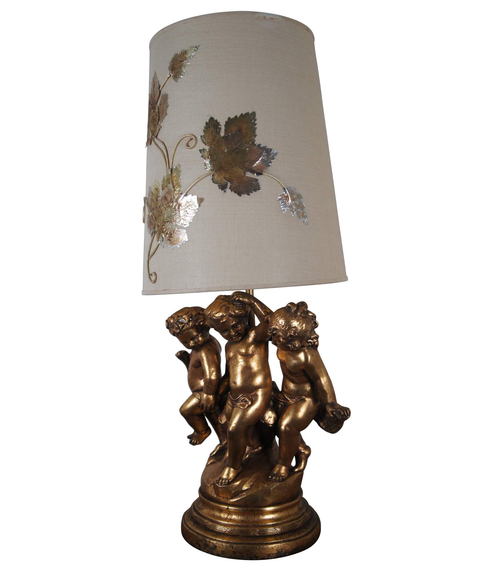 A large and impressive / monumental mid 20th century gilded toleware sculptural table lamp showing three Neoclassical putti figures / wingless cherubs on a round plinth. Marked Original Art on back side. Paired with immense linen shade accented with metallic grape leaves and swirling vines.