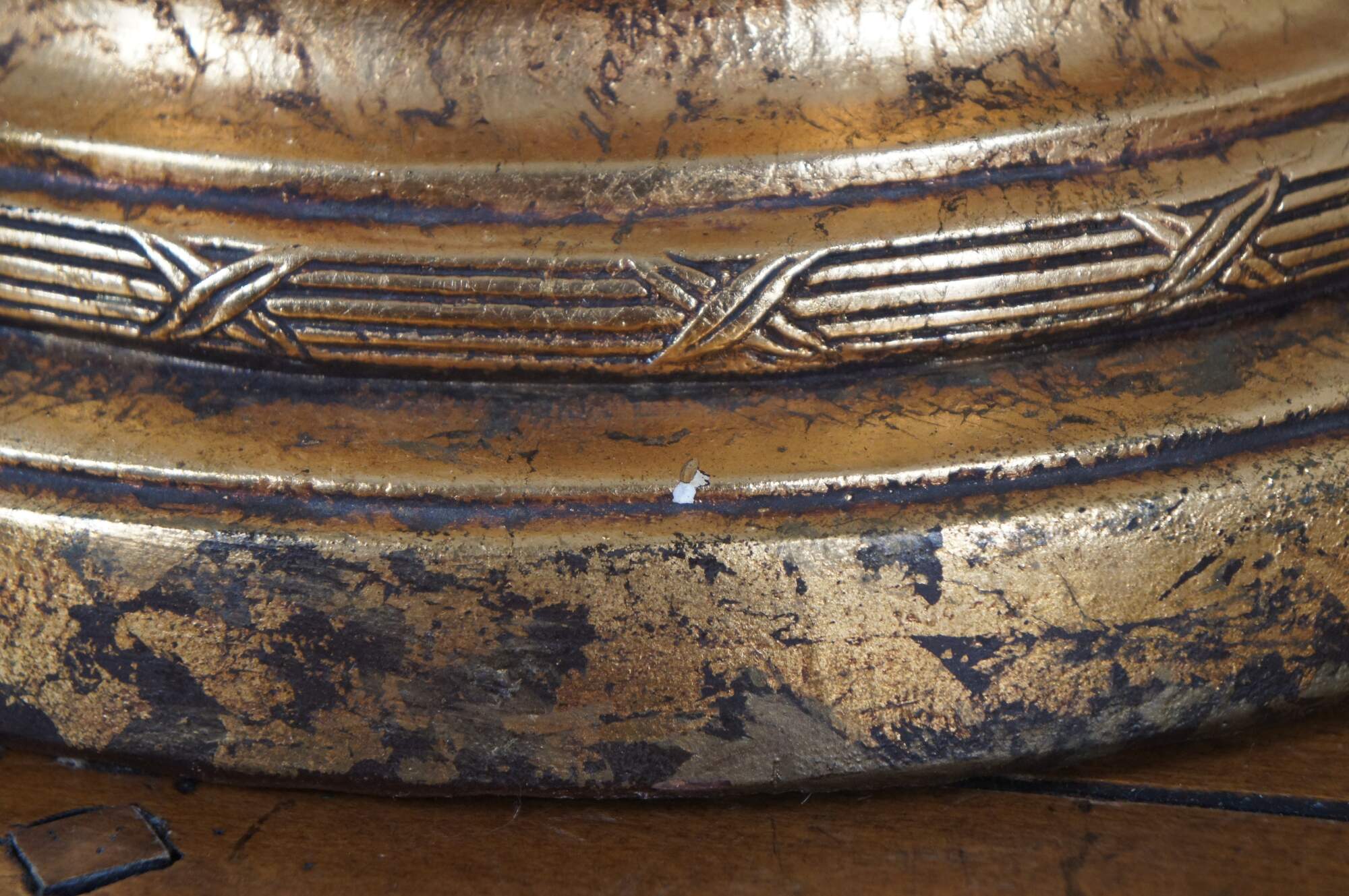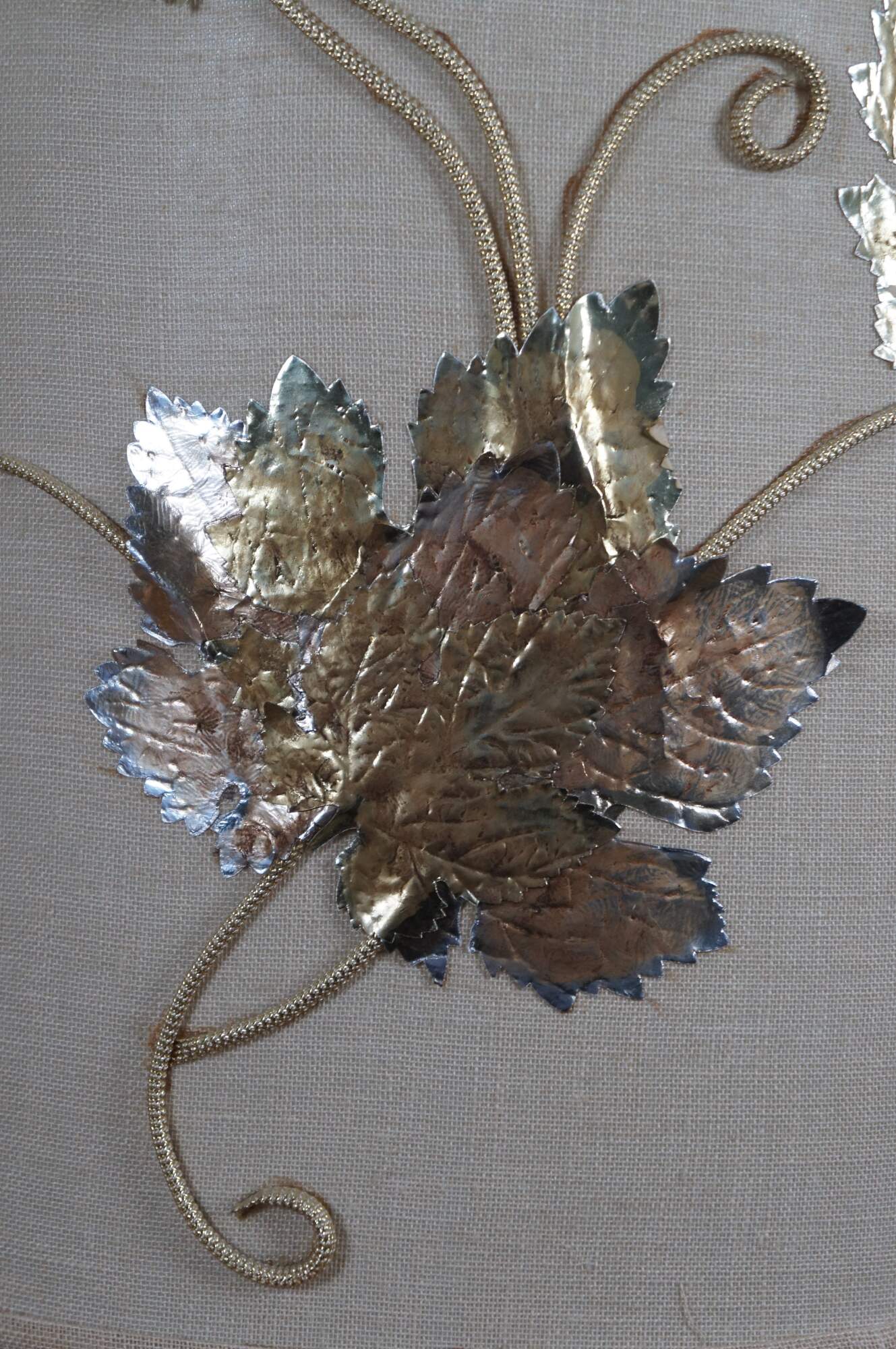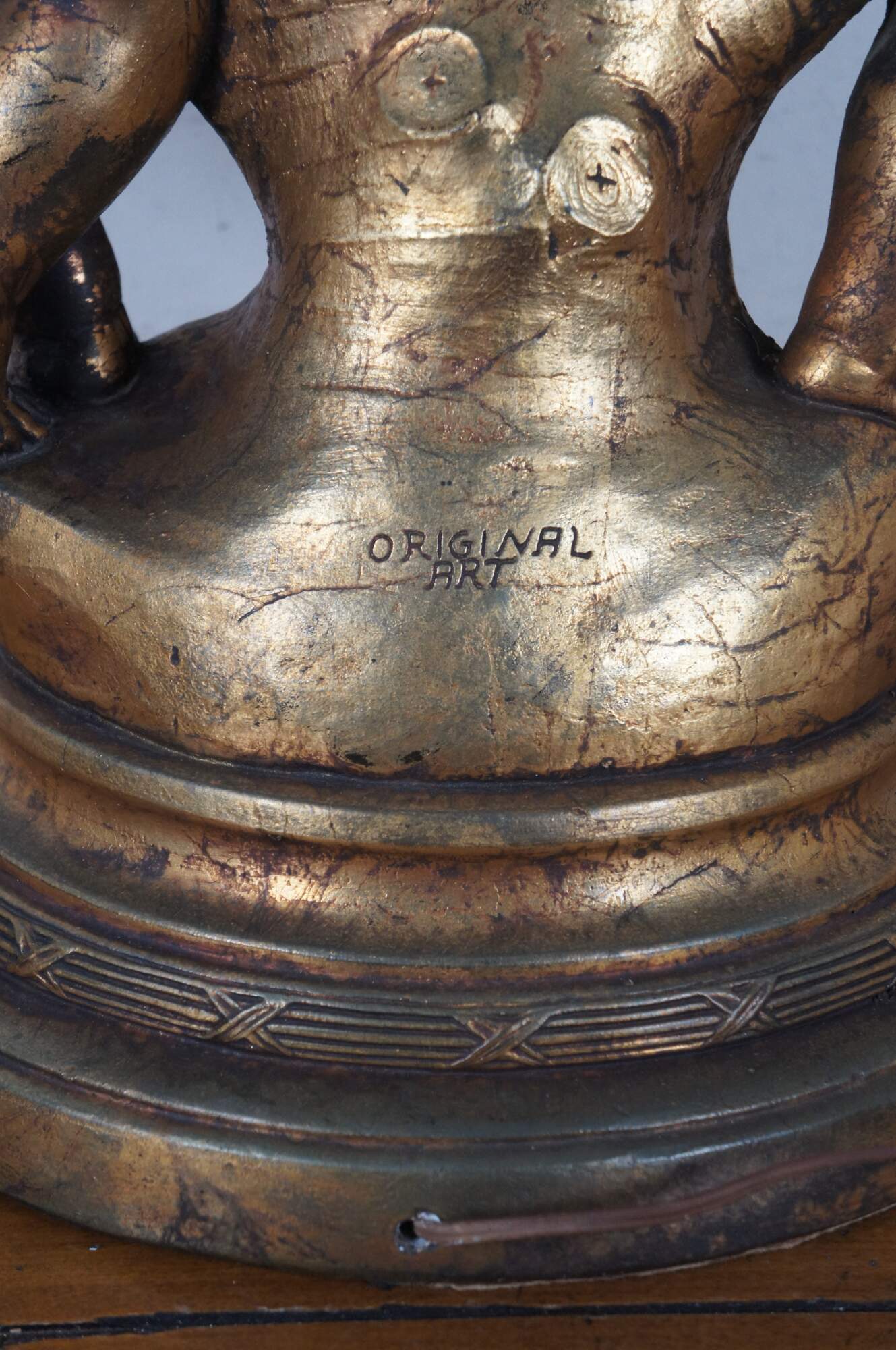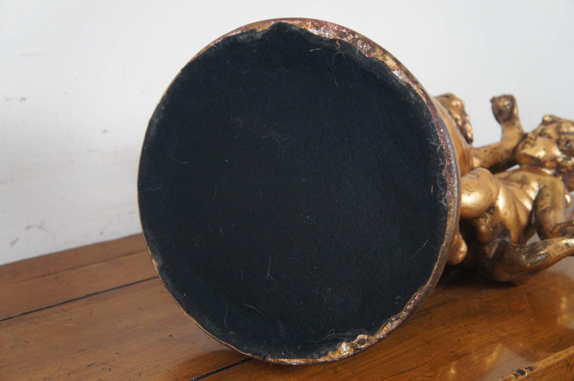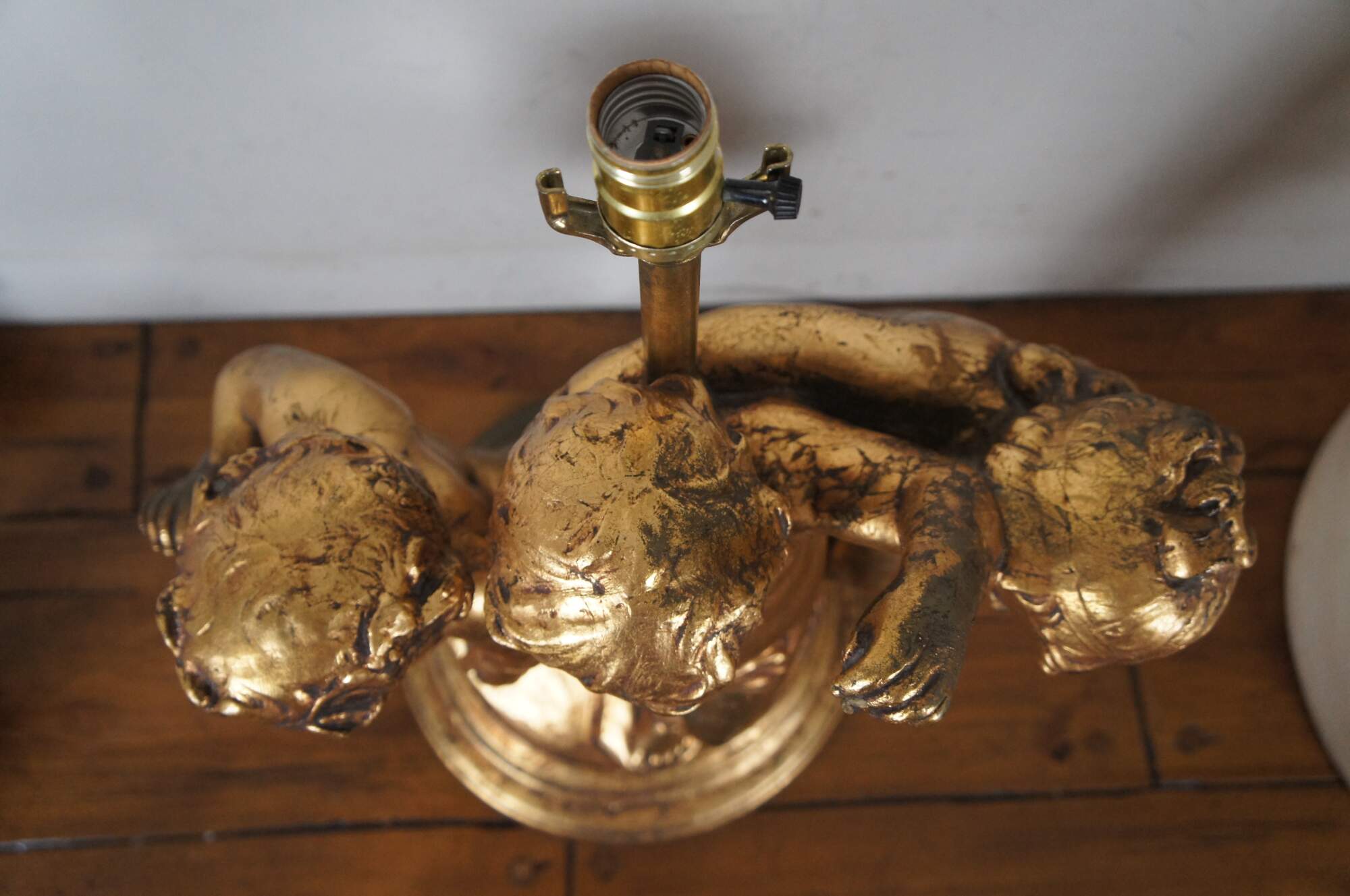 A large and impressive / monumental mid 20th century gilded toleware sculptural table lamp showing three Neoclassical putti figures / wingless cherubs on a round plinth. Marked Original Art on back side. Paired with immense linen shade accented with metallic grape leaves and swirling vines.