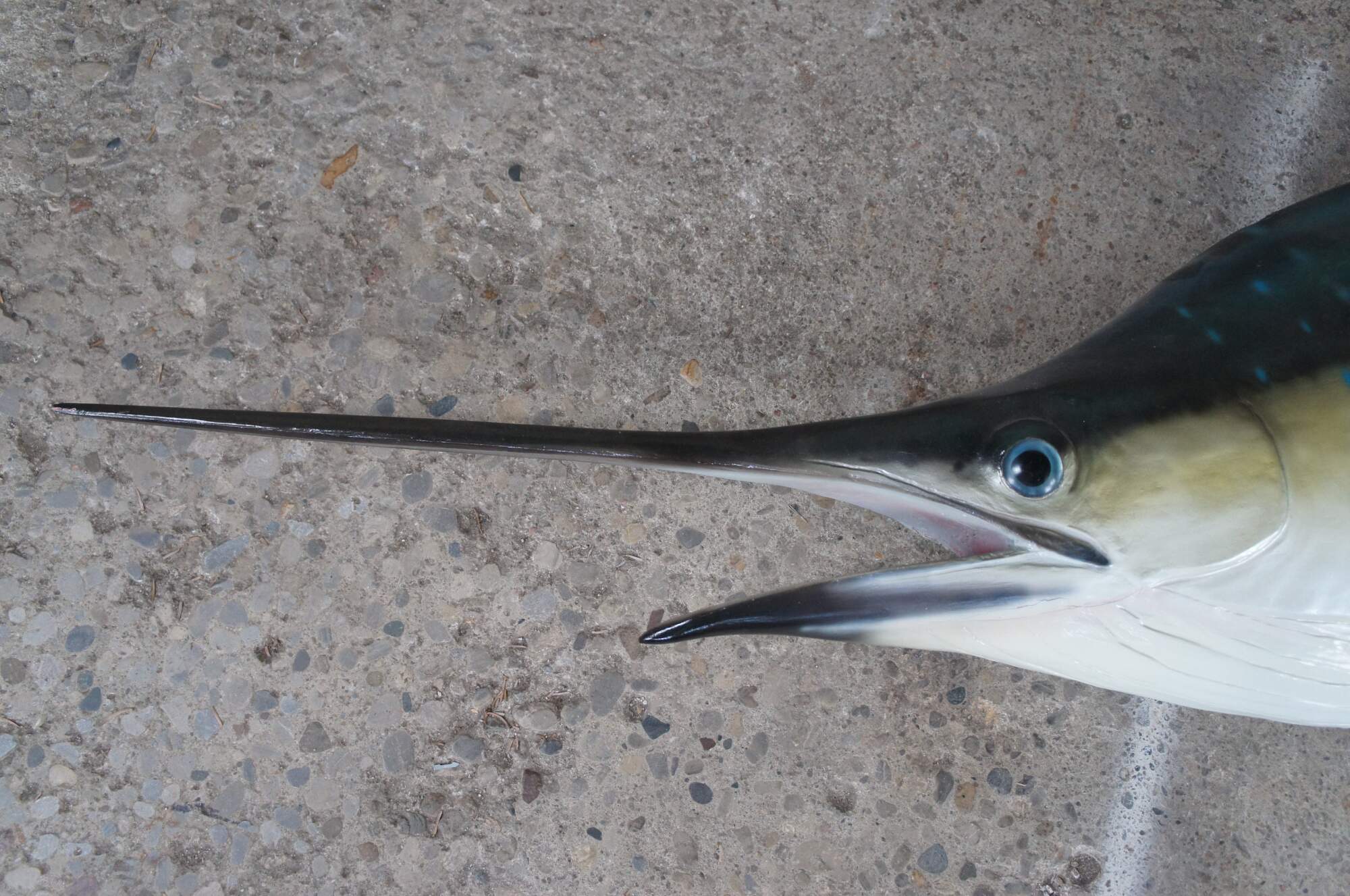 A vintage replica Marlin mount. Made from wood with hand painted details. Mounts via horshoe shaped hook along the back