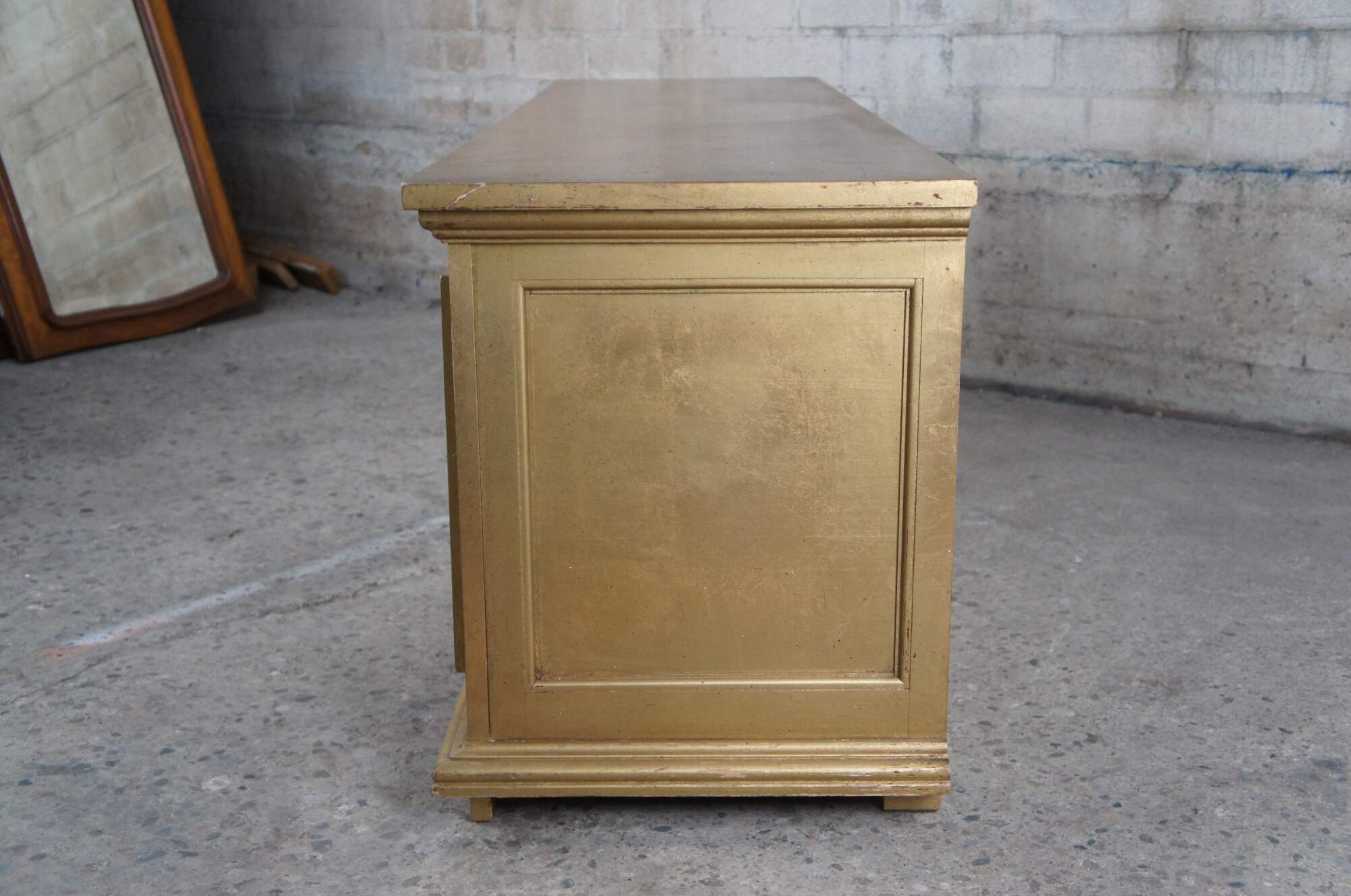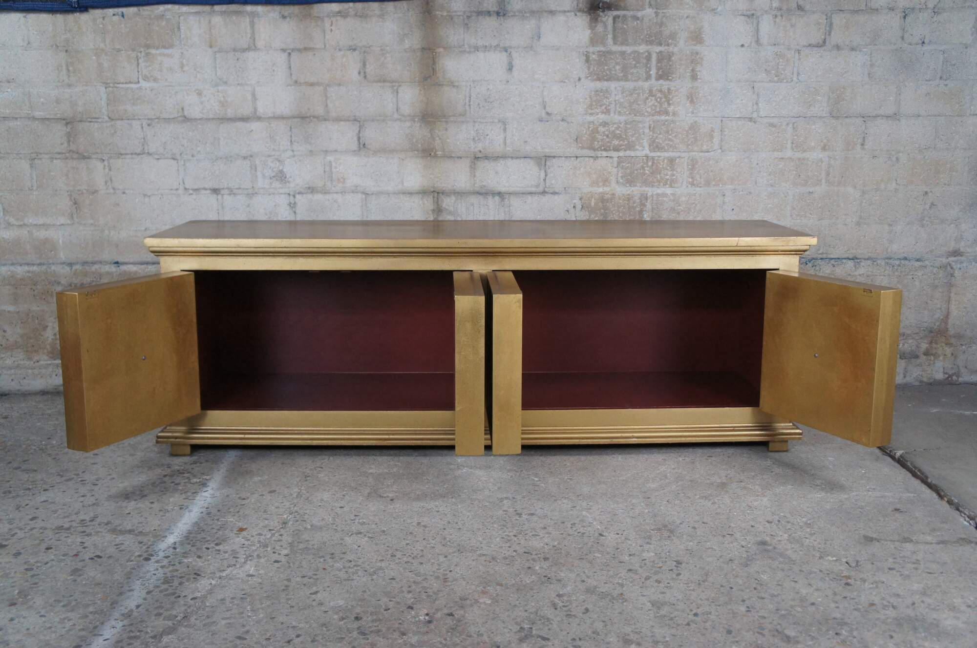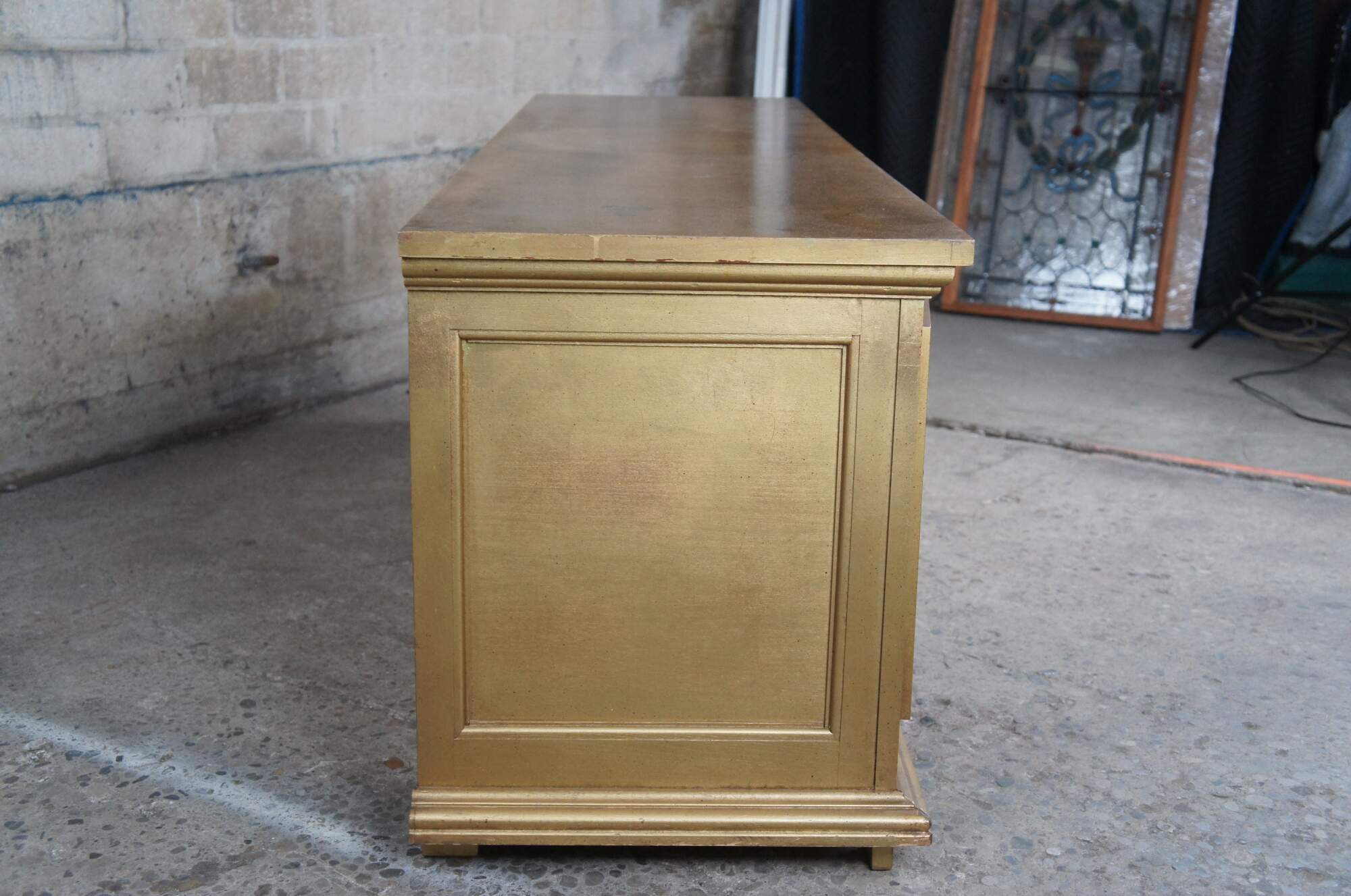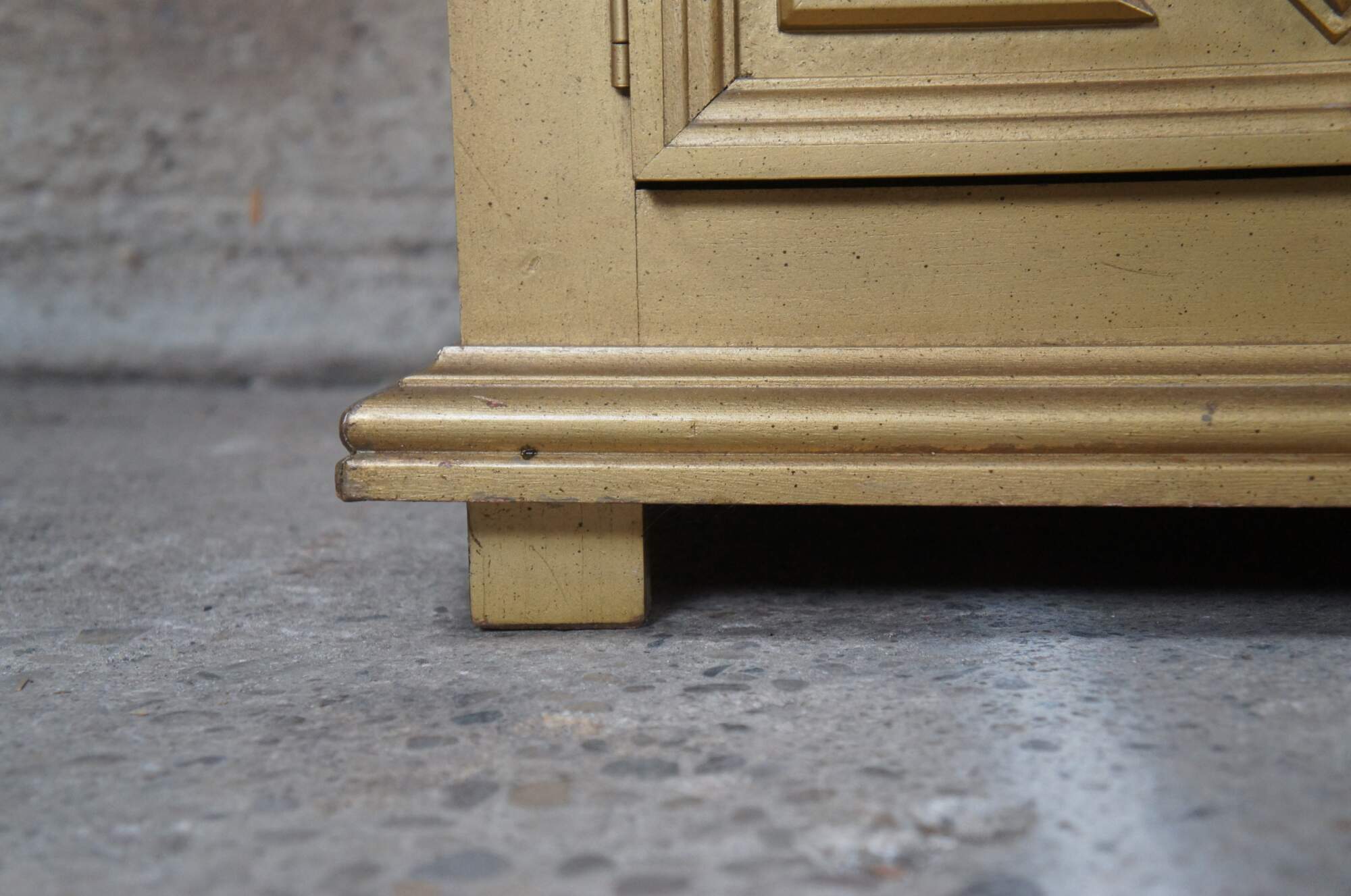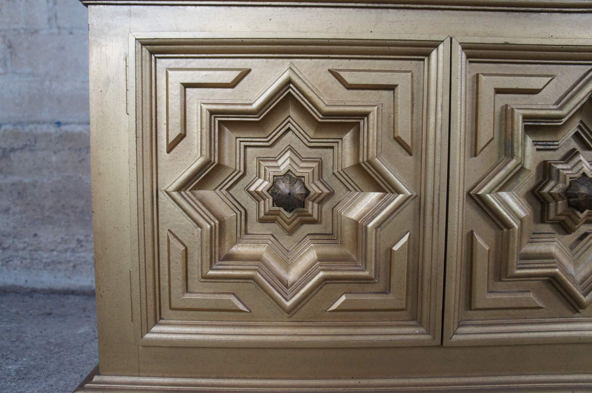 An elegant lowboy coffer cabinet or credenza by Lane Altavista, circa 1967. Made in plant number 2 on February 11th 1967, style no 1060. Features a rectangular frame with gold finish, Moroccan star sunburst cabinet doors and blocked feet. Great for use below a window or as a tv / record / media cabinet. Reminiscent of Spanish Colonial design.