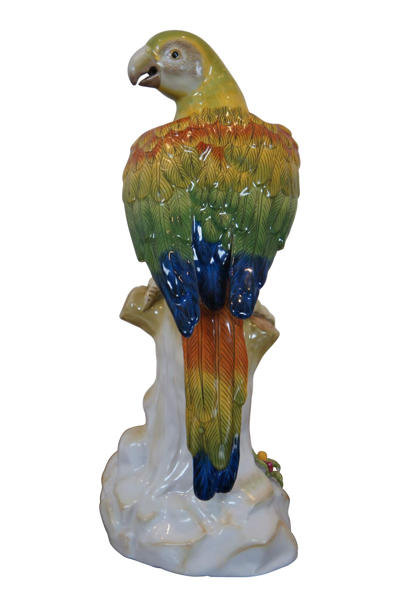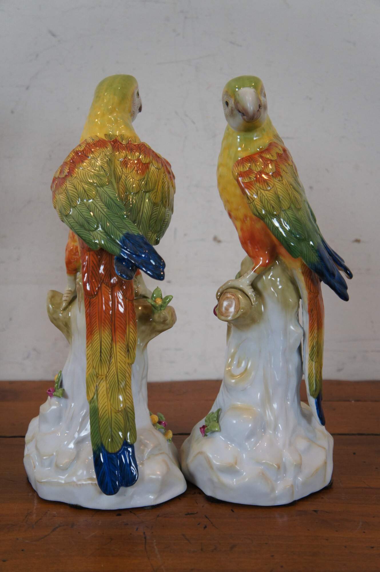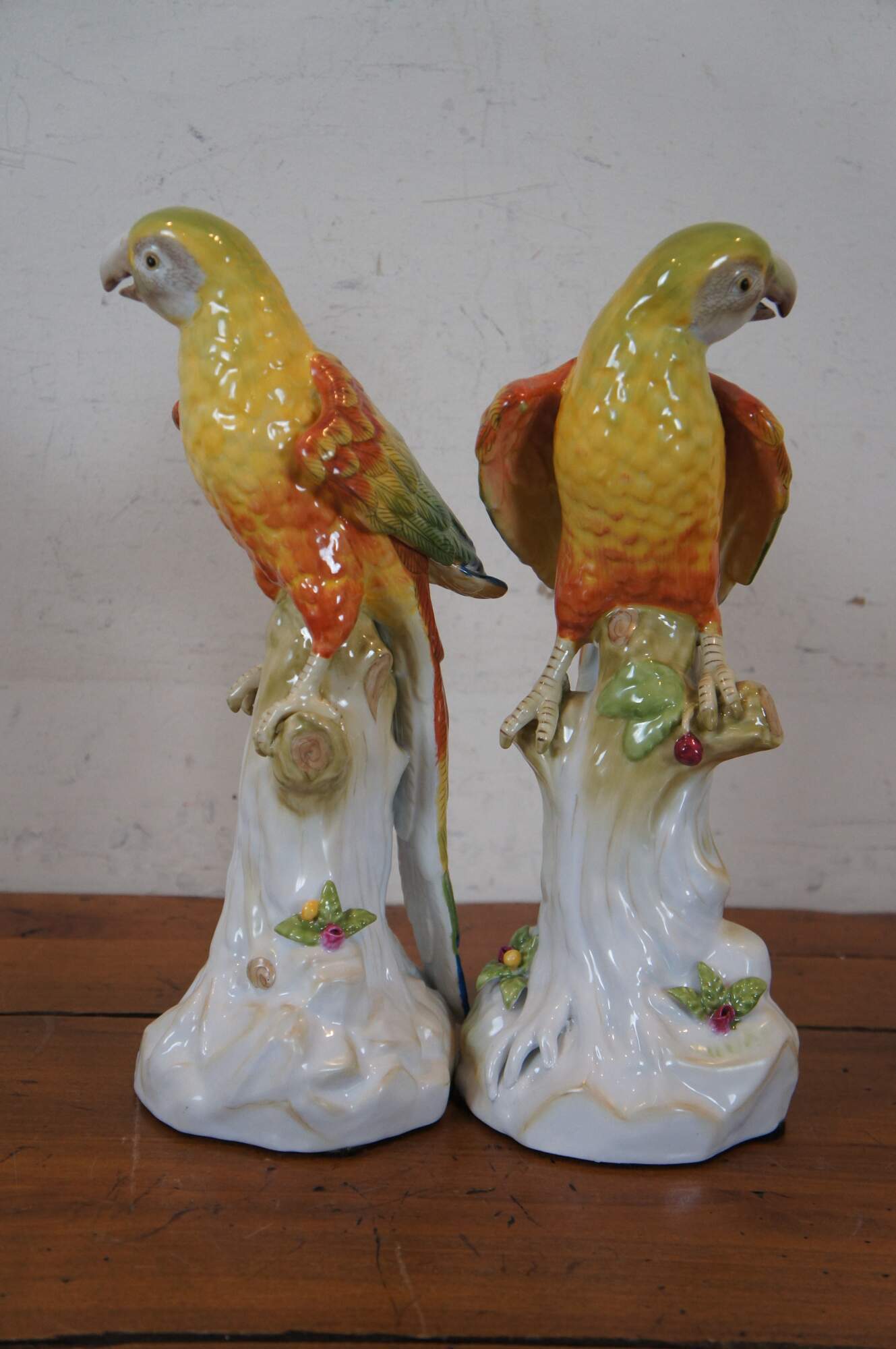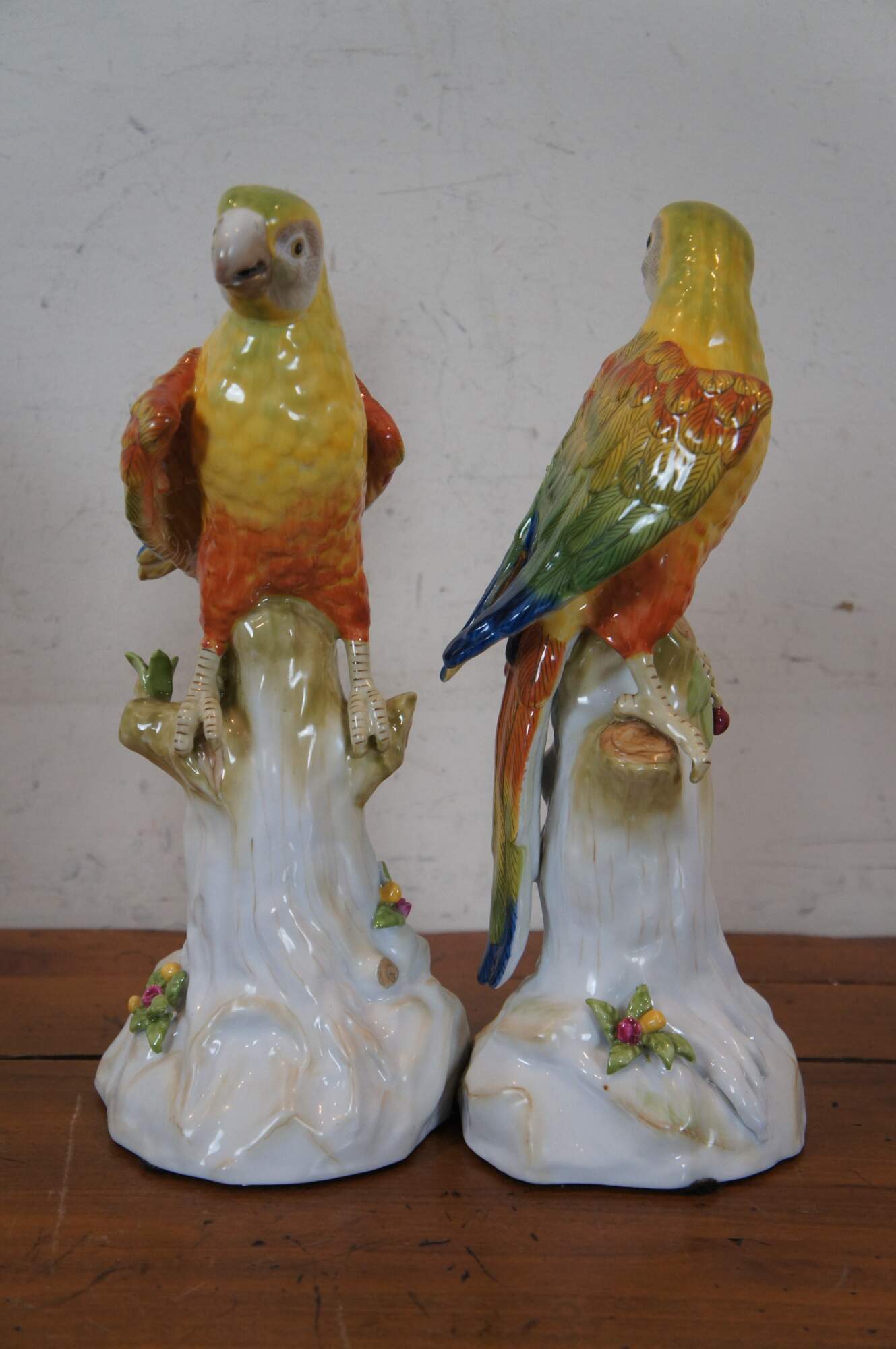Pair of vintage Chelsea House hand painted ceramic / porcelain figurines in the shape of yellow, green, orange, and blue parrots perched on partially colored, white tree stumps studded with a few patches of leaves and flowers. Made in Italy.