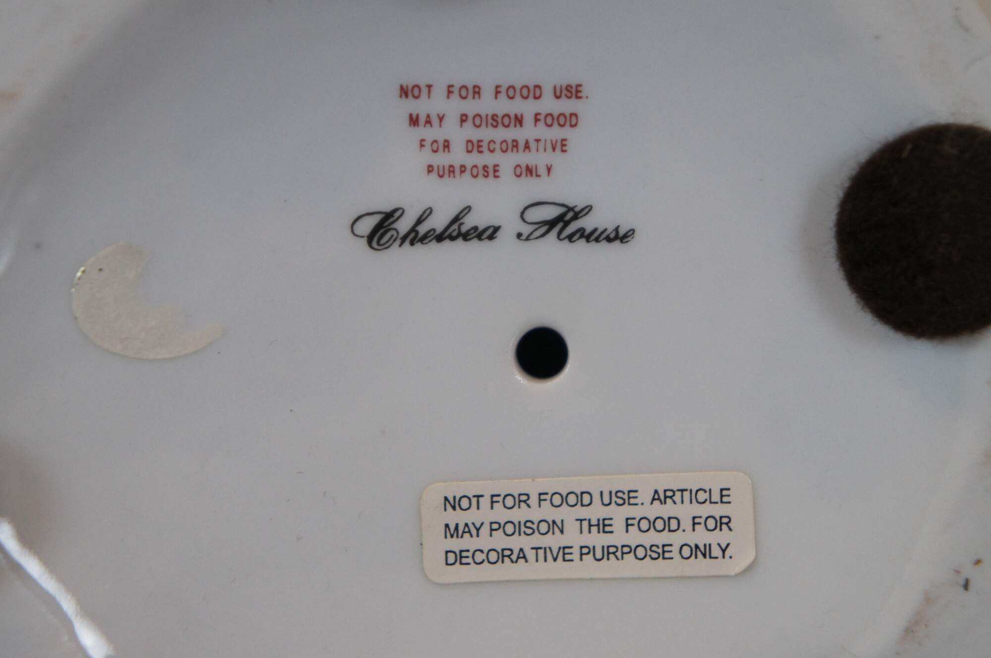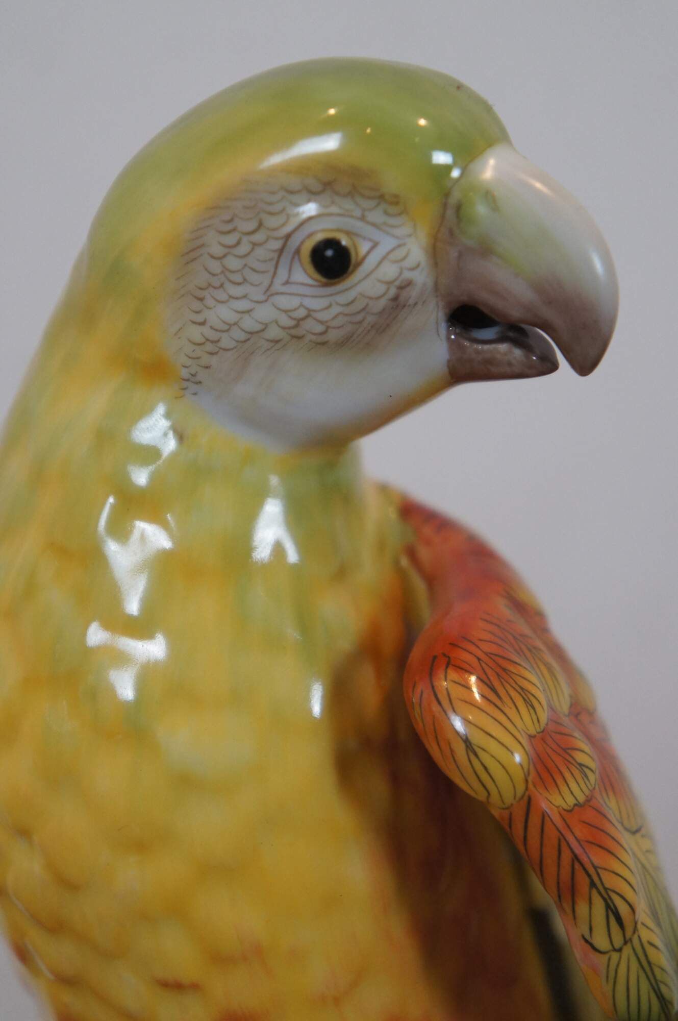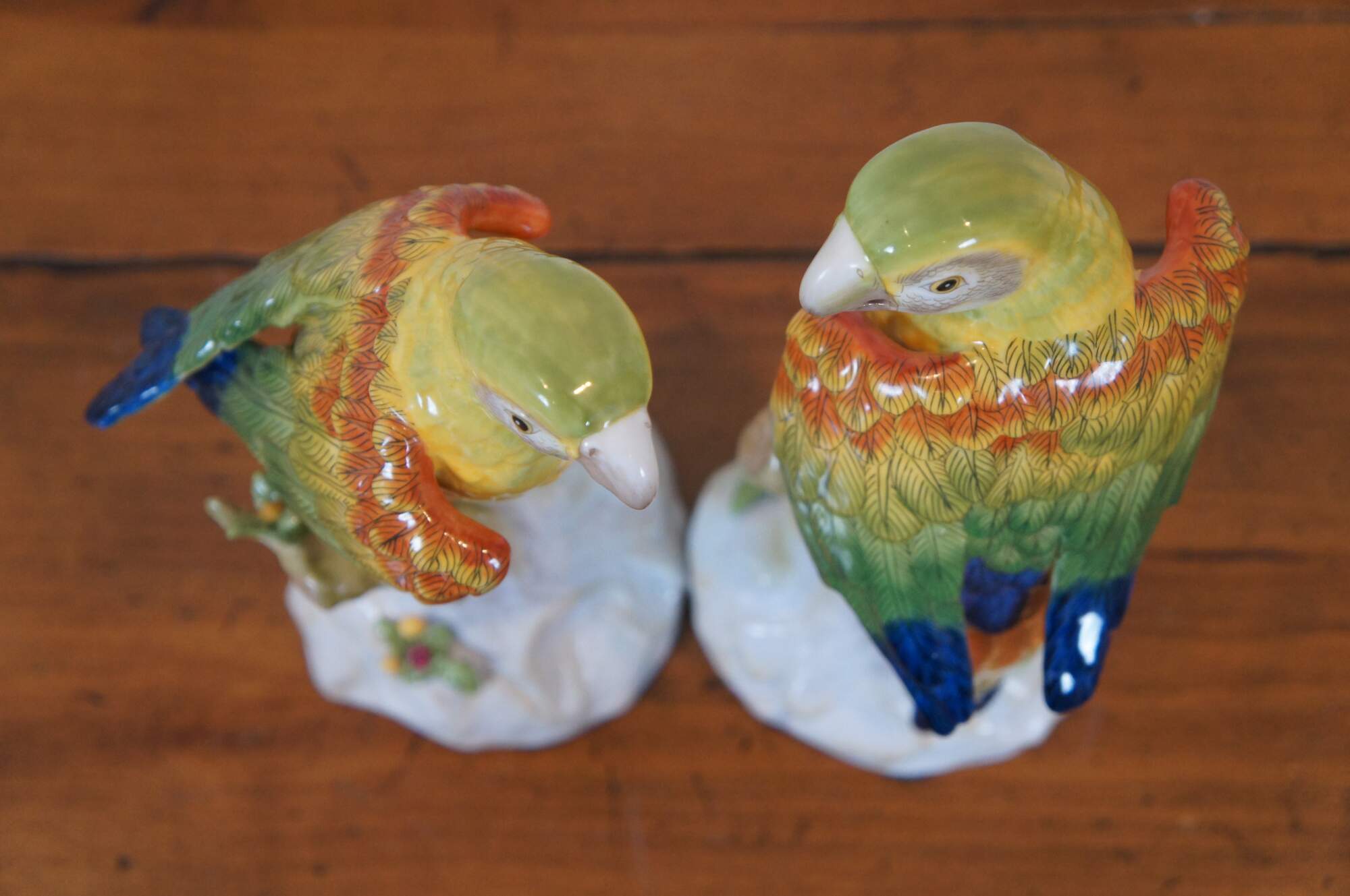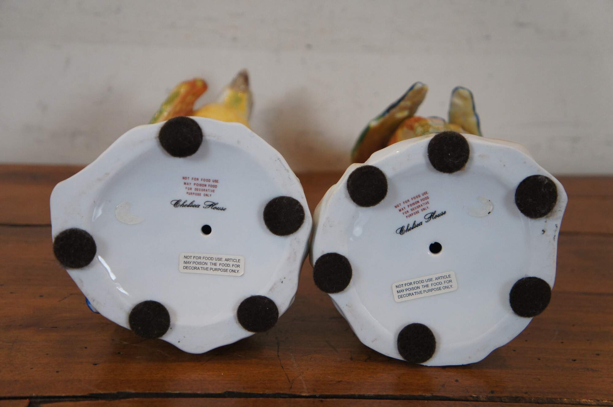 Pair of vintage Chelsea House hand painted ceramic / porcelain figurines in the shape of yellow, green, orange, and blue parrots perched on partially colored, white tree stumps studded with a few patches of leaves and flowers. Made in Italy.