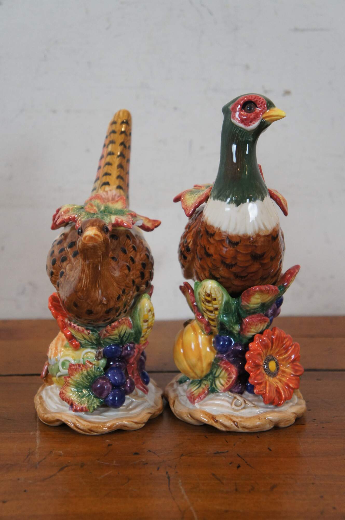 Pair of retired Fitz & Floyd Classics, Handcrafted, Autumn Bounty / Fall Harvest candlesticks / candle hodlers in the shape of male and female pheasants, perched on / surrounded by a variety of flowers, autumn leaves and fruits / vegetable associated with fall, harvest, and Thanksgiving.