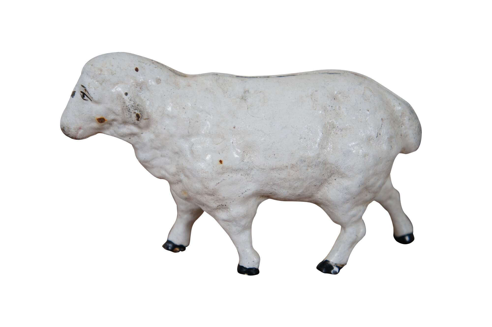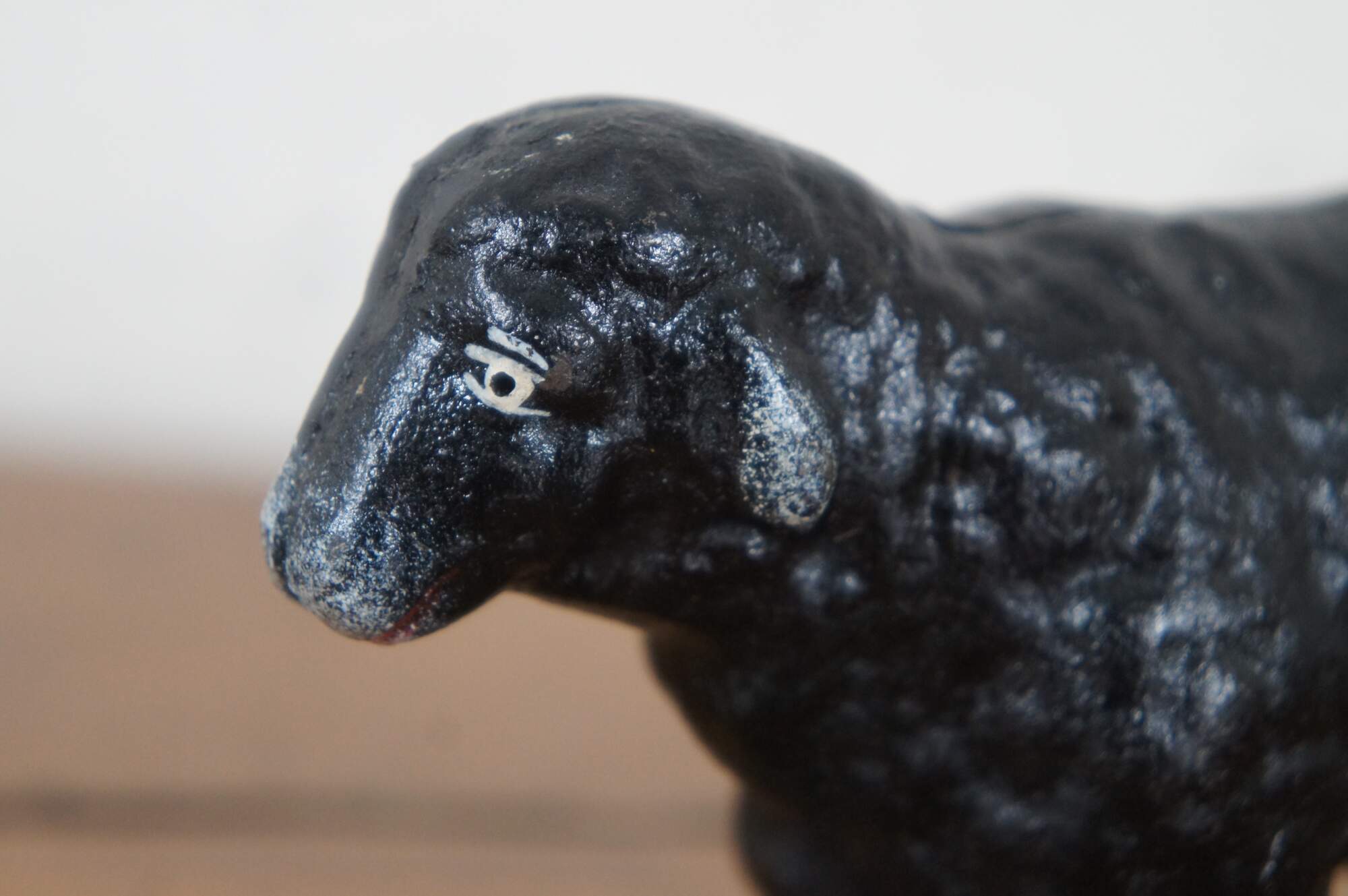 Lot of four antique cast iron still / coin banks in the shape of sheep / ewes. Three are painted white and one black, complete with facial features. Two part forms secured with a single flat head screw. Seams and screws painted over.