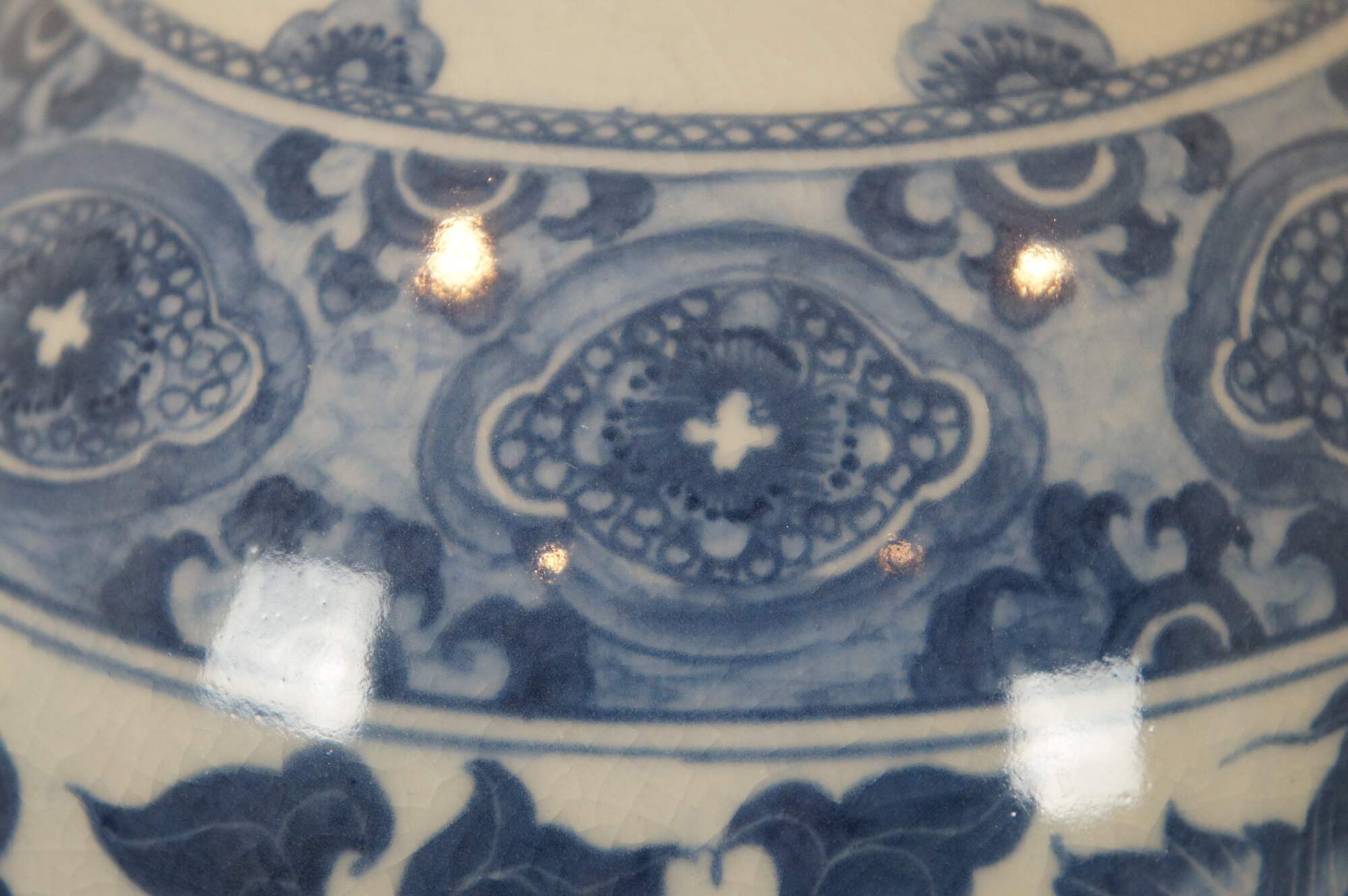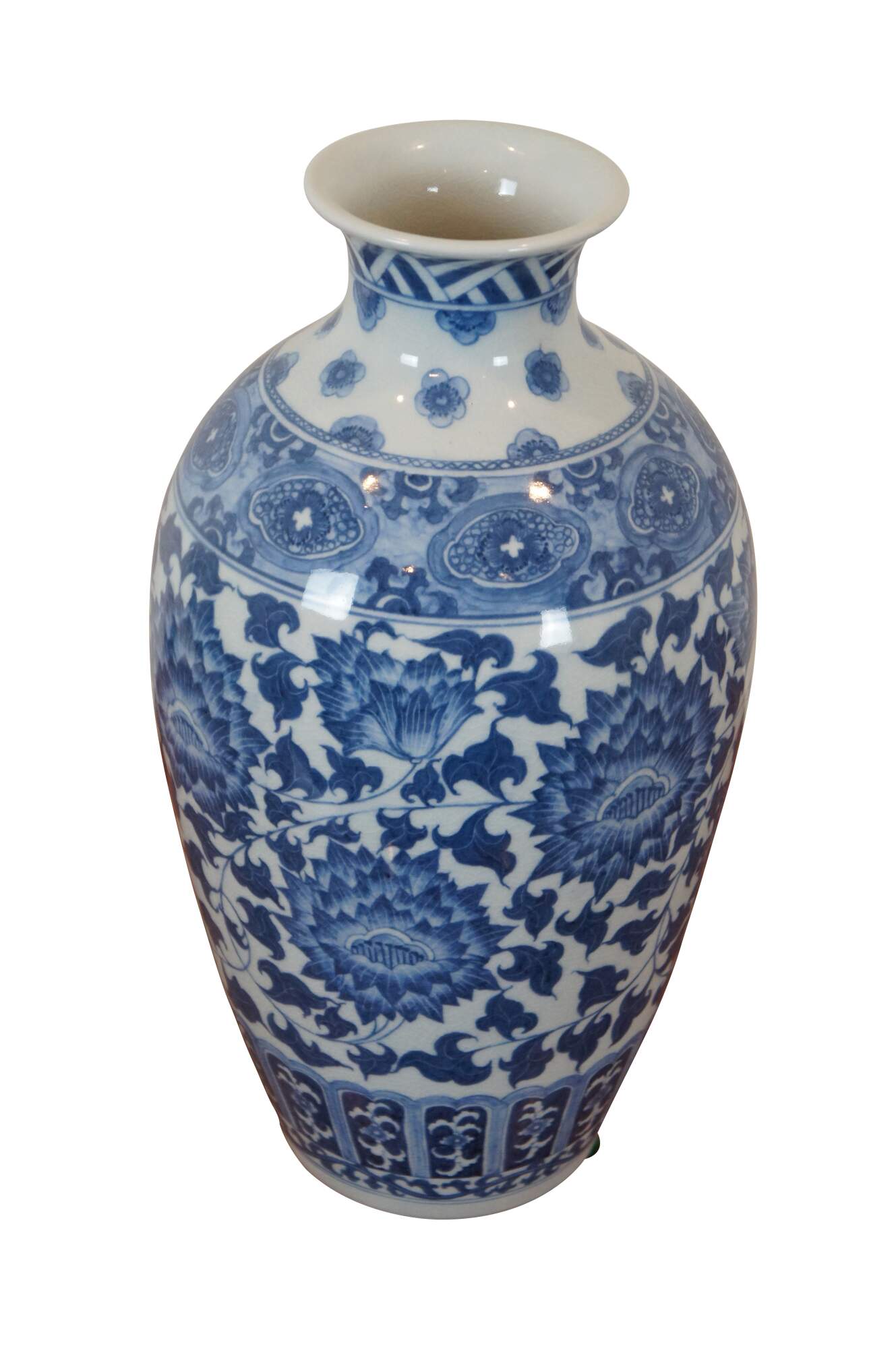 Vintage Maitland Smith chinoiserie / Chinese style vase featuring a floral pattern in blue and white with artistic crazing to the finish. Hand Made in Thailand. #2187-457.