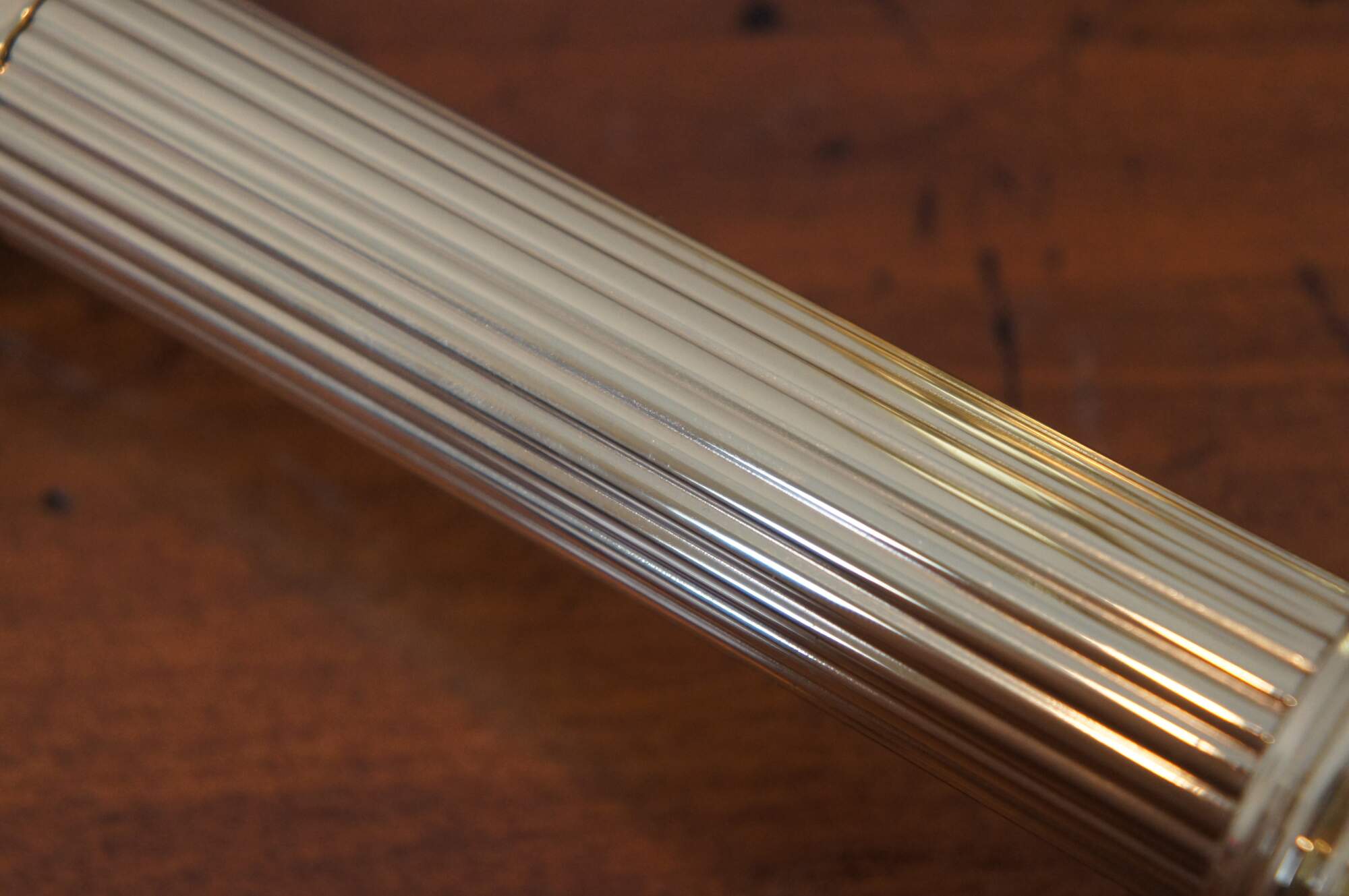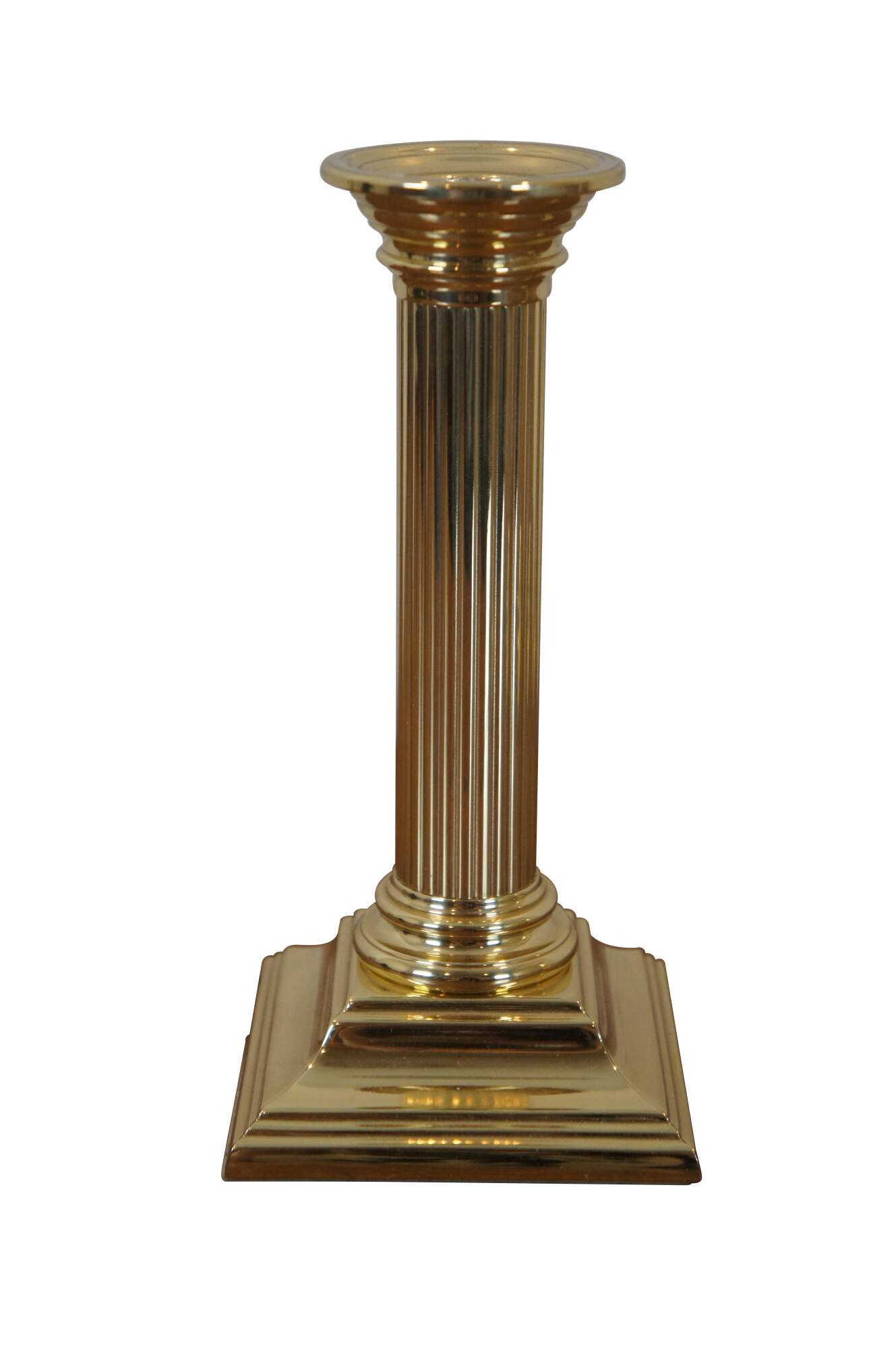 Pair of vintage bright brass candlesticks / taper candle holders in the shape of Neoclassical fluted columns with a tiered square base. Made for the Smithsonian Institution by Baldwin Brass.