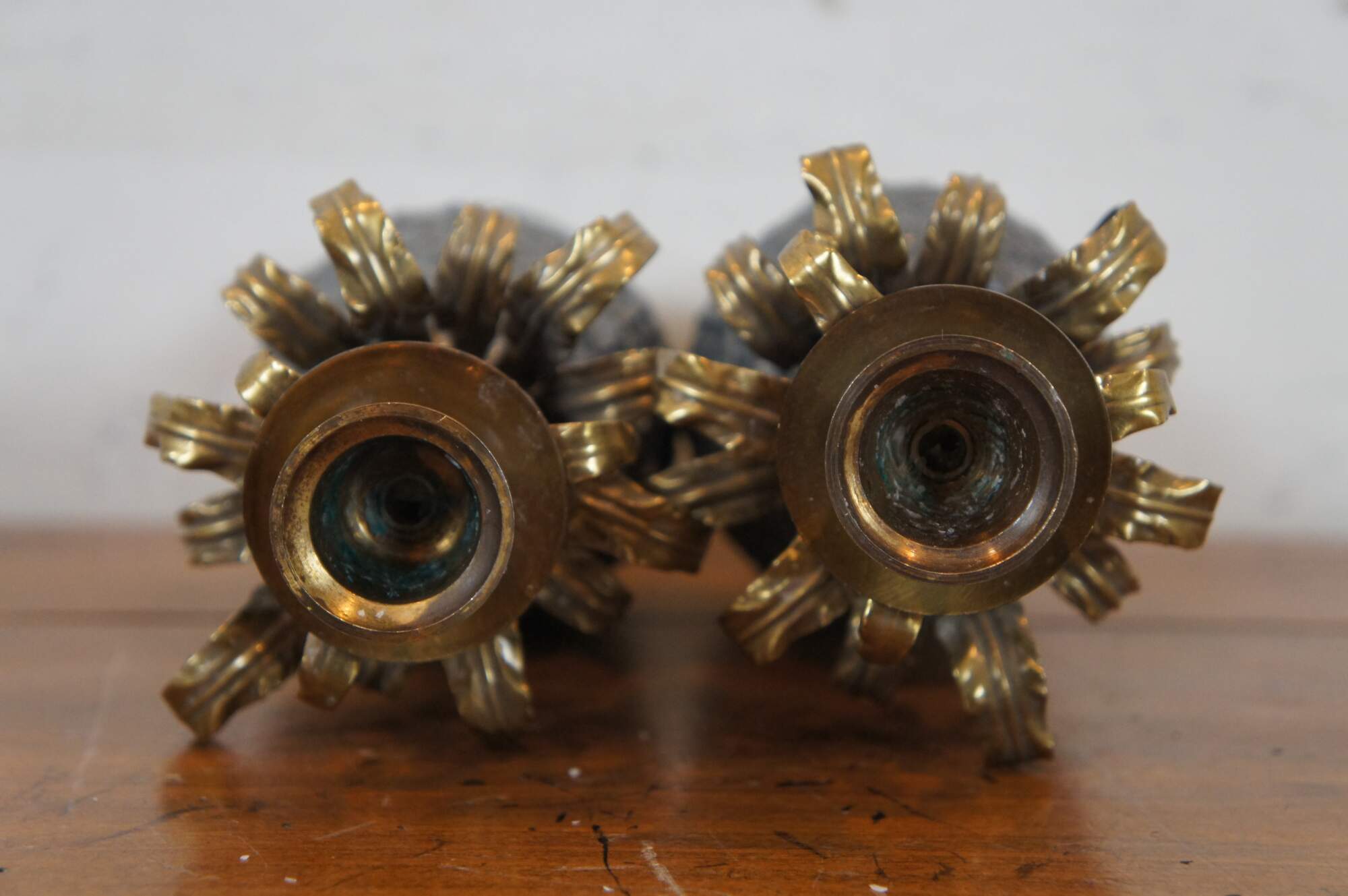Pair of vintage candlesticks / taper candle holders by Petite Choses, purchased at Wakefield-Scearce Galleries of Shelbyvillle, Kentucky. Round black marble bases supporting pewter and brass pineapples, topped with traditionally styled candle cups.