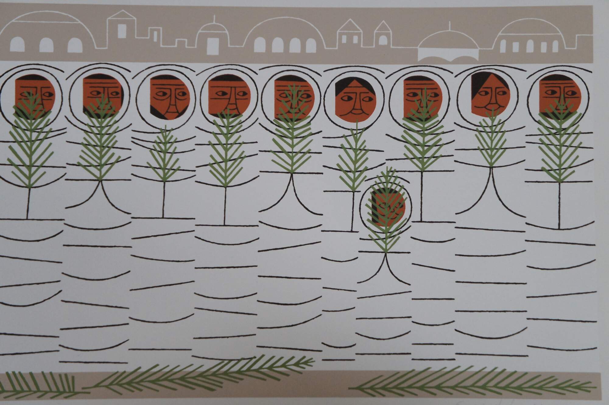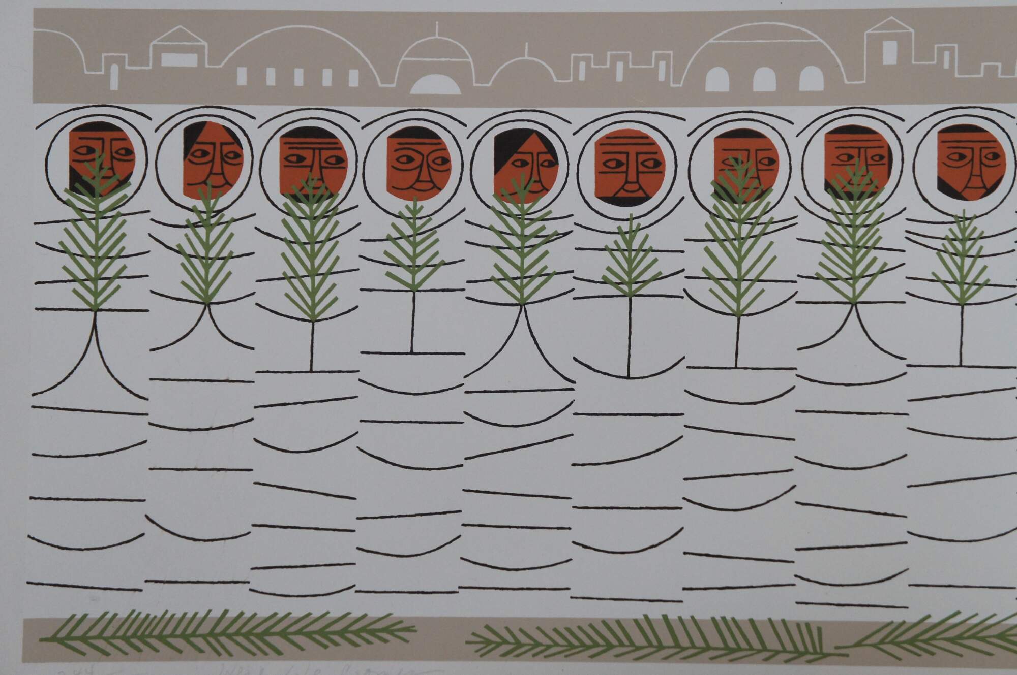 Vintage 1979 Serigraph print of Here He Comes by Edie Harper, showing the Biblical scene of a crowd of people laying palm branches in the road to welcome Jesus into Jerusalem. Pencil signed and numbered 244/750.