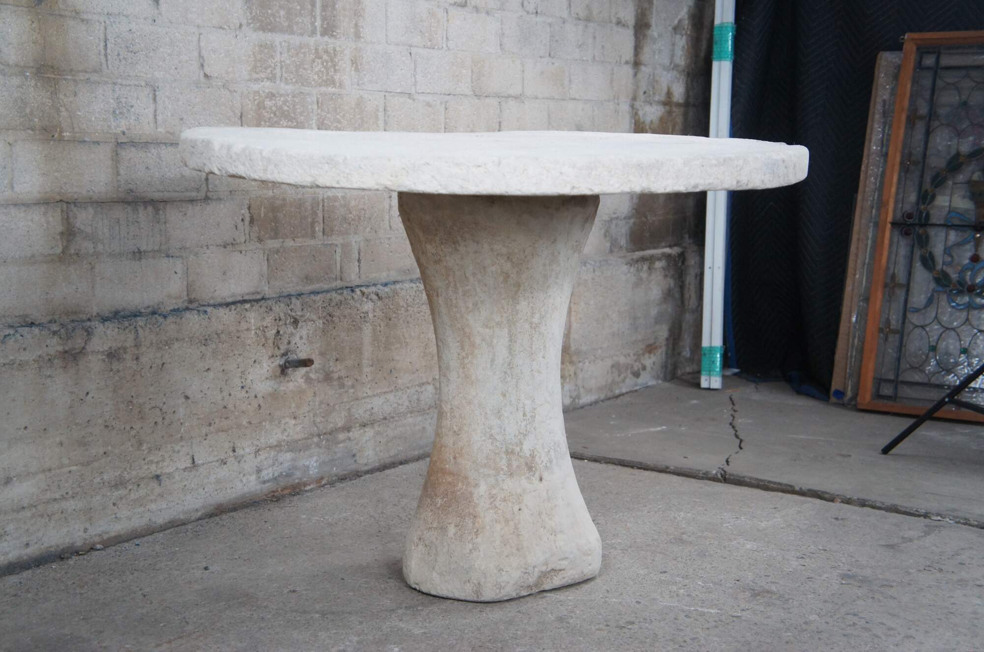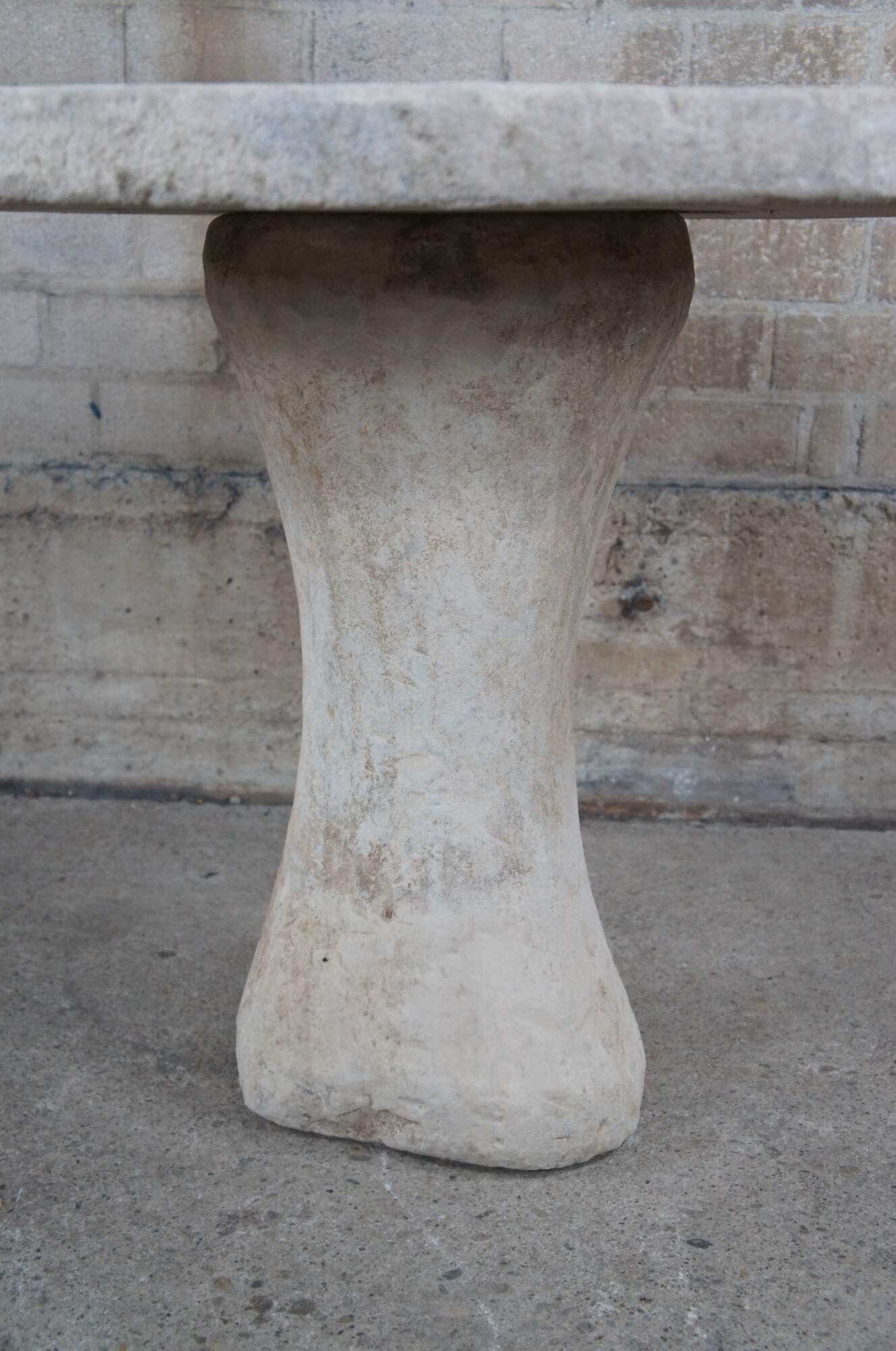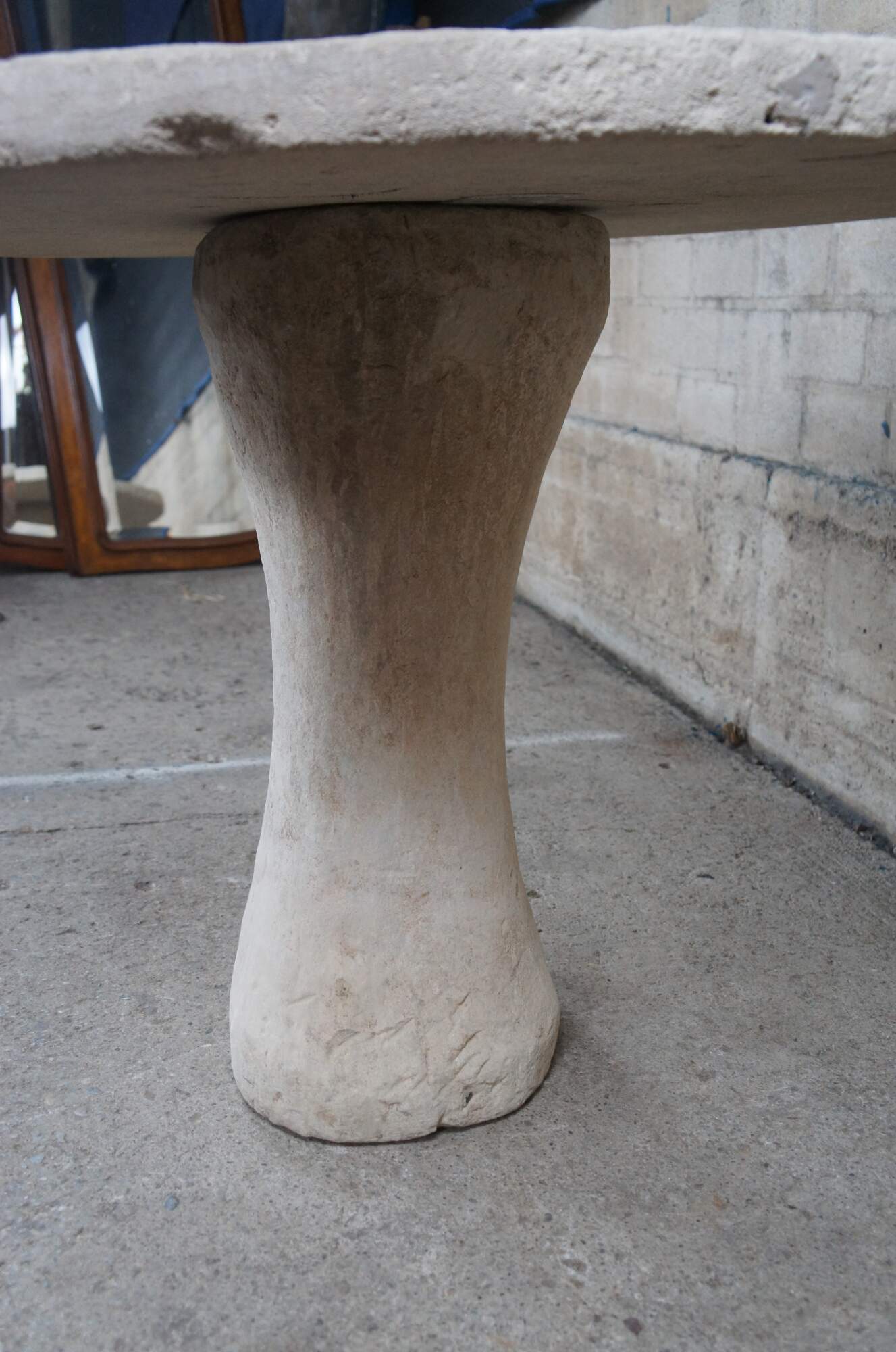 Vintage primitive style stone table featuring a pedestal base and round top. Very heavy, two pieces.