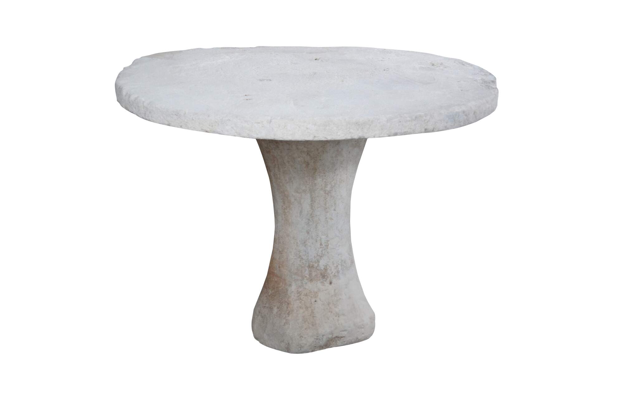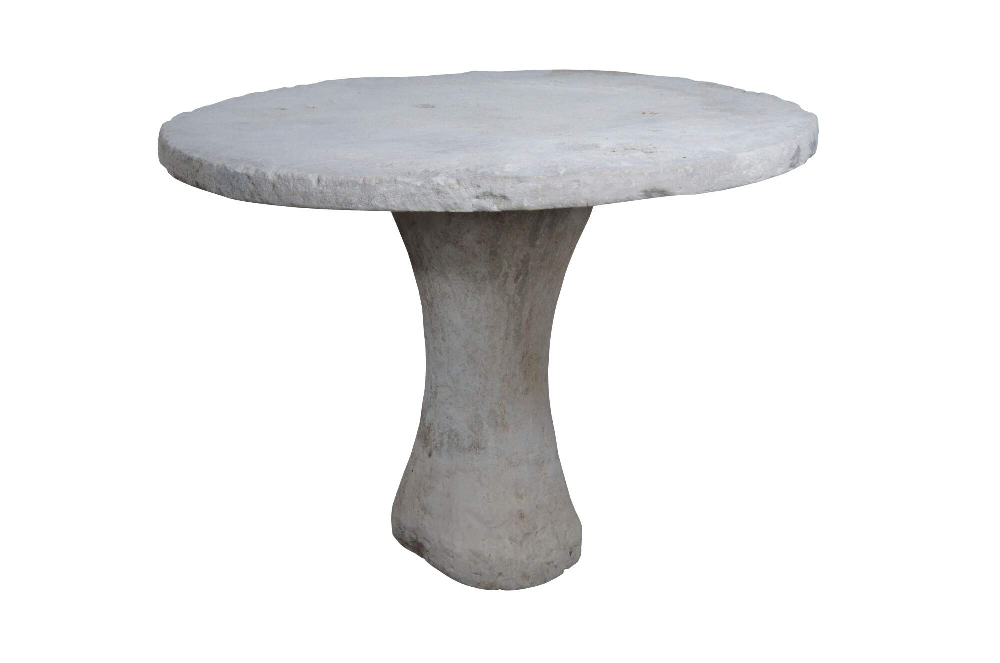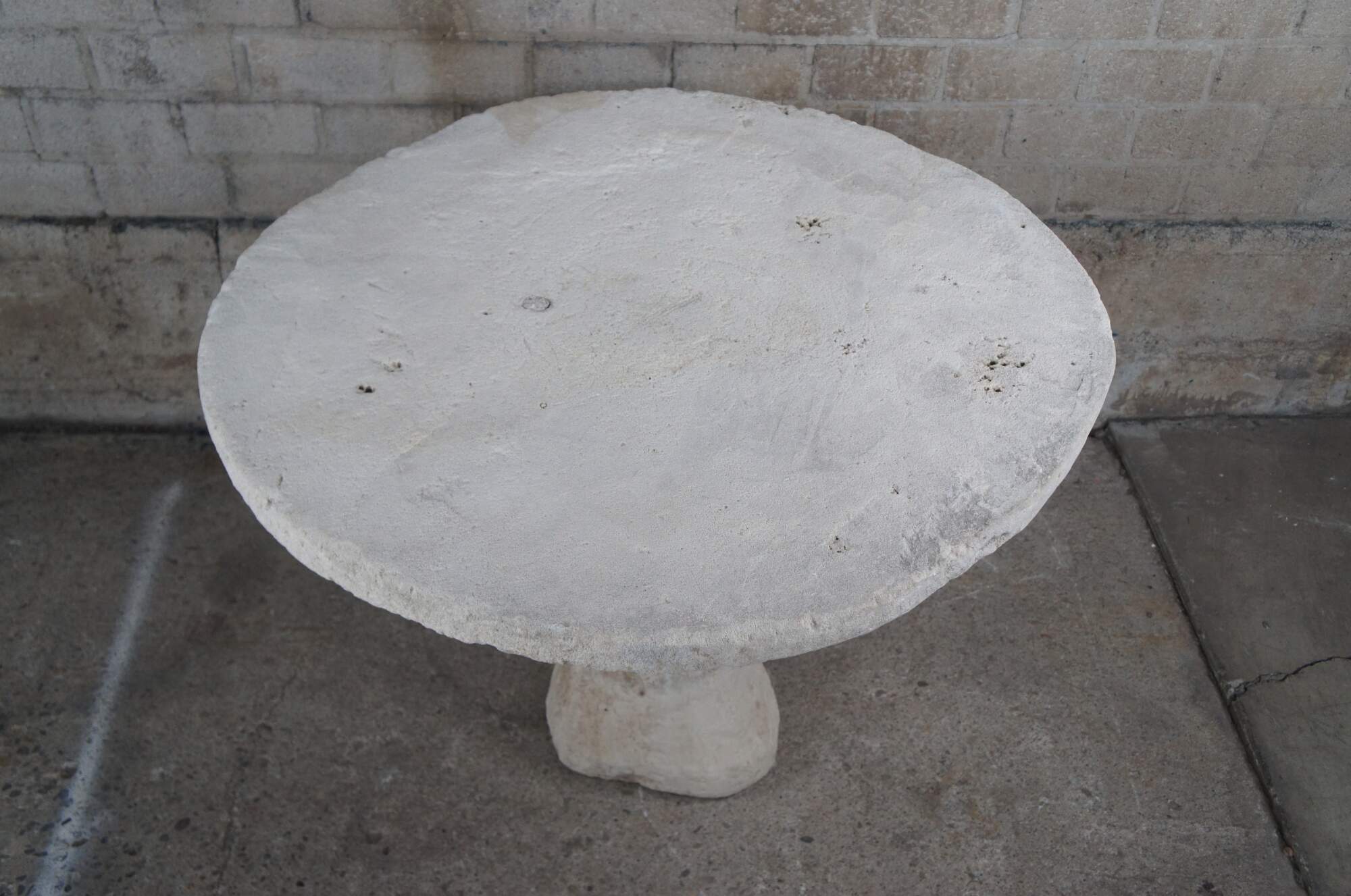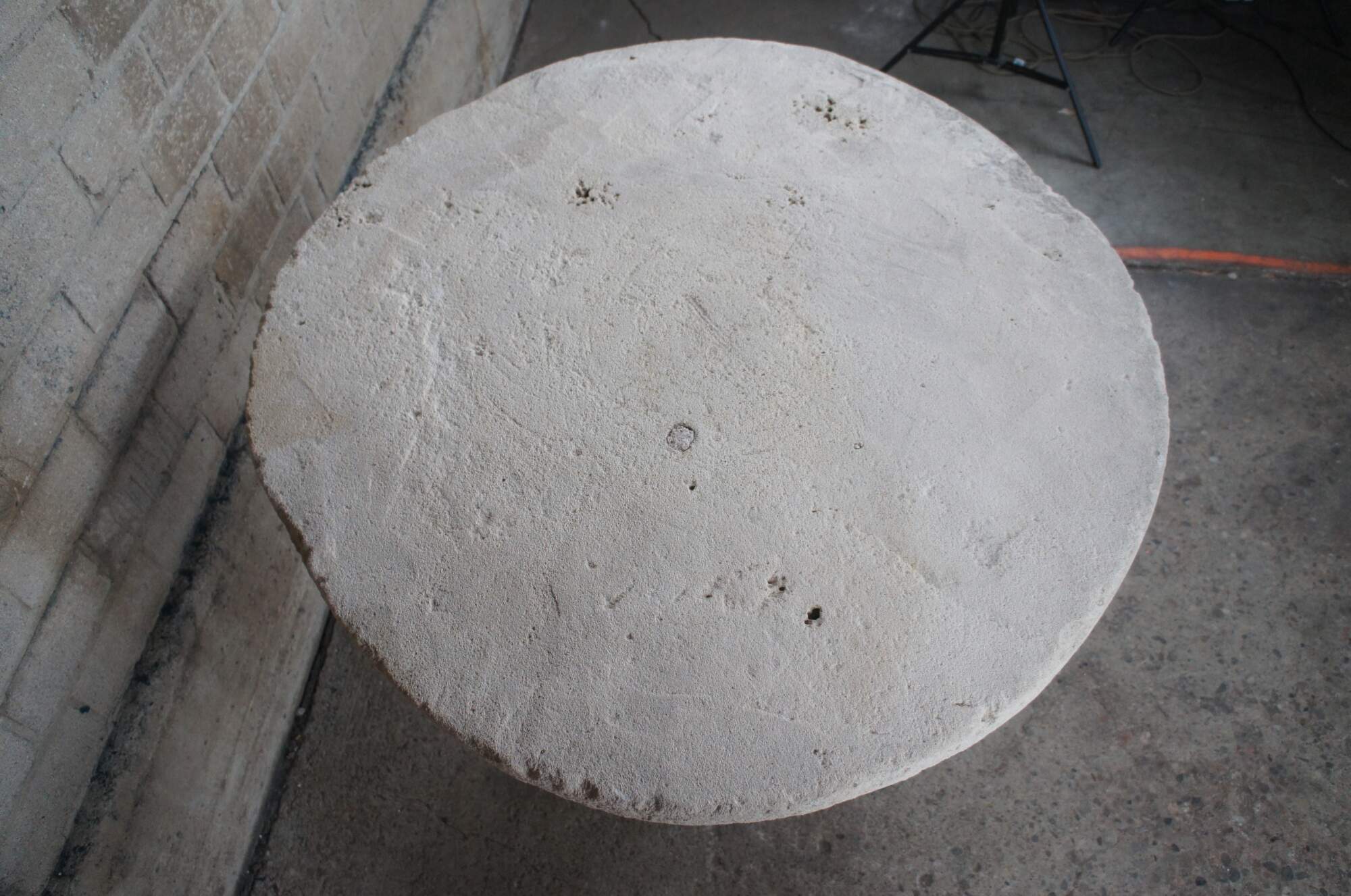 Vintage primitive style stone table featuring a pedestal base and round top. Very heavy, two pieces.