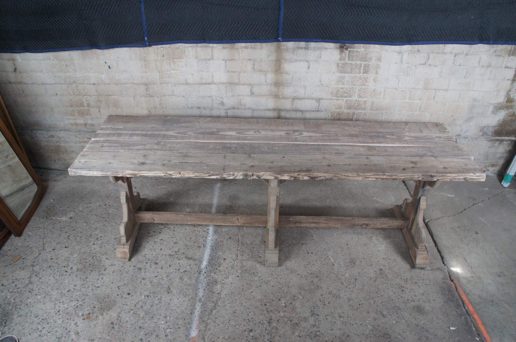 An impressive European refectory / dining table. Constructed from antique pine. Features a rustic patina with a three board top over trestle base.