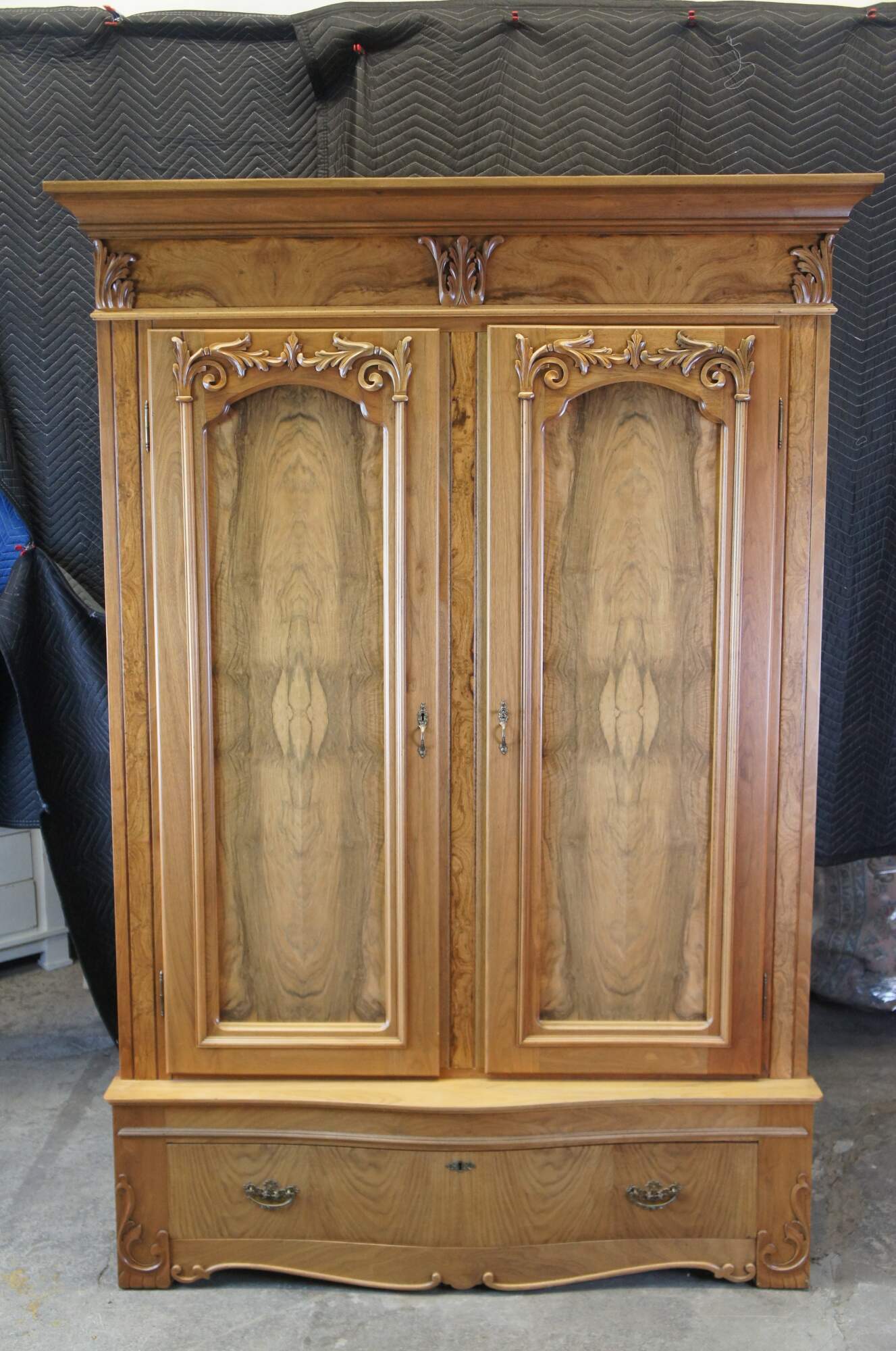 Impressive Late Victorian knockdown armoire. Made from walnut with a matchbook veneer burled front over an oxbow base with large dovetailed drawer. The interior opens to three shelves along the left and a hanging bar for garmants to the right. Features carved acanthus and scrolled accents, ornate brass hardware and panelled siding.