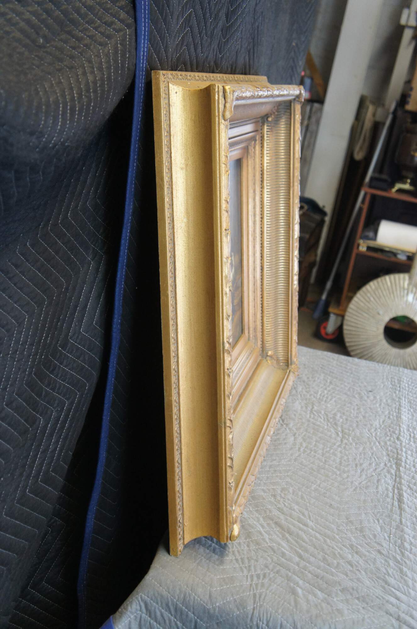 A lovely 20th century painting of Rabbits eating cabbage in a farmhouse setting. The oil painting is signed along the lower right side of the canvas by Nicolas. Features an ornately detailed French frame in tarnished gold.