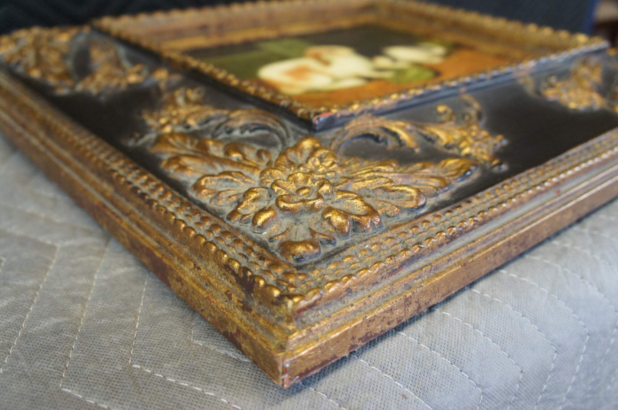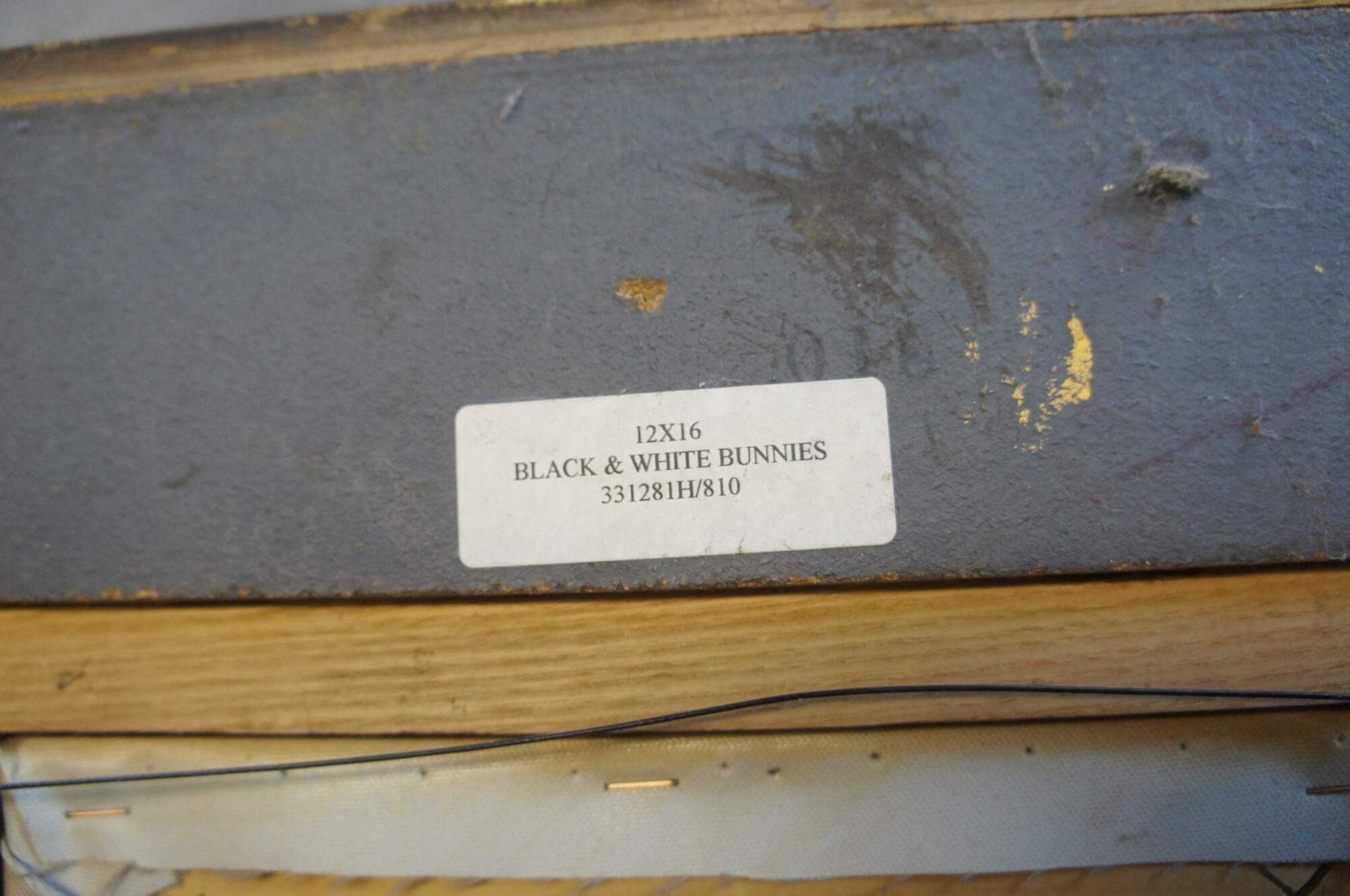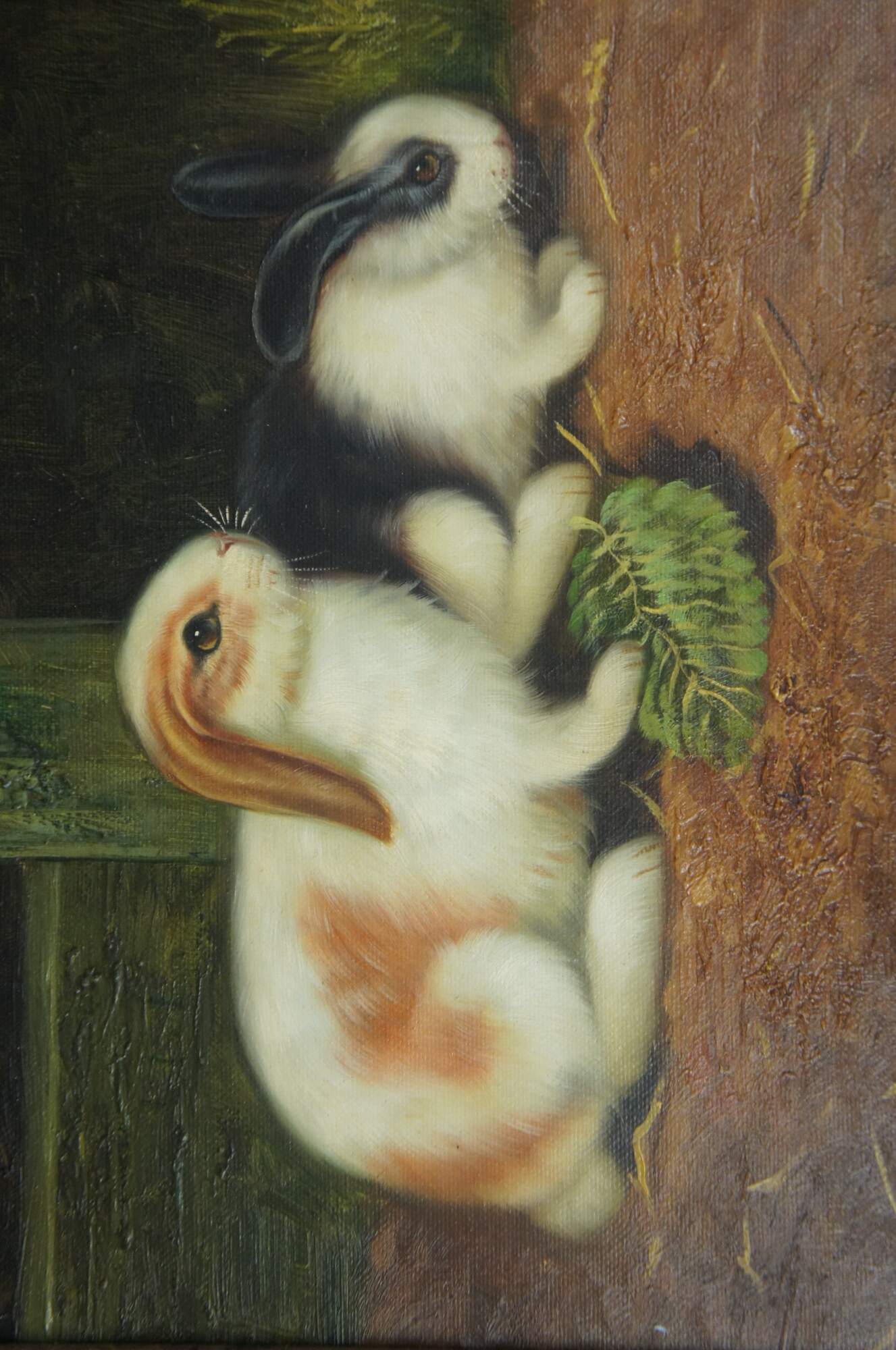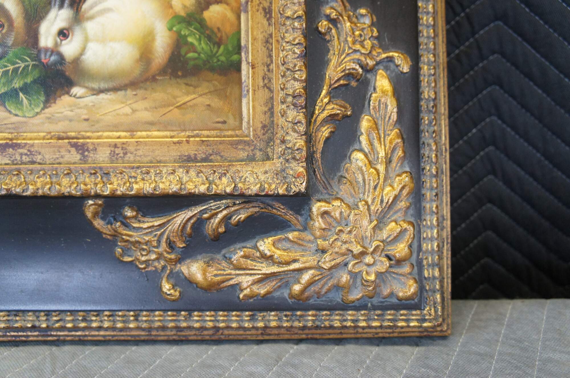 A fun pair of 20th century Rabbit oil paintings on canvas. The bunnies are eating cabbage in a farmhouse setting. Features an ornate black and gold frames.