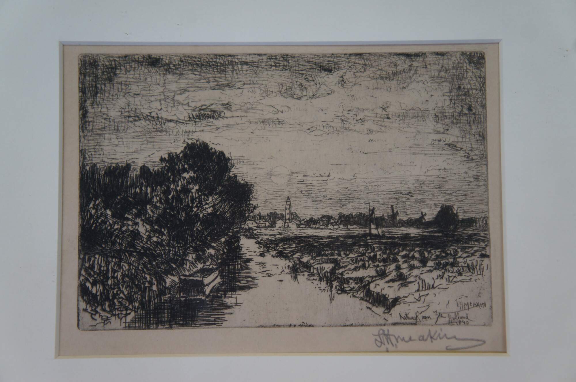 Born in Newcastle, England on 12 July 1850, Meakin enrolled in the McMicken School of Design at the University of Cincinnati under the watchful eye of Thomas S. Noble. Urged on by the recommendations of the Cincinnati art community to study in Munich, Meakin followed that advice and celebrated his thirtieth birthday in Europe. Here among his Cincinnati painter-colleagues, Meakin worked diligently for four years under Professors Ludwig Loefftz, Nikolaus Gysis, and Karl Raupp. Painting in the plein air method and executing works in a variety of media, including etching, Meakin made frequent sojourns to picturesque spots such as Schließheim and Augsburg. He may have urged J. Frank Currier to take up etching (Weimer, 1940, p. 459).
