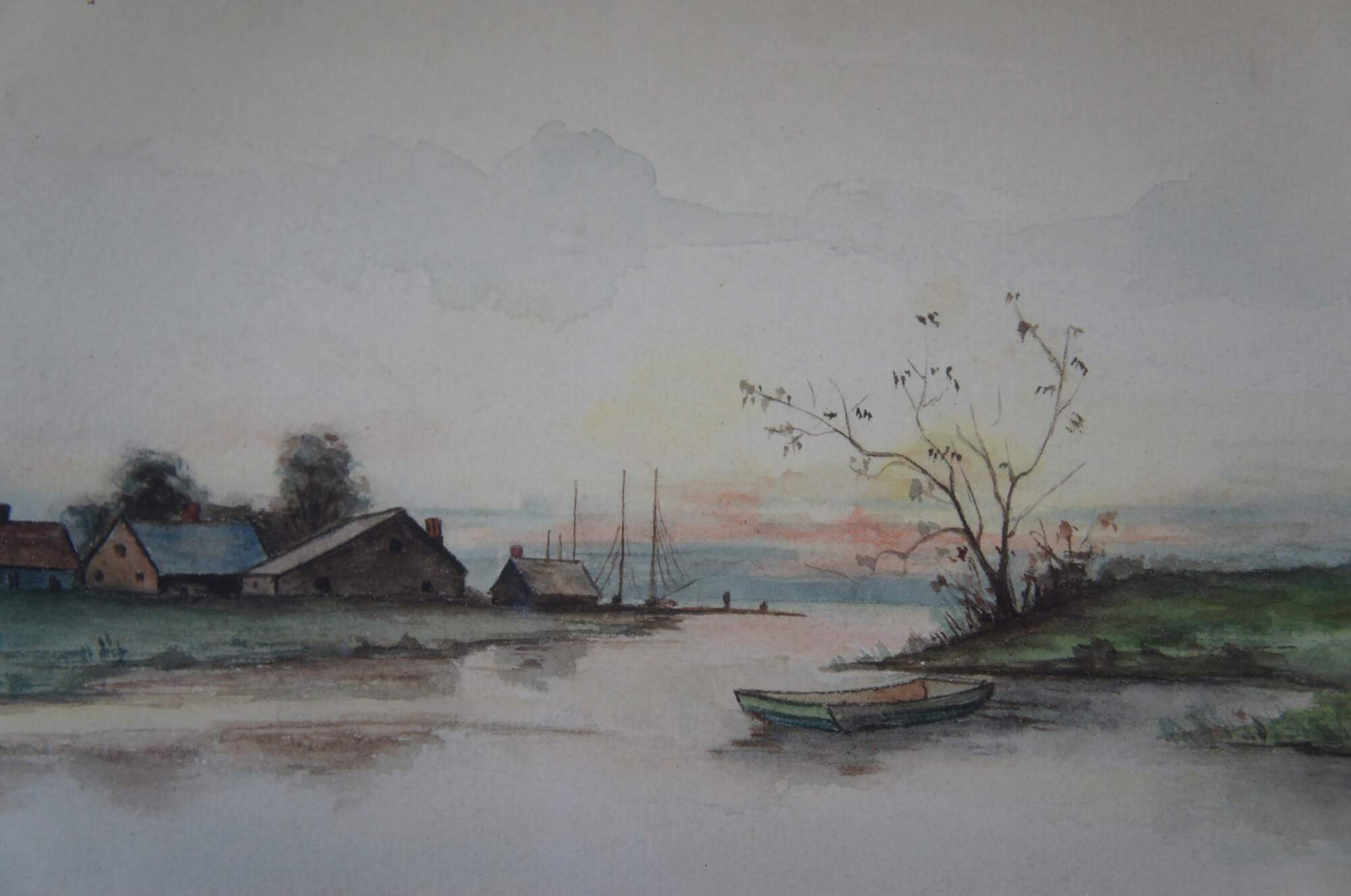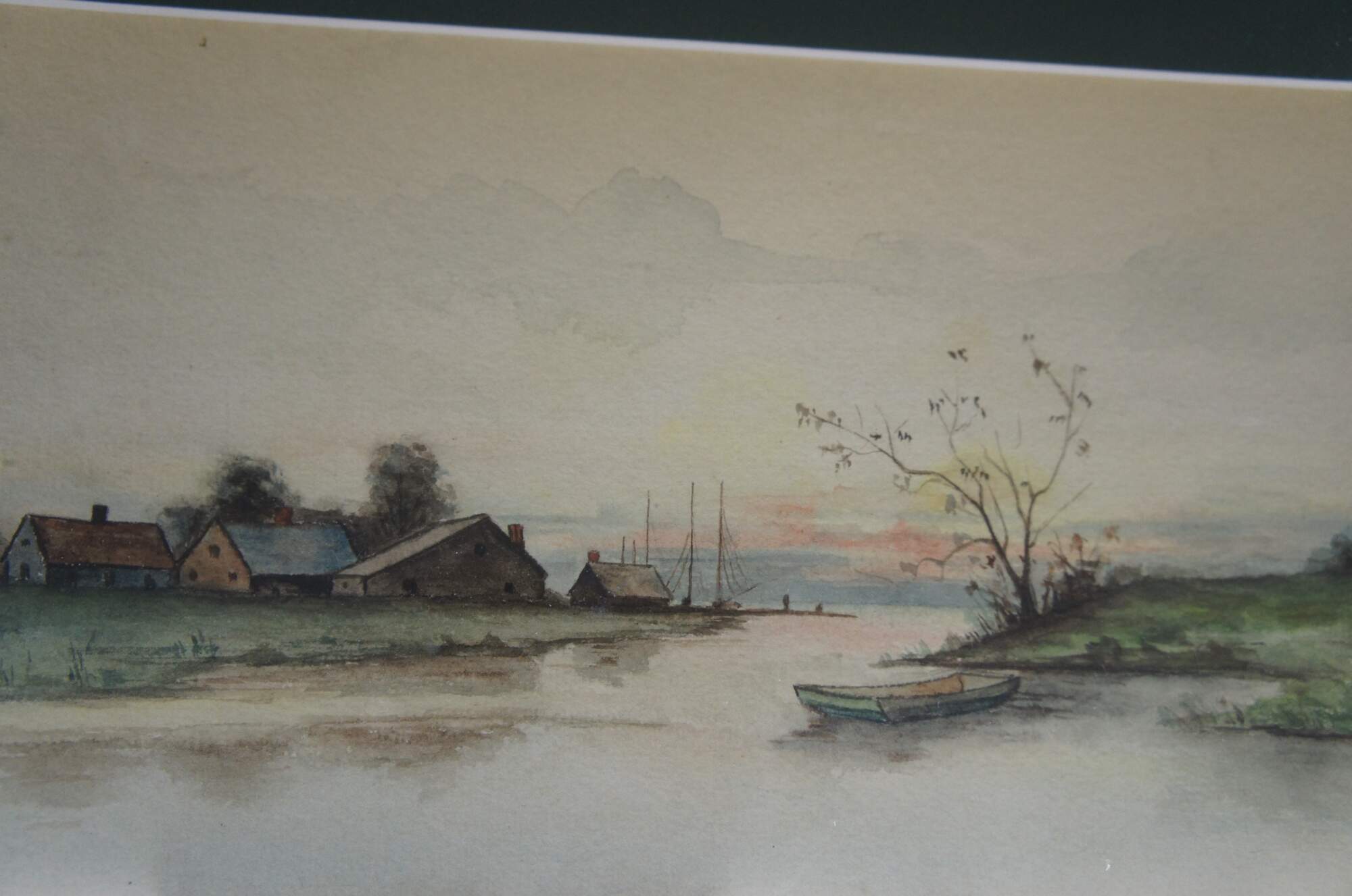 An early 20th century watercolor painting on paper, circa 1901. Signed Anna Mason along the lower left. Featuers a conturyside with farmhouses next to a body of water. In the foreground a boat can be seen poised by a tree. The watercolor is framed and matted.