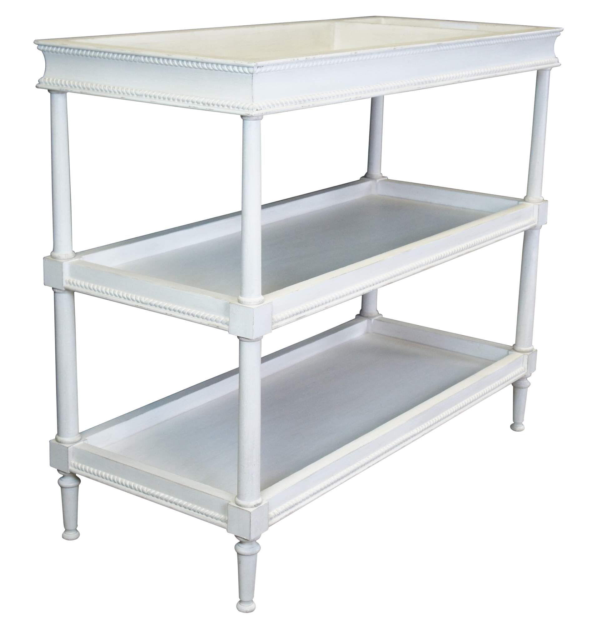 Finish is carefully distressed using a hand-applied multistep process designed to achieve the look of a timeworn antique