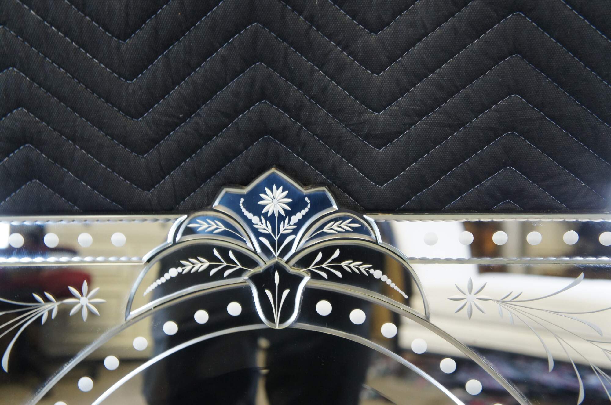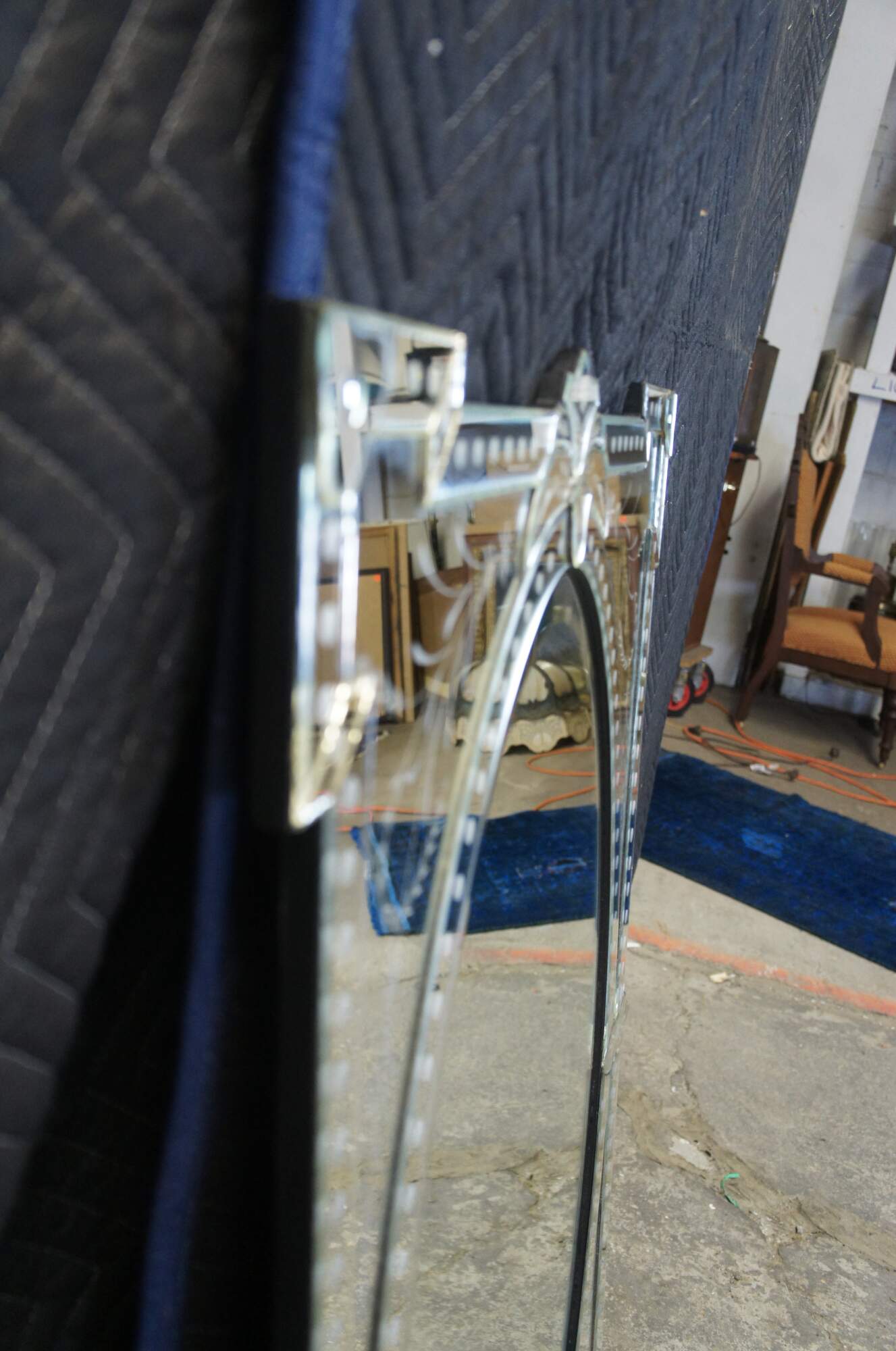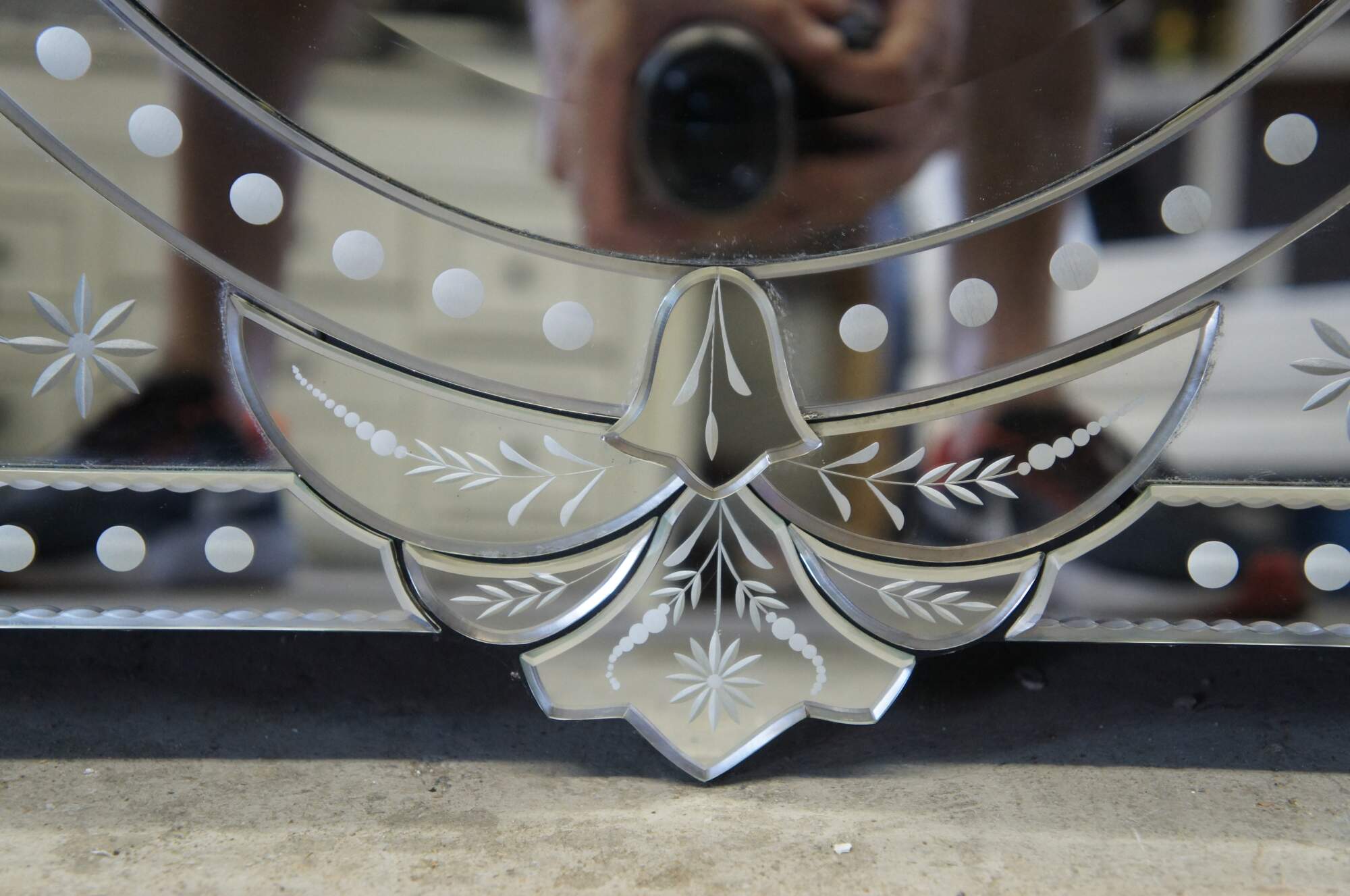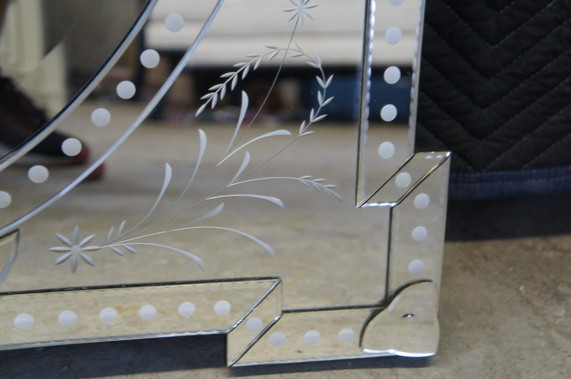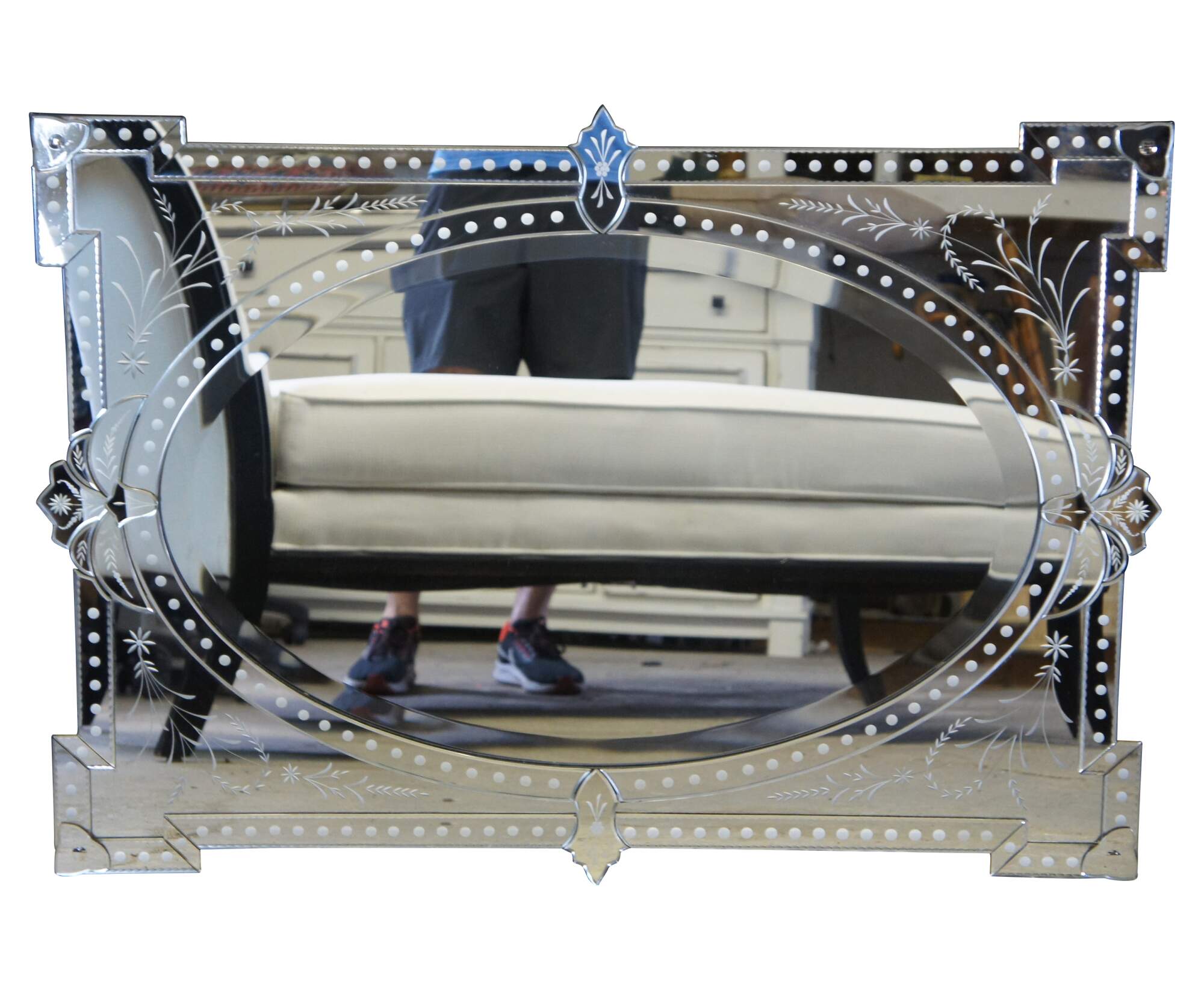 A lovely venetian wall hanging mirror. A rectangular form with oval interior and etched glass. A versatile mirror that can be hung horizontally or vertical.