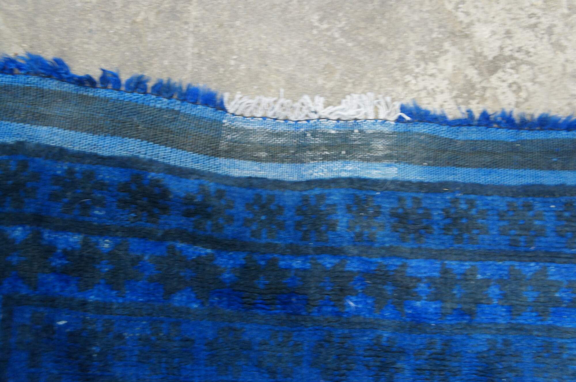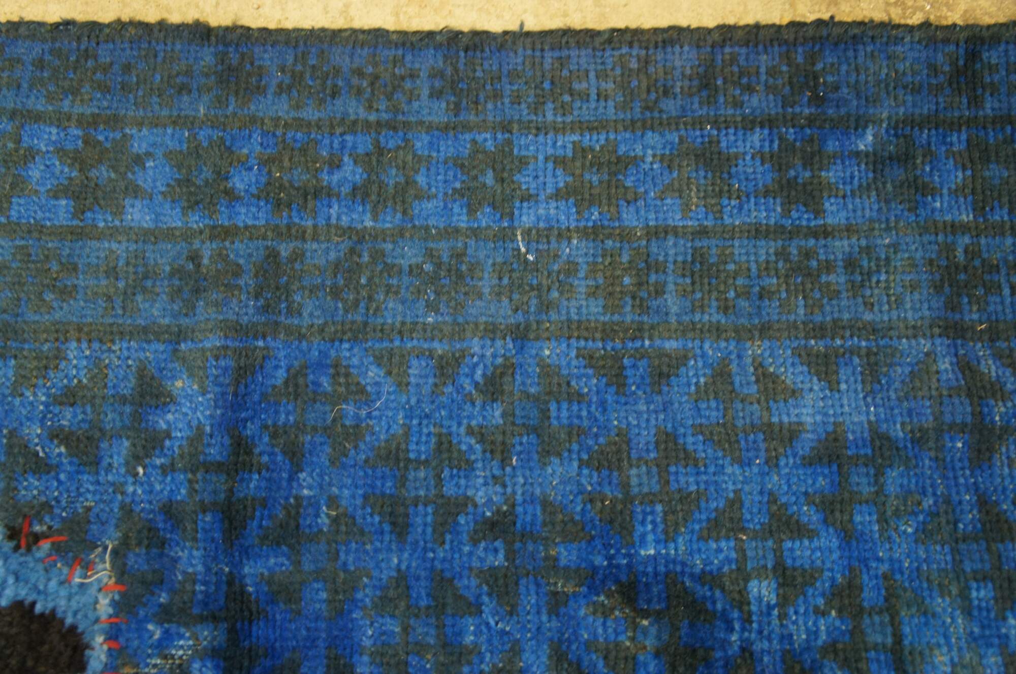 A lovely hand knotted Pakistani Balouch wool prayer rug, circa 1980s. Features a blue and black geometric pattern.