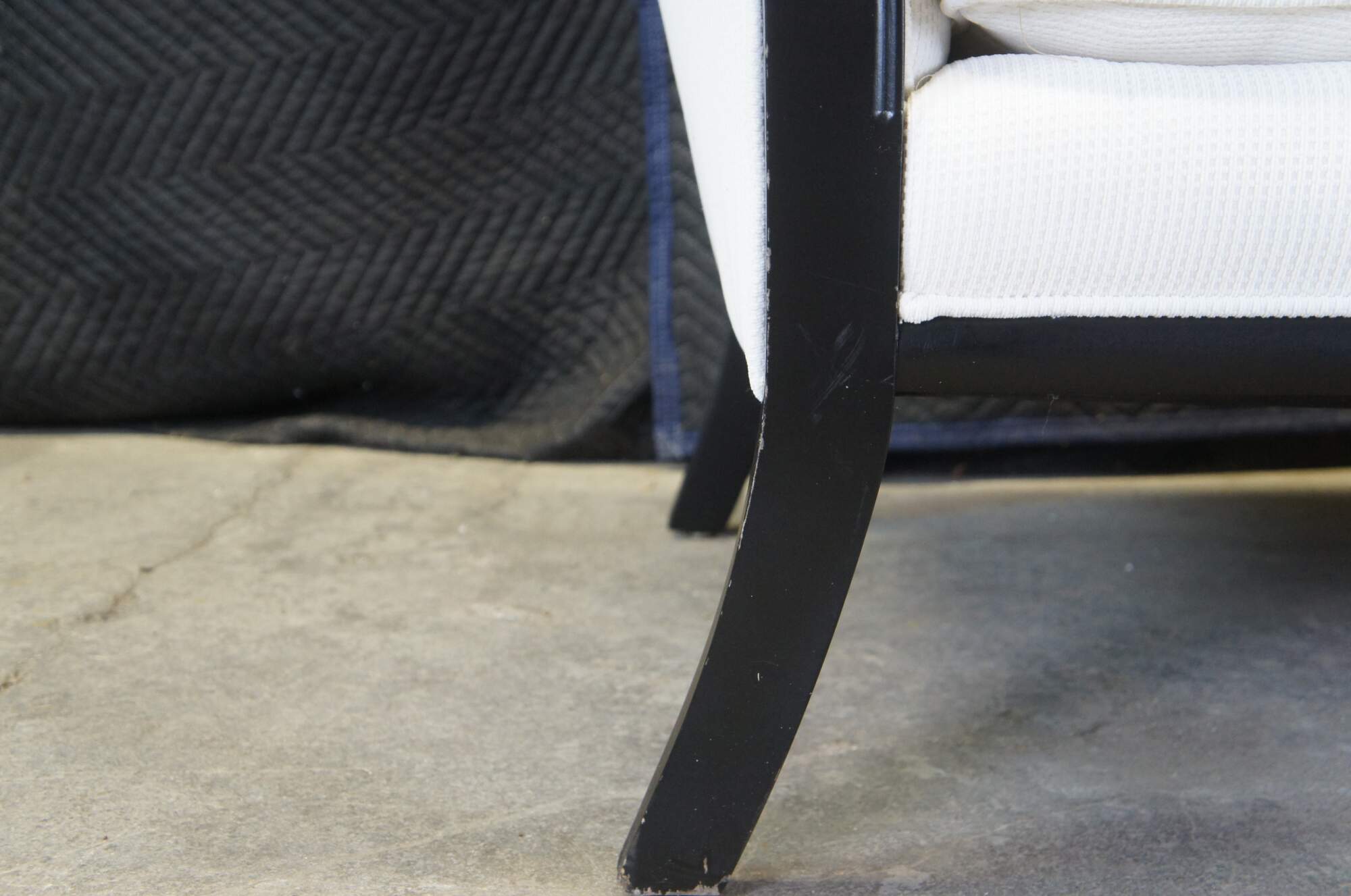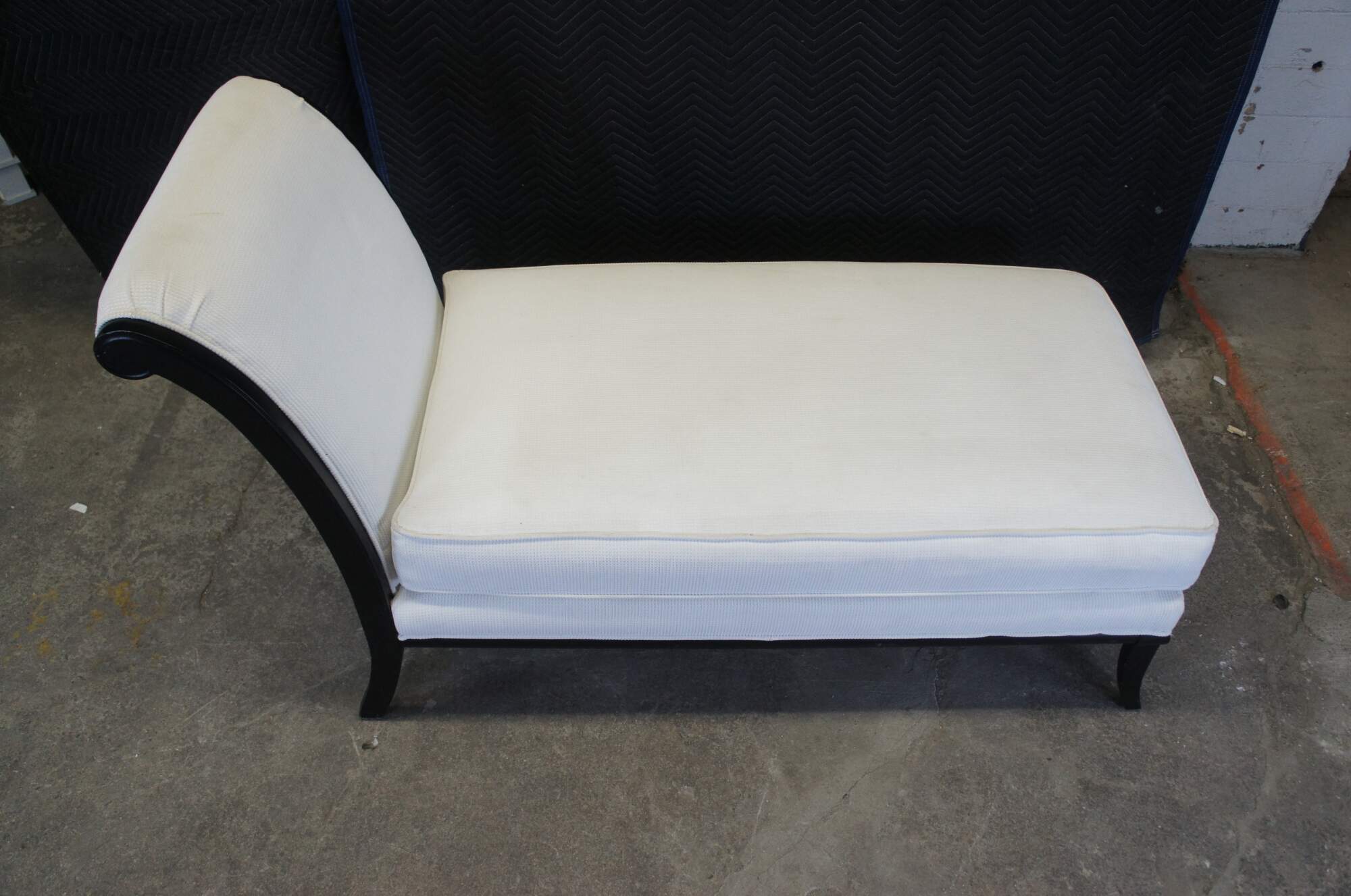A lovely French inspired chaise lounge by Fairfield, circa 1990s. Features a black frame with a contoured back, white upholstery and saber legs. A comfy addition to any space.