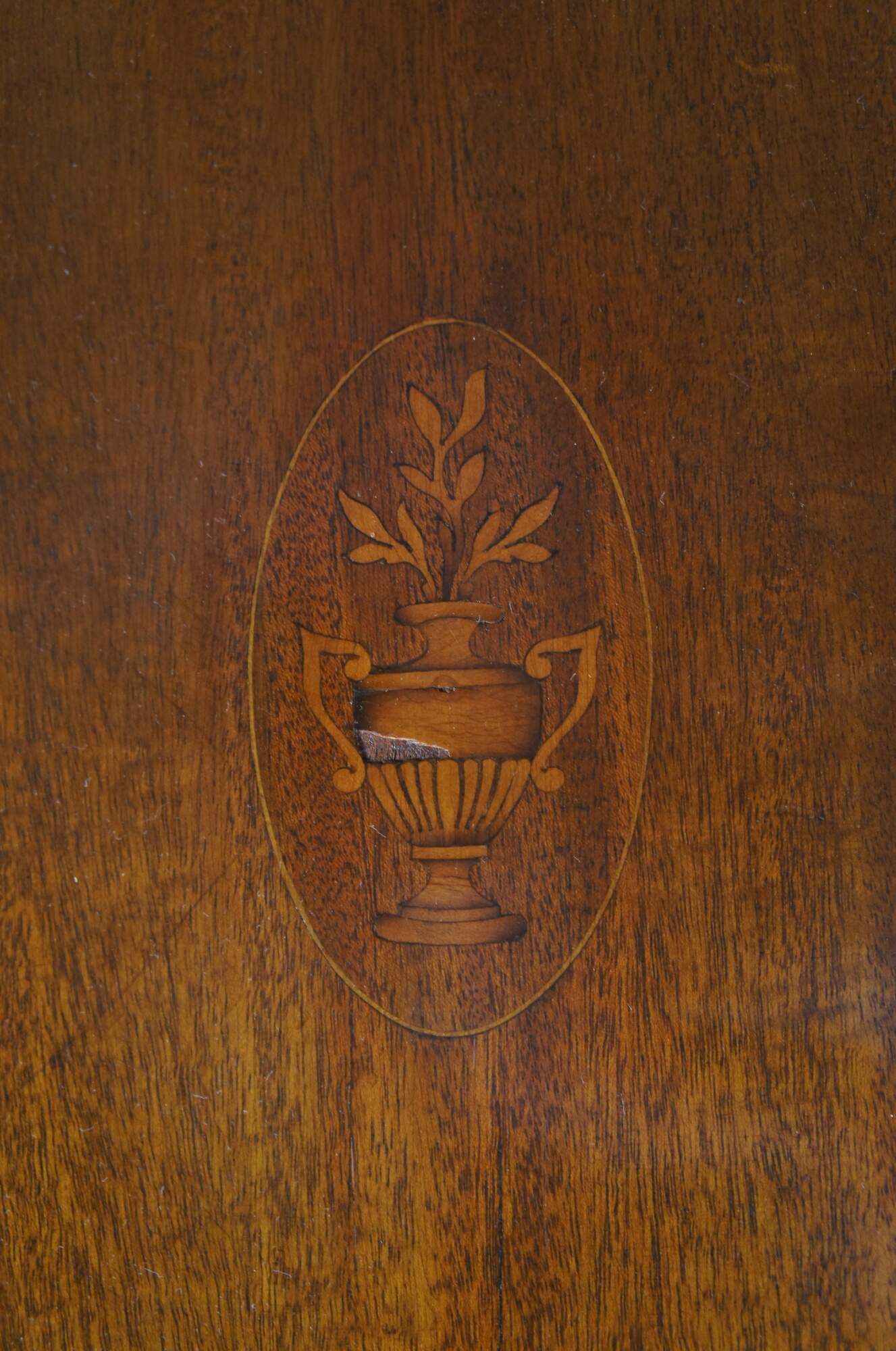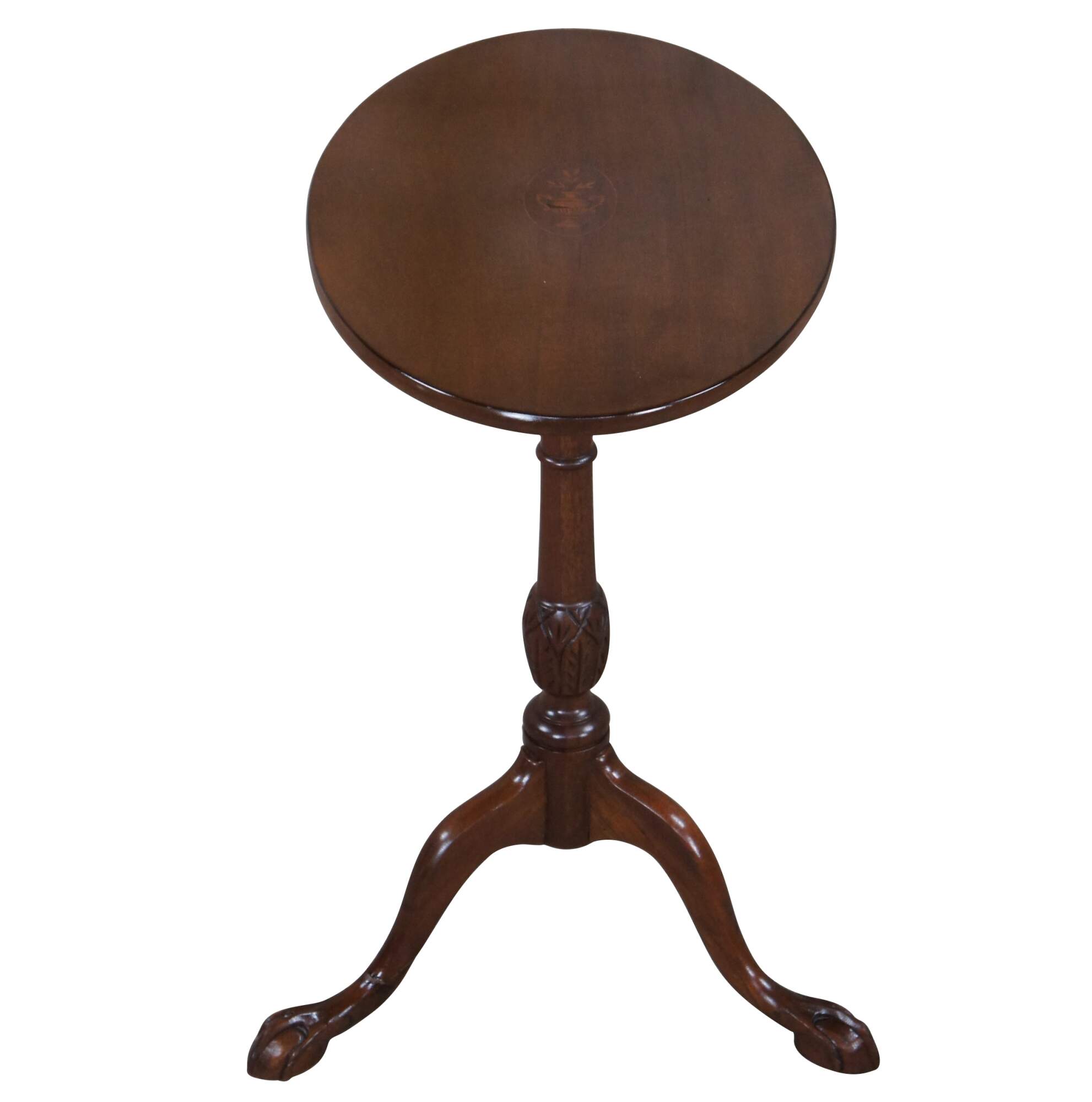 An elegant early 20th century Georgian or Hepplewhite style mahogany tilt-top tea table / candle stand. Features an oval mahogany tabletop with inlayed neoclassical urn marquetry. The top is supported by finely carved support, rising over three downswept legs leading to ball and claw-feet. Ideal for use as a tea table, candle stand, wine table, side table or occasional table.