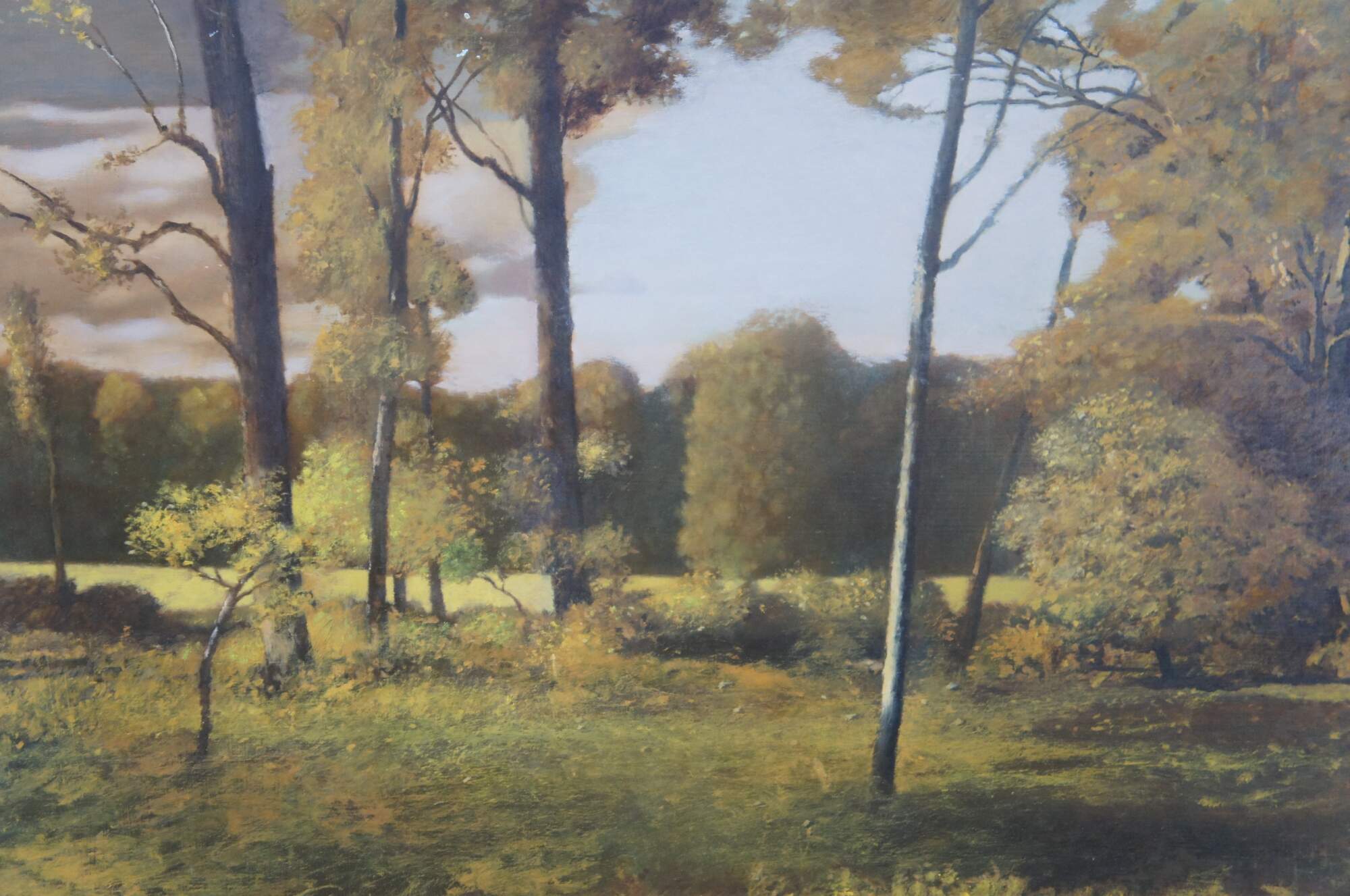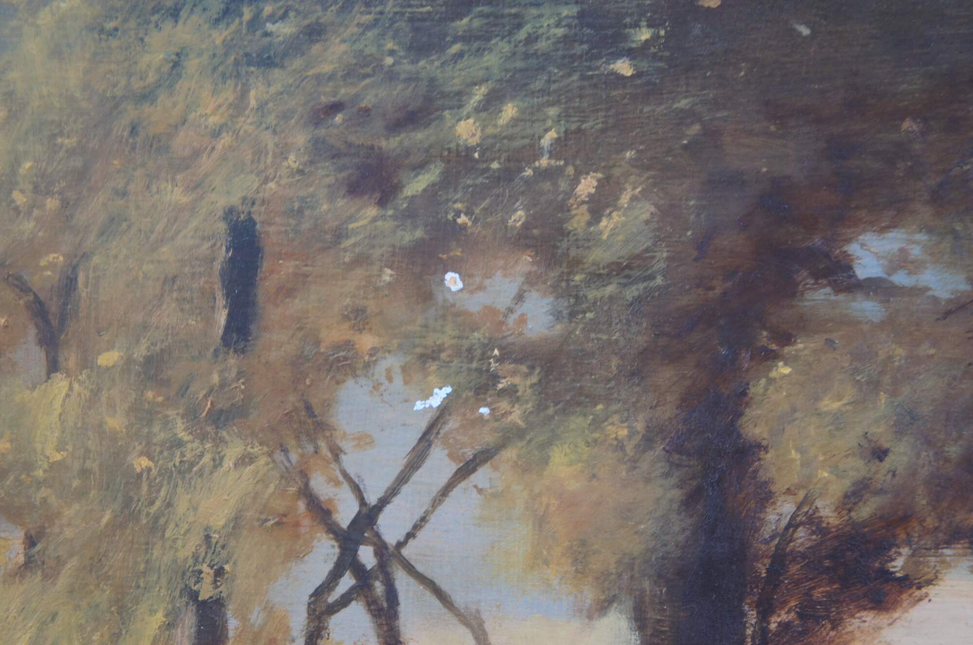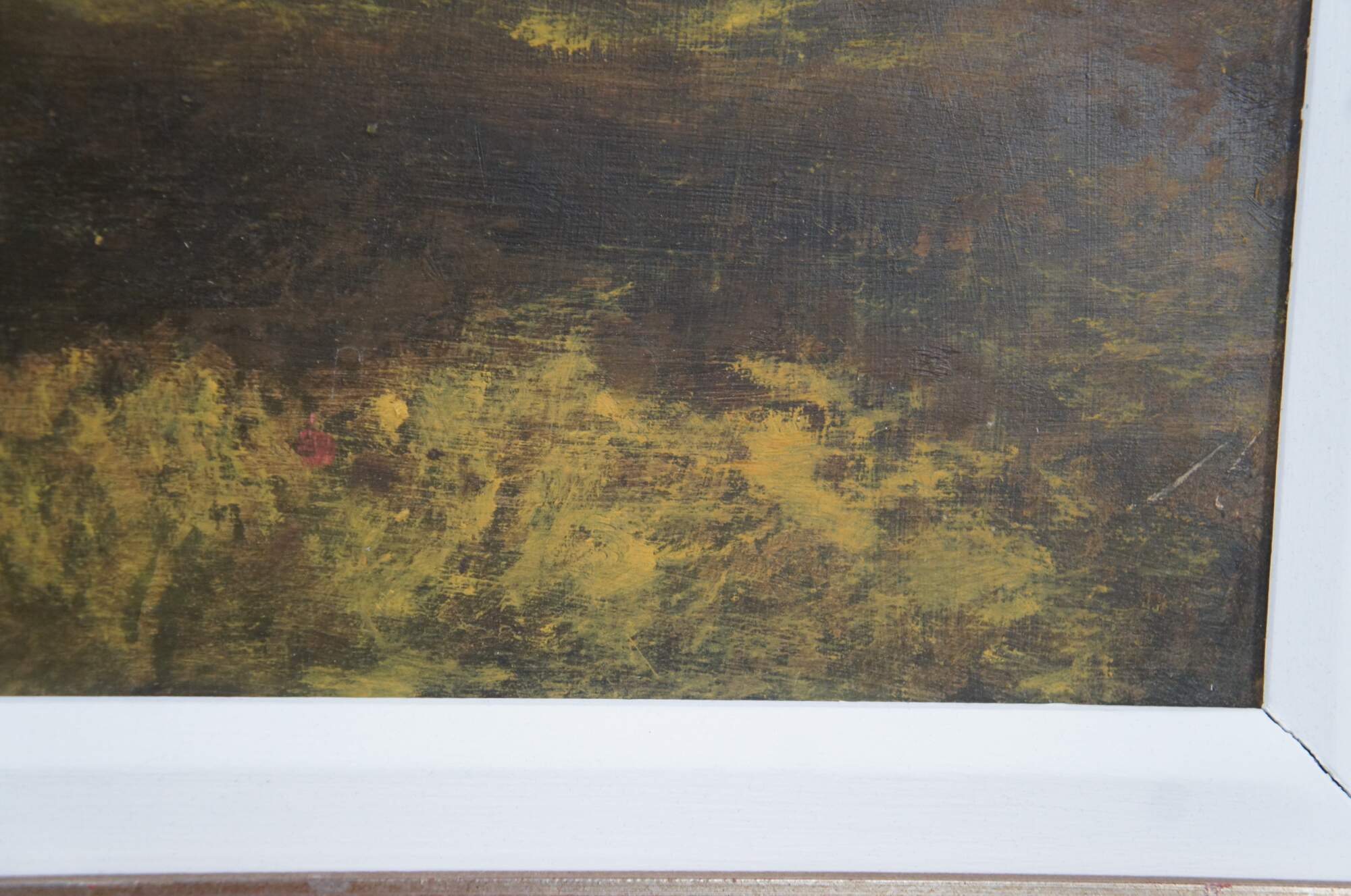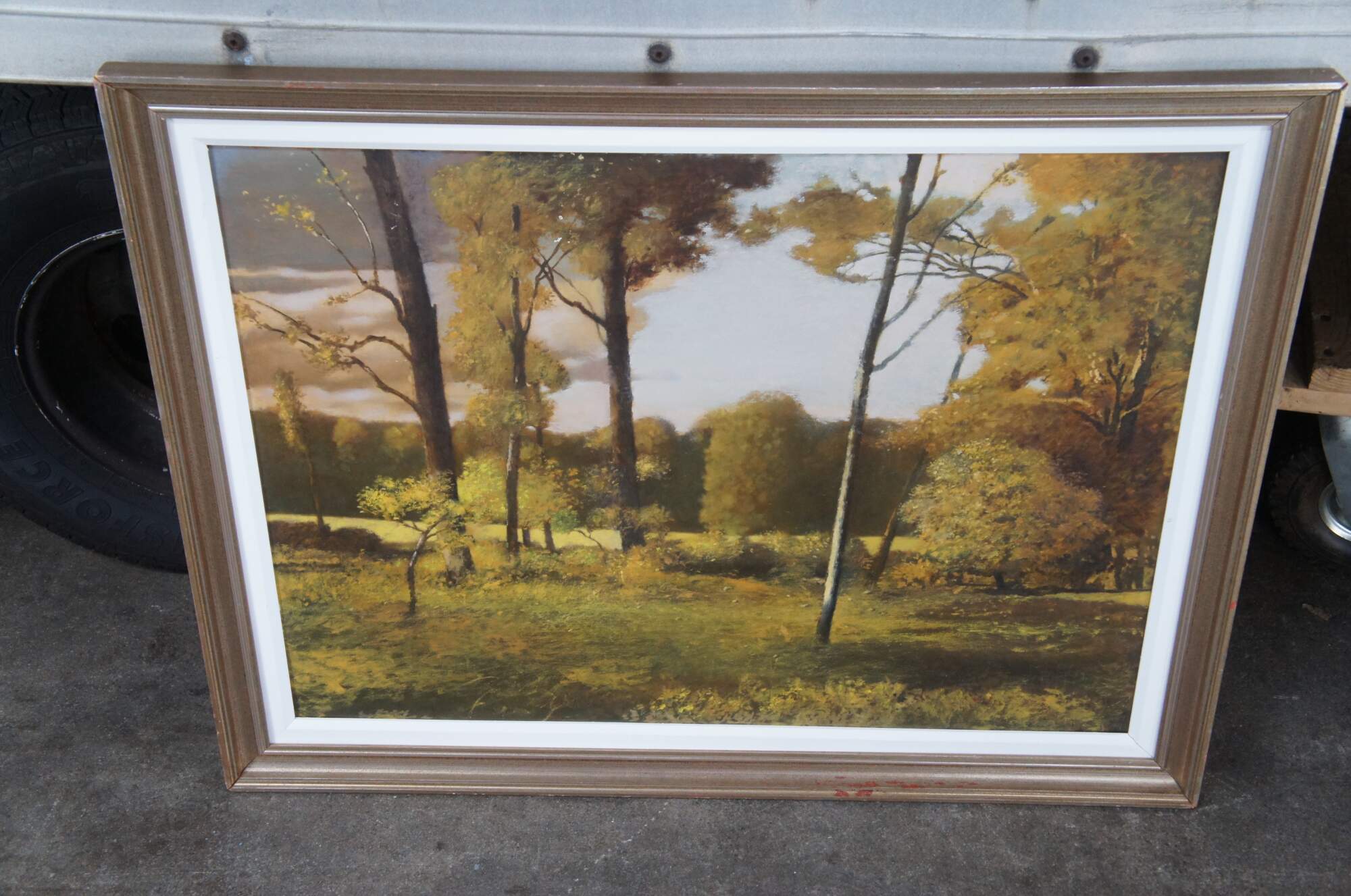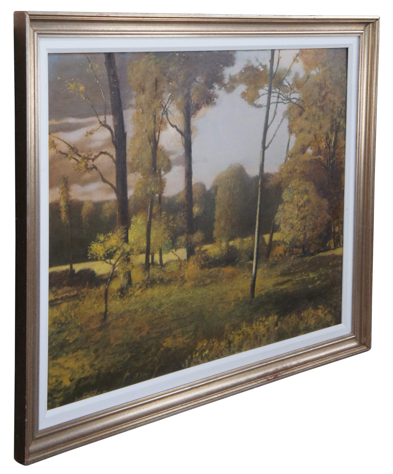 Vintage Ronald Renmark oil painting on canvas featuring an untouched natural landscape of forest and trees tucked away somewhere in Virginia. Made by Ronald for a client of his that he was also decorating for.