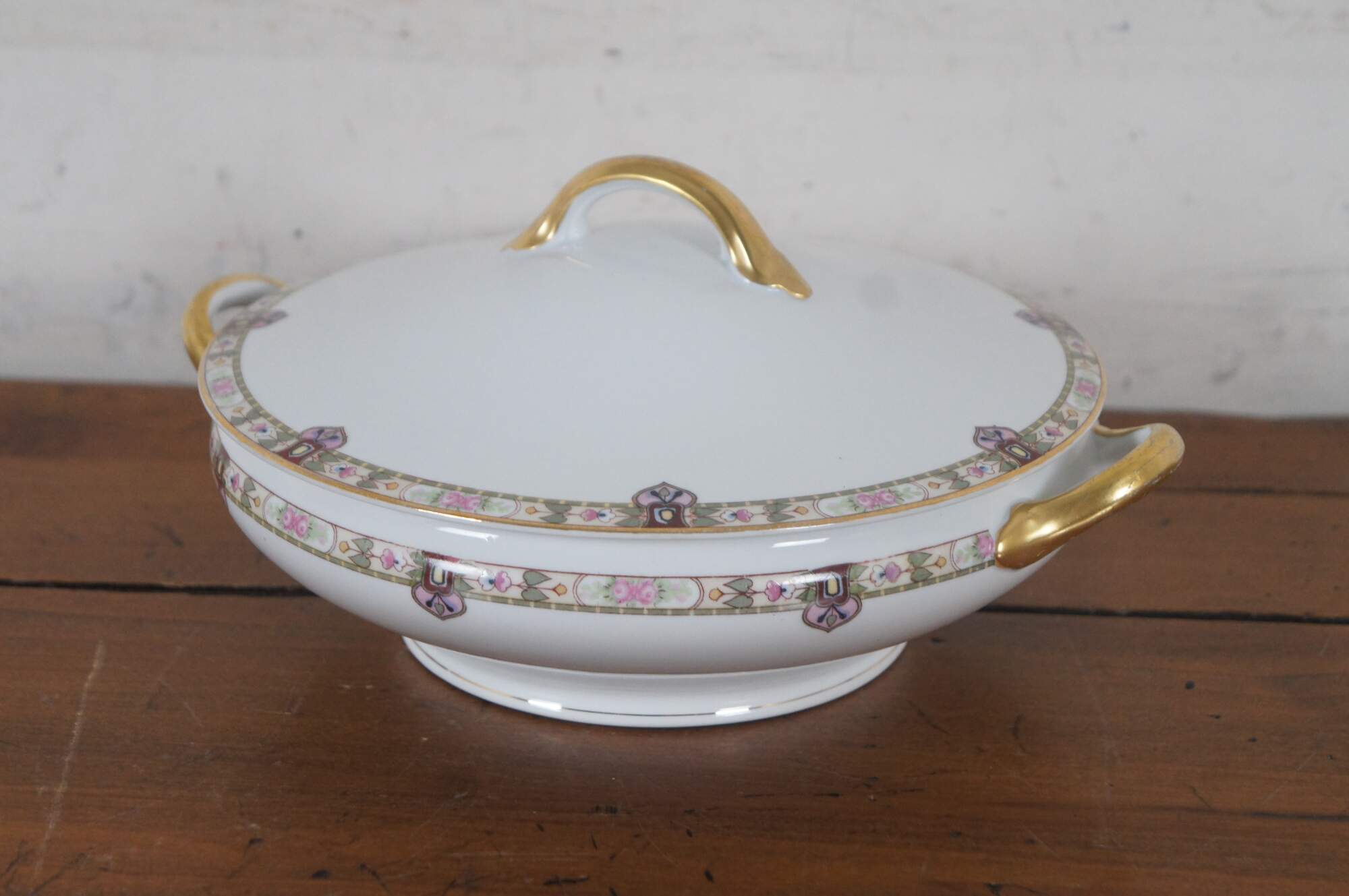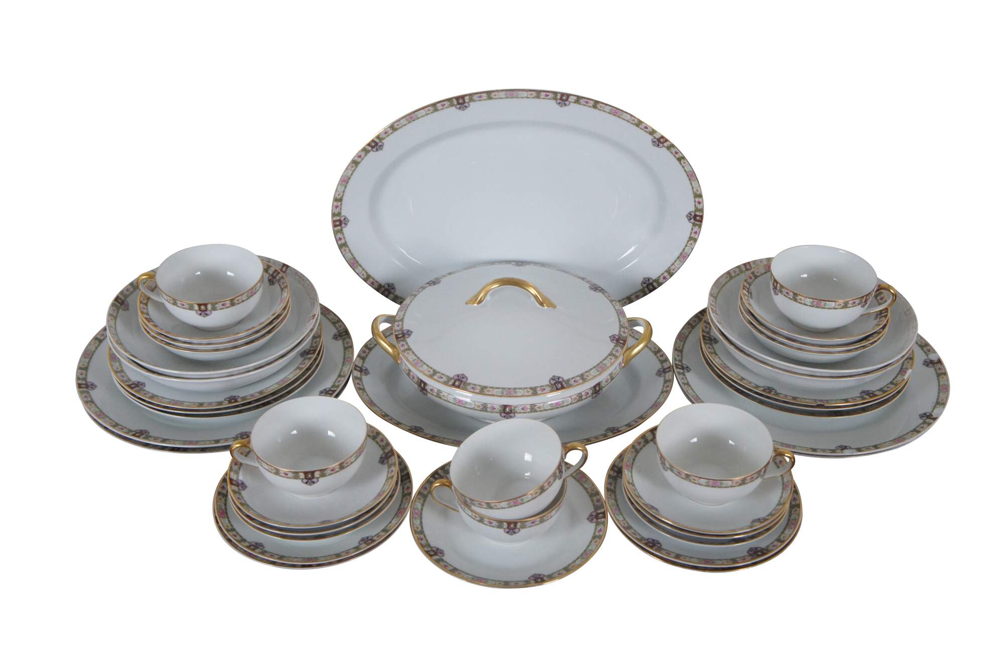 A lovely set of 41 pieces of mid 20th century fine china by Noritake, #13674. Features a Flower Band With Green & Cream.