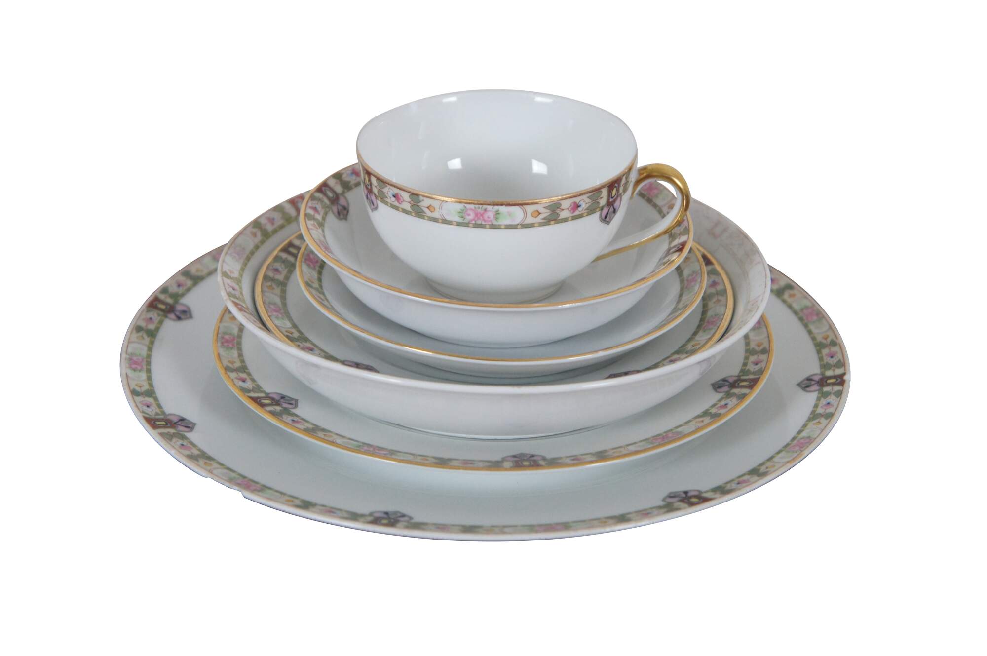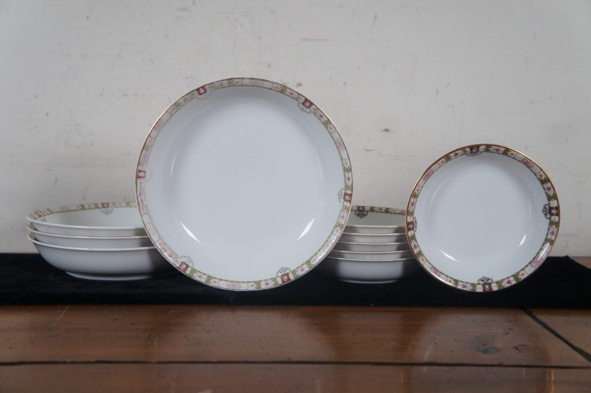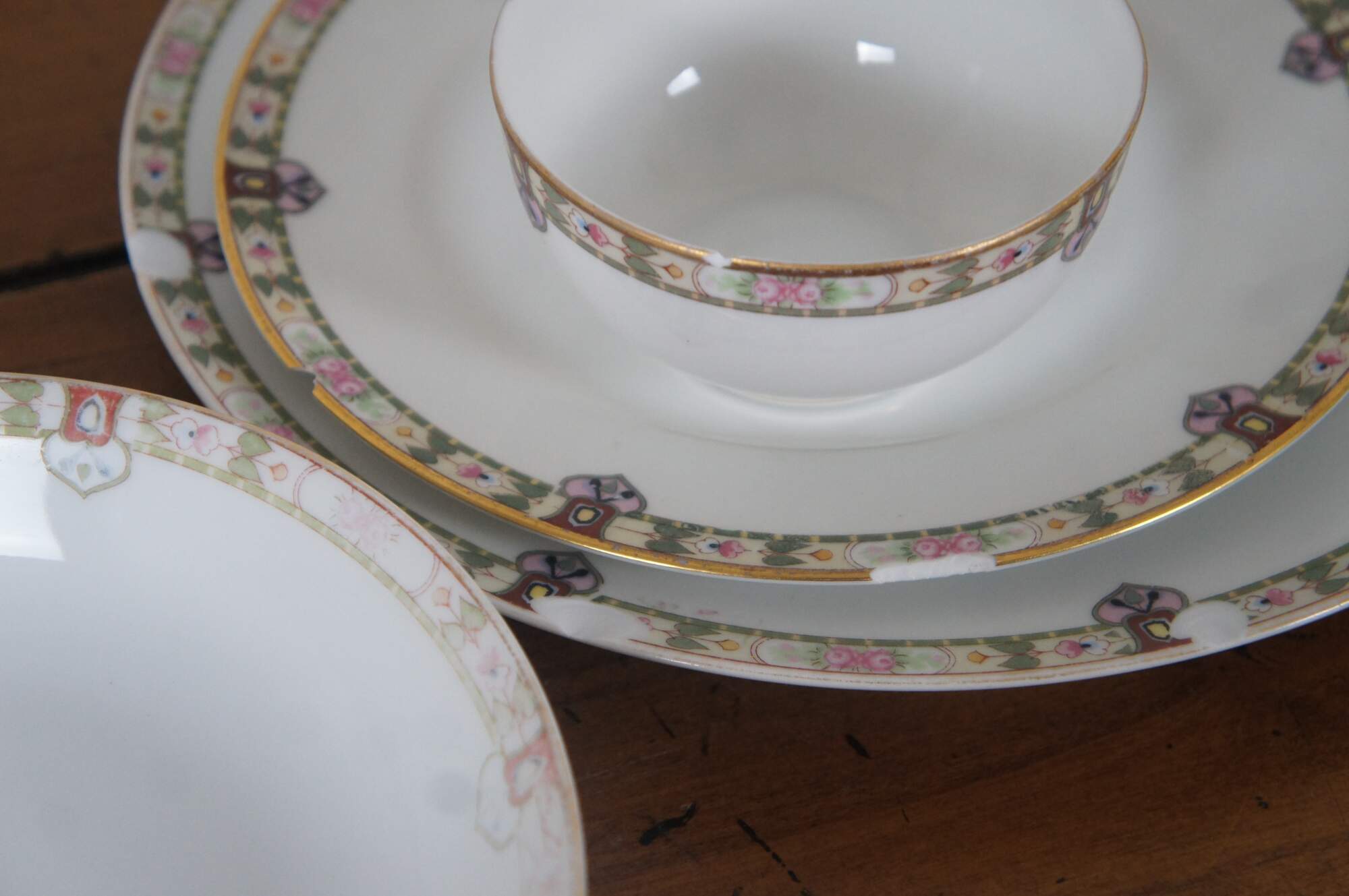 Good Overall - Edge chips 2 dinner plates, 1 salad plate, 1 teacup; fading to designs soup bowls