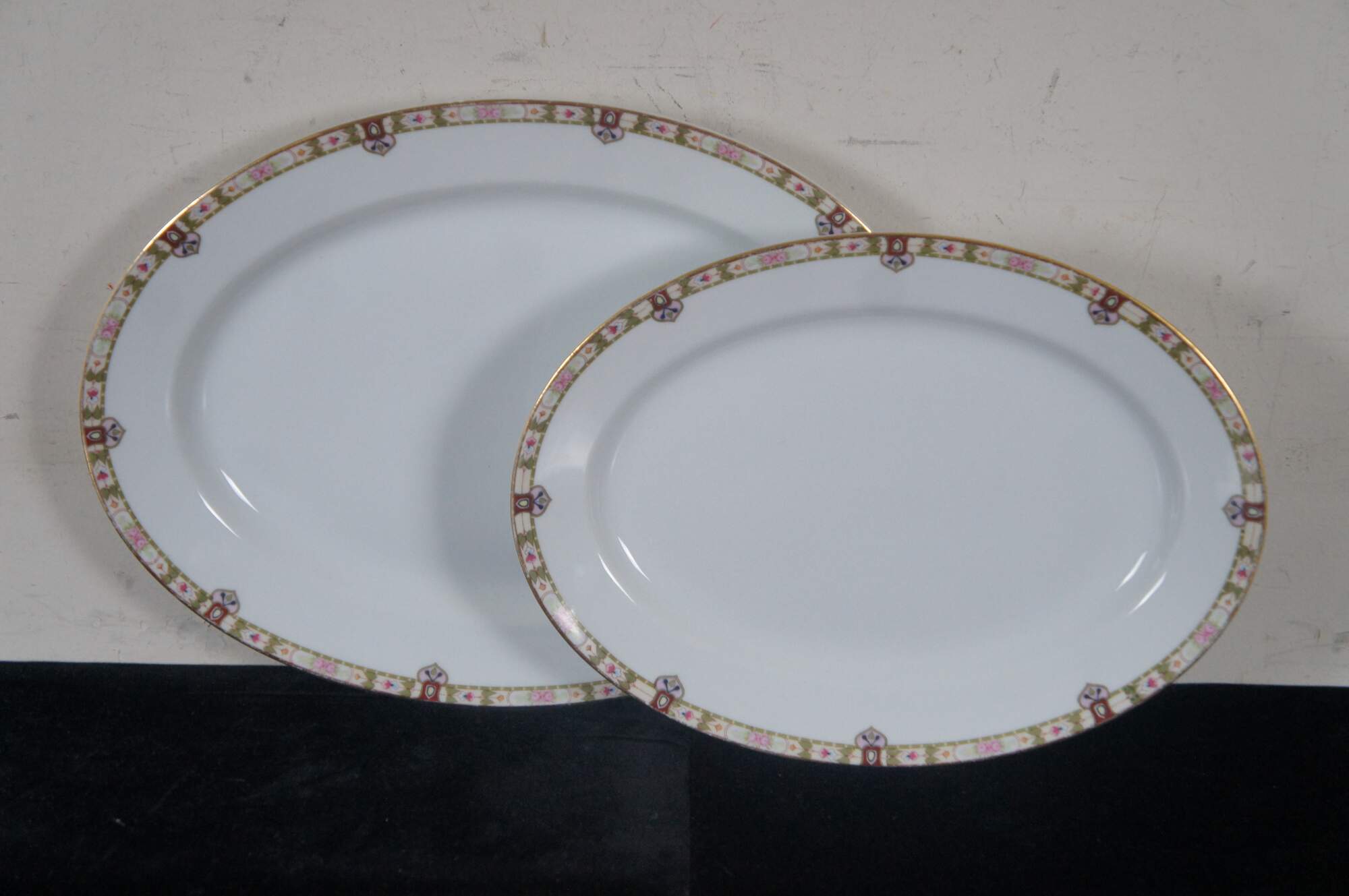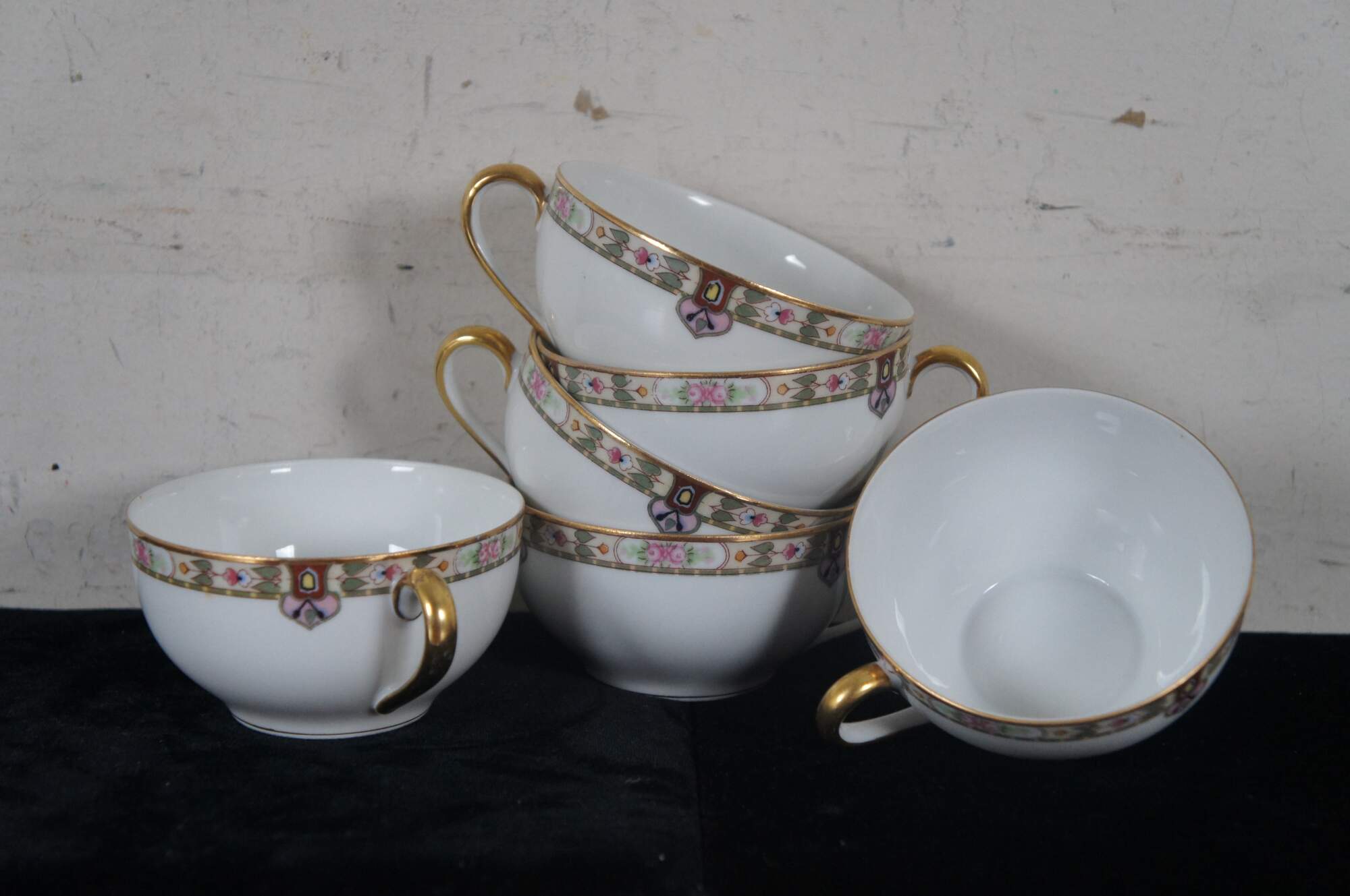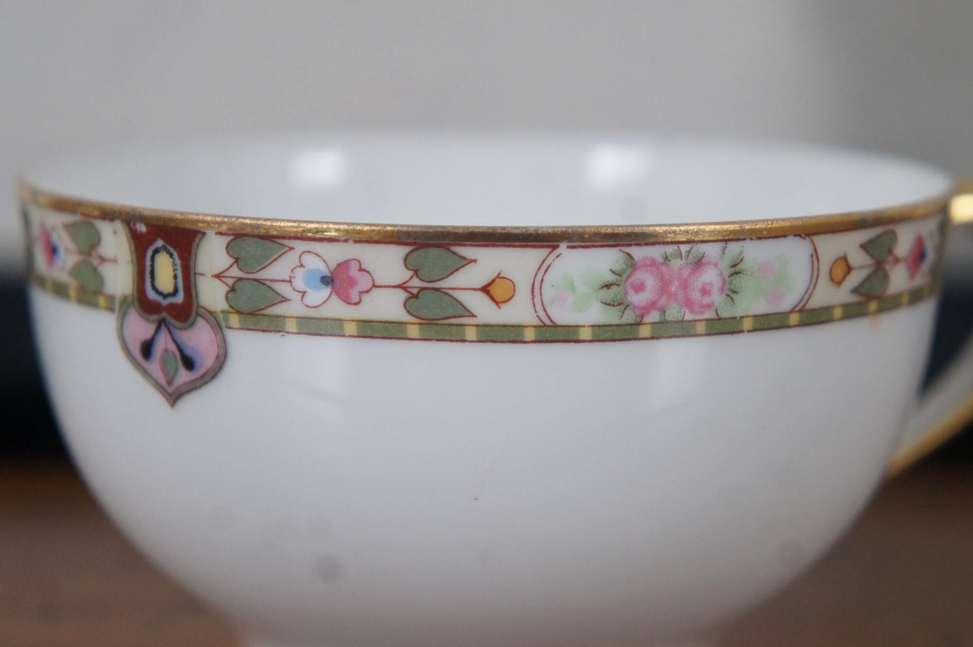 Good Overall - Edge chips 2 dinner plates, 1 salad plate, 1 teacup; fading to designs soup bowls