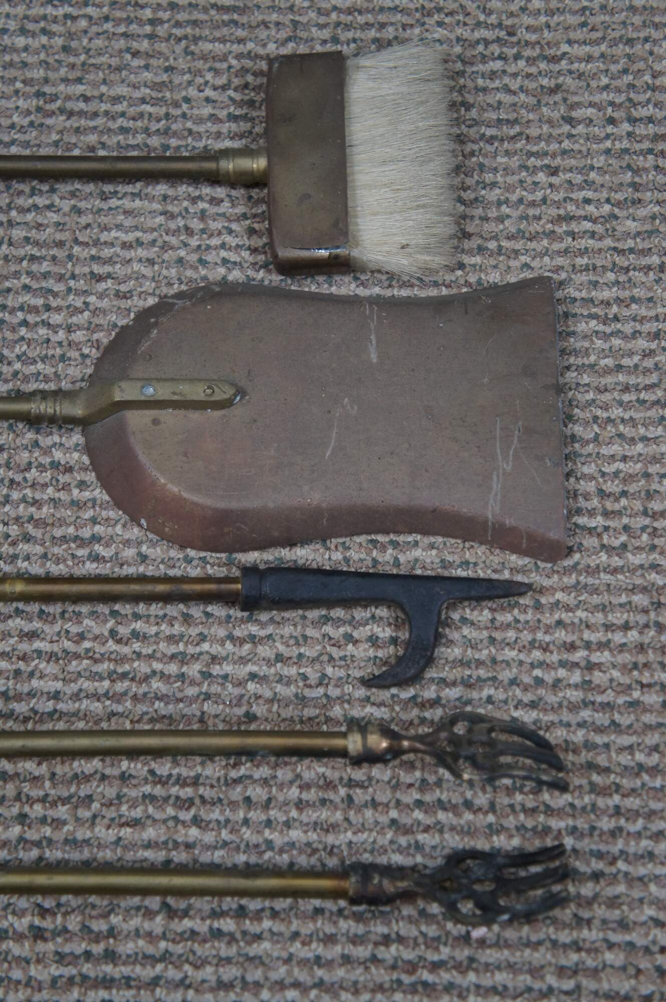 Mid 20th century five piece set of brass fireplace tools with horse head finials, by Decorative Crafts, Inc. Set includes stand with rectangular base and sunburst detail, tongs, shovel, poker, and brush, all topped with a horse’s head. Base also marked with GS in a triangle mark.
