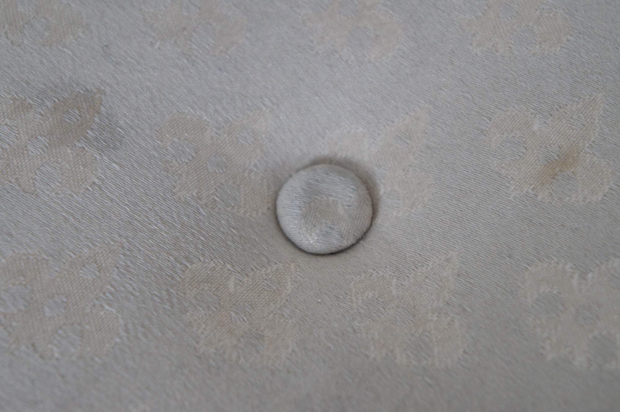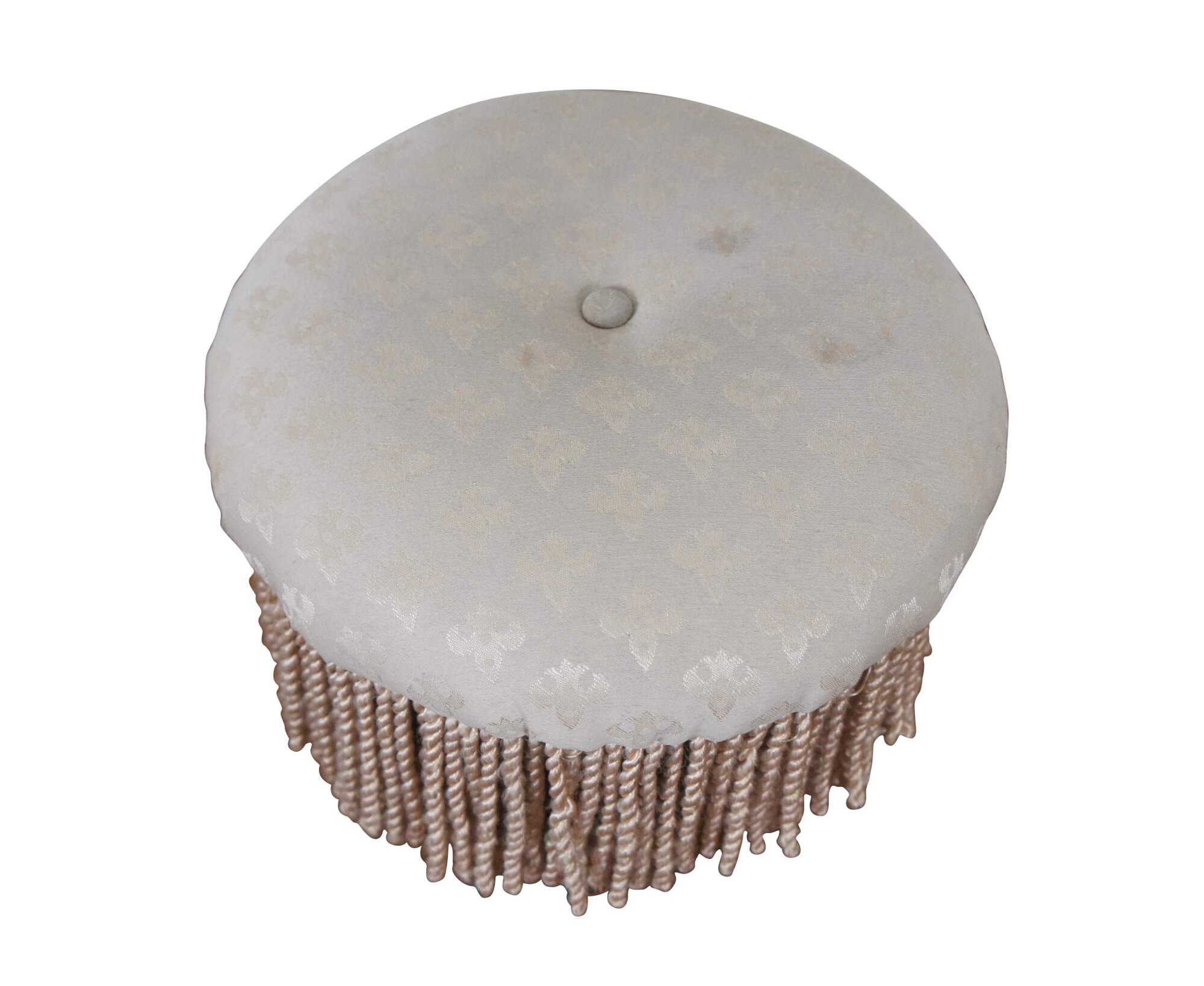 Late 20th century round tufted foot stool / ottoman, covered in cream colored upholstery with fleur de lis, cylindrical oak legs, and trimmed with a light golden beige rope twist fringe.
