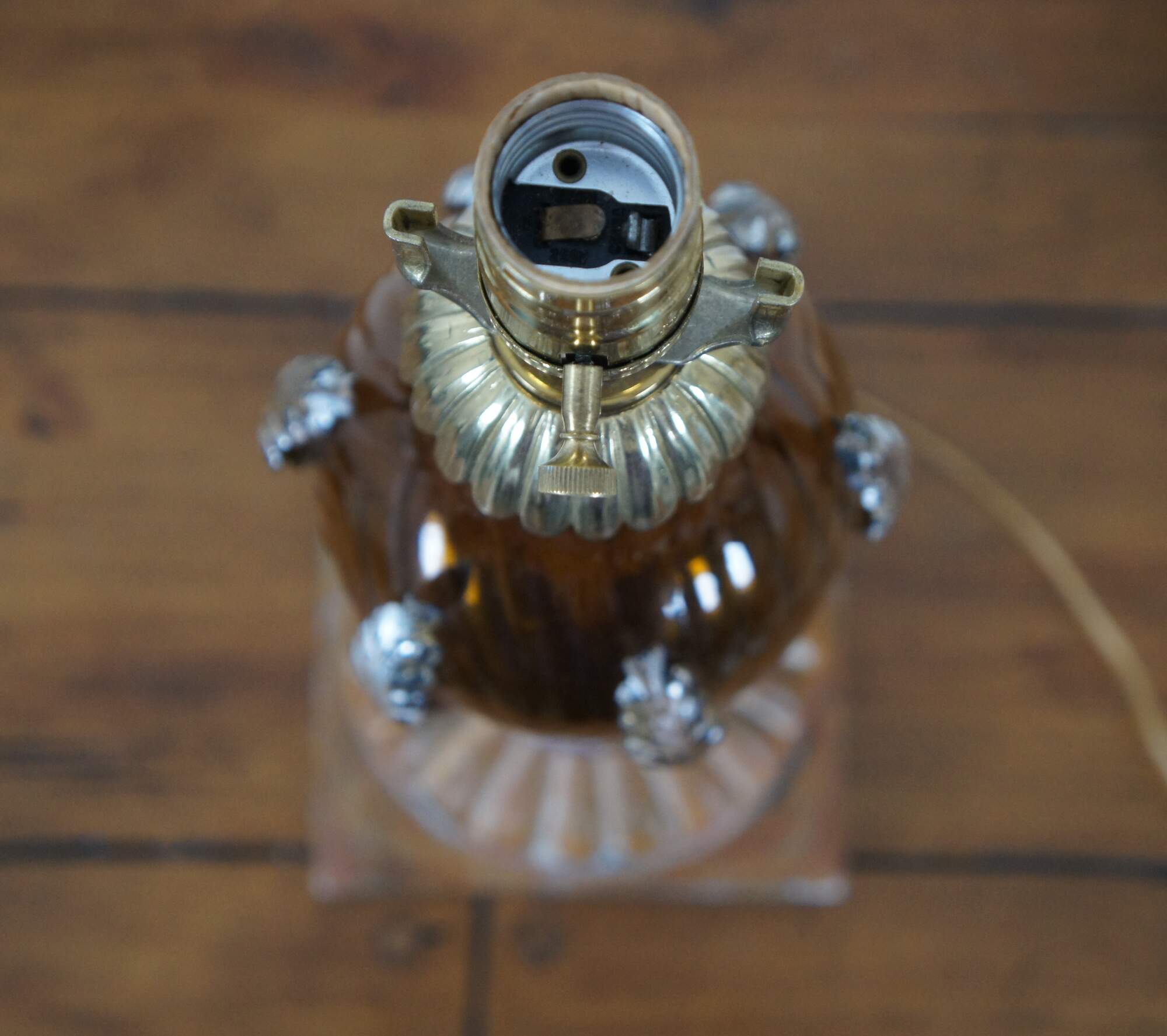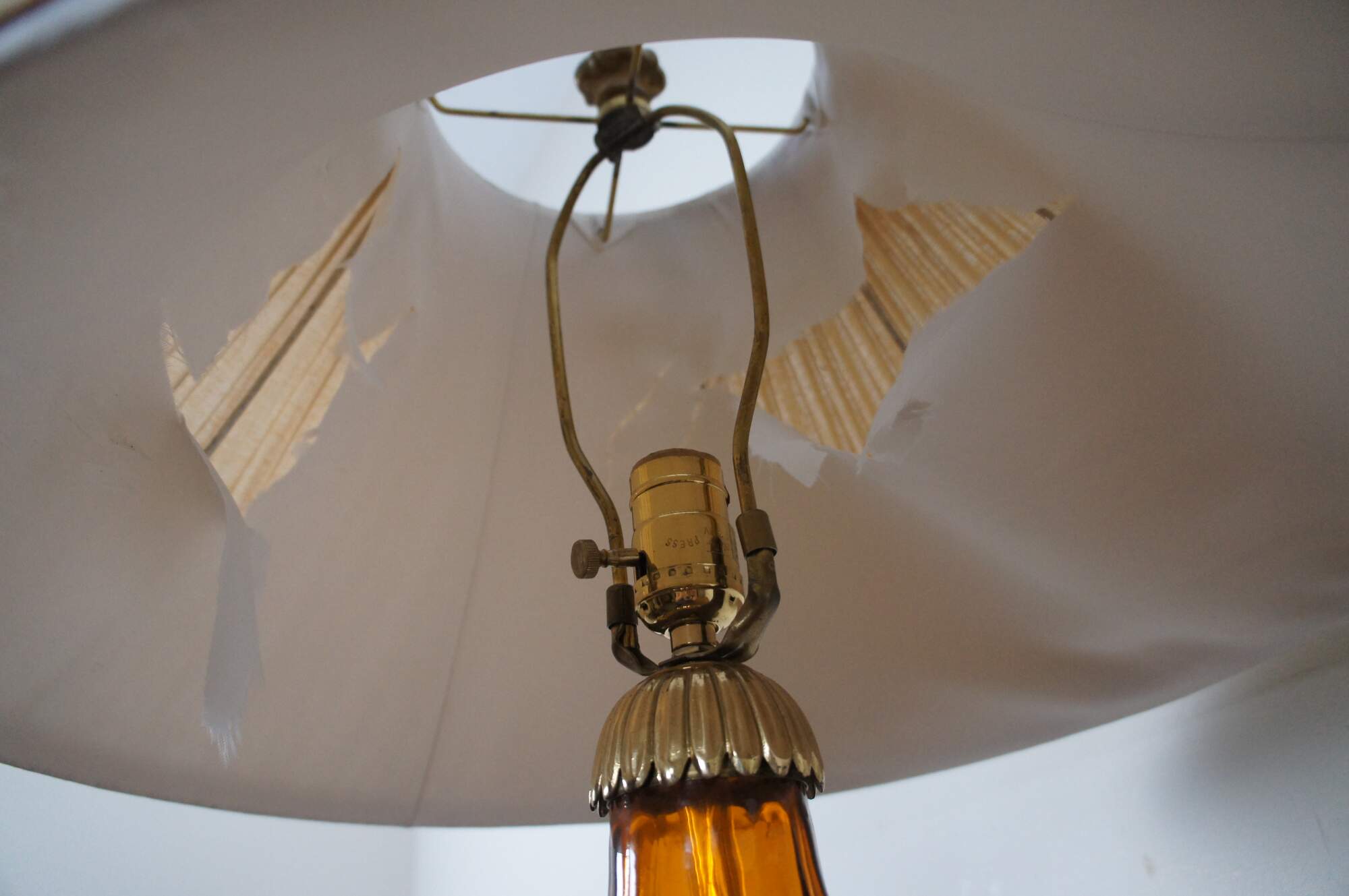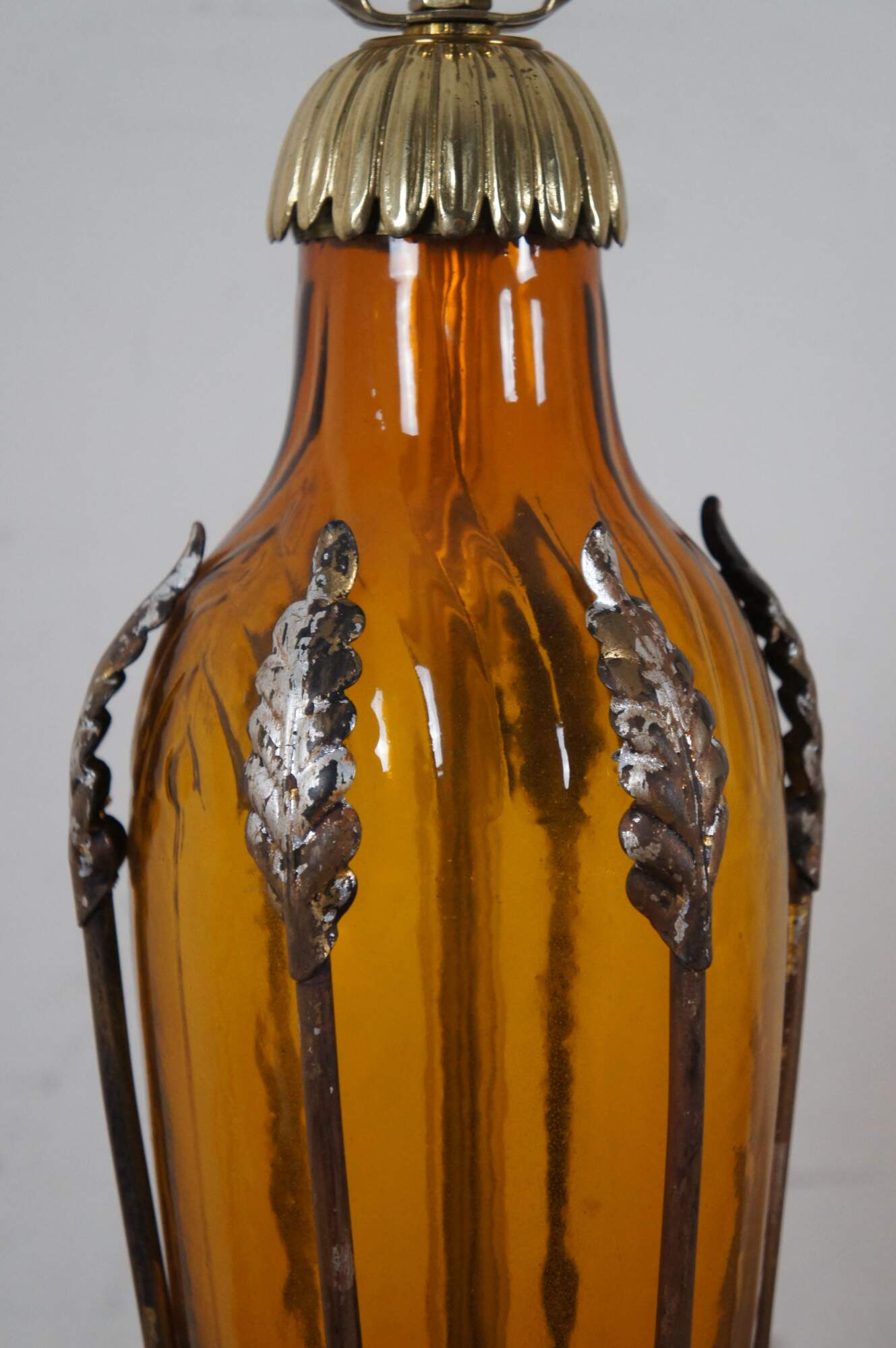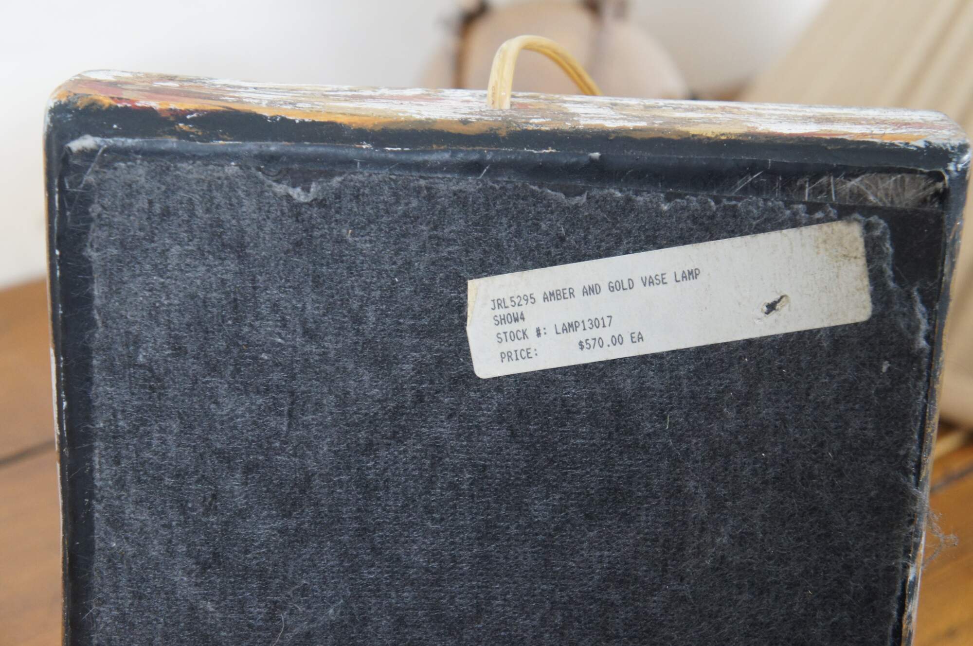 Vintage John Richard neoclassically inspired table lamp with painted chalkware column base supporting an amber glass trophy urn shaped vase topped with gold and caged with single leaf stalks. Off white, pleated linen shade. JRL5295 Amber and Gold Vase Lamp.