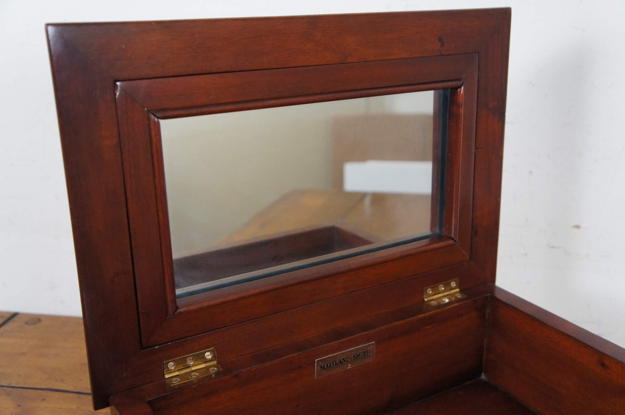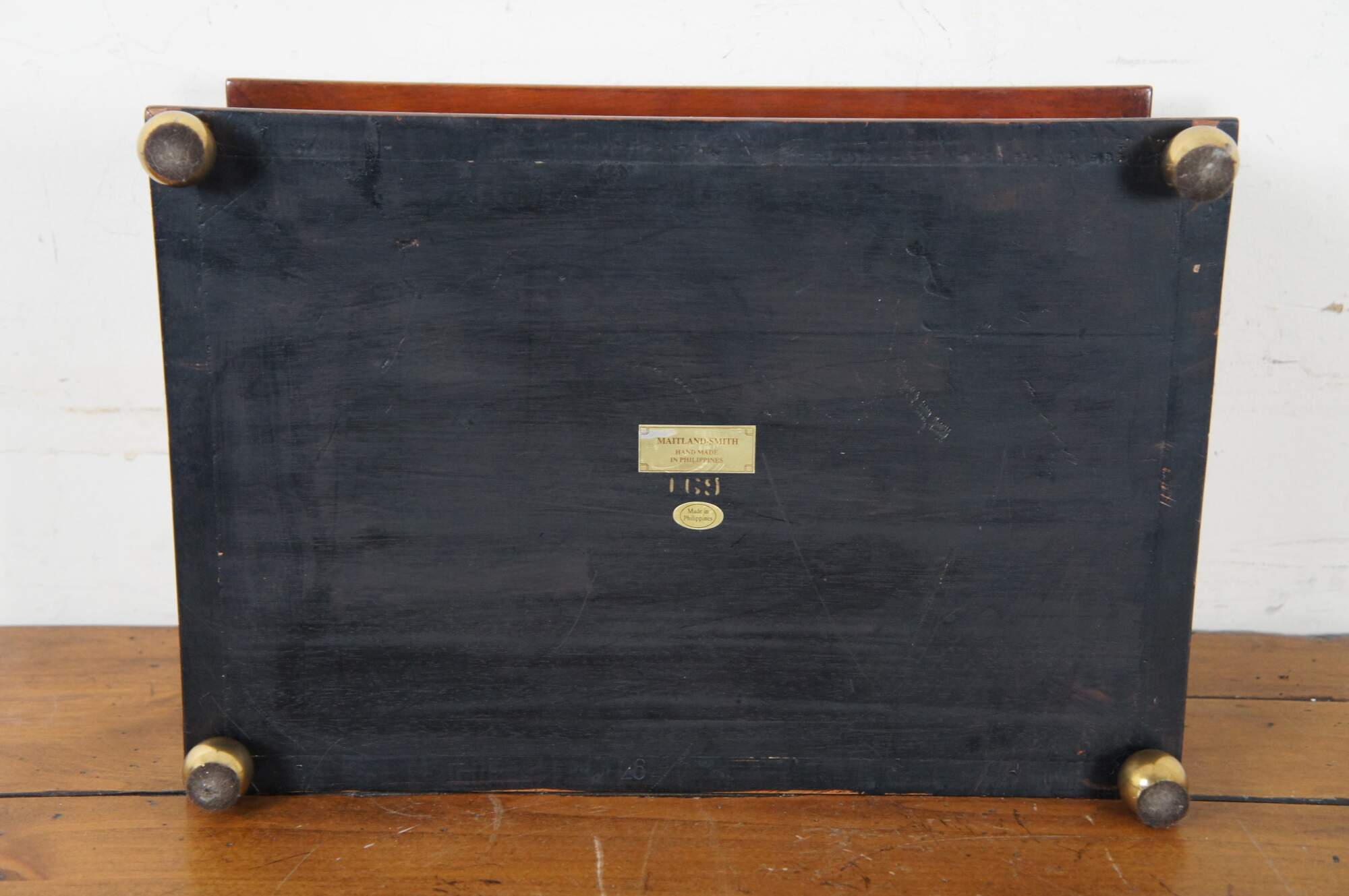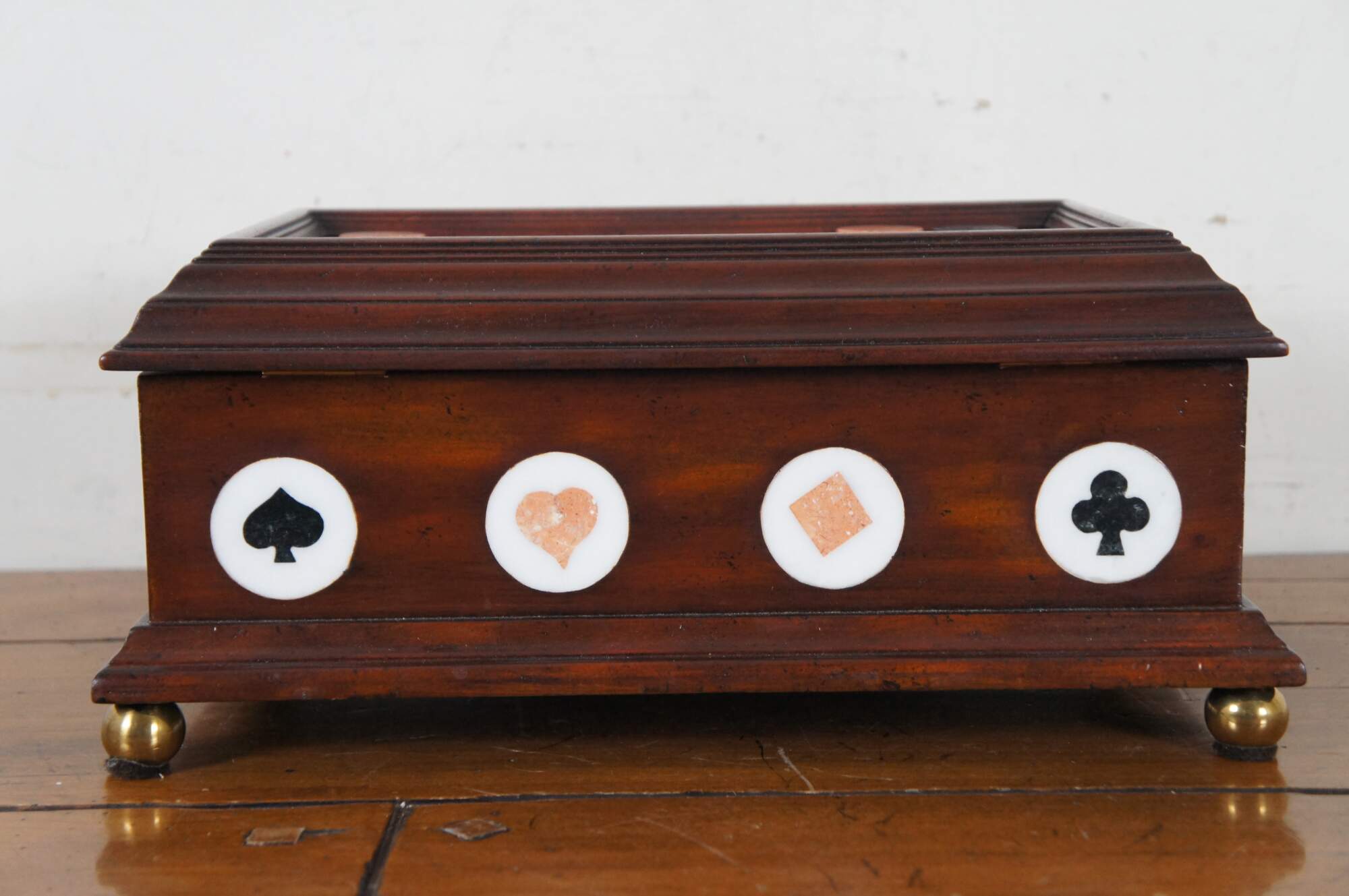 Vintage Maitland Smith trinket / keepsake / jewelry box / casket, crafted of mahogany with inlaid marble / stone details including the four playing card suits along each side and an inset three dimensional top showing four painted aces and a handful of poker chips. Supported on brass ball feet. Mirror on interior of lid. Base marked 169. Made in the Philippines.