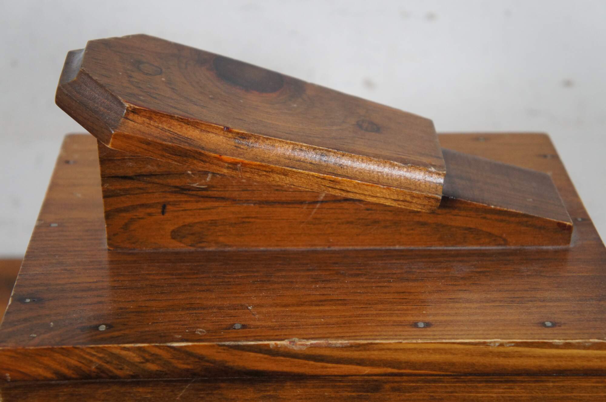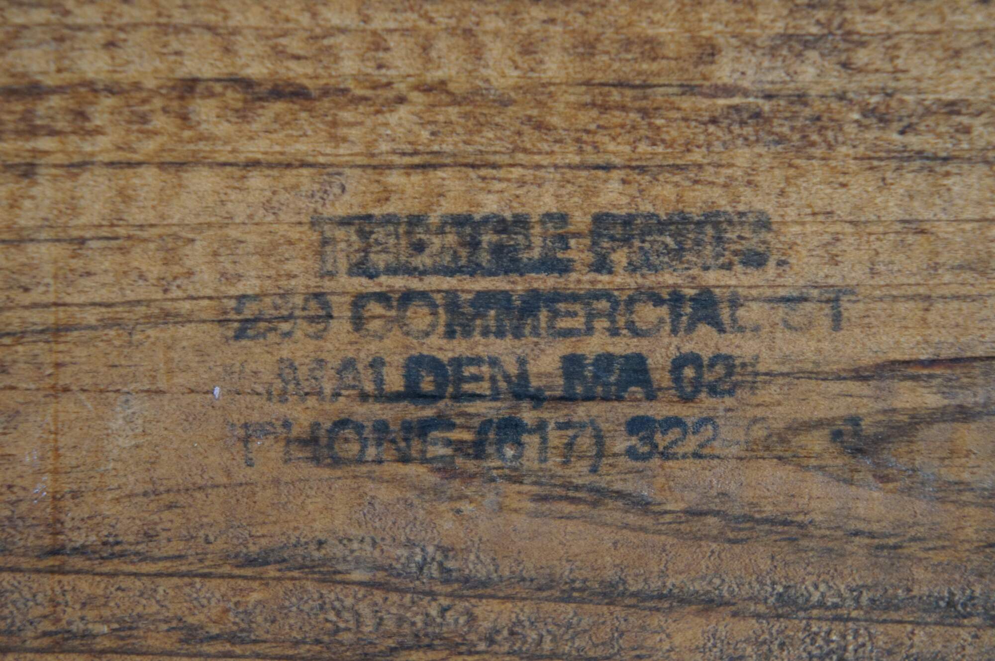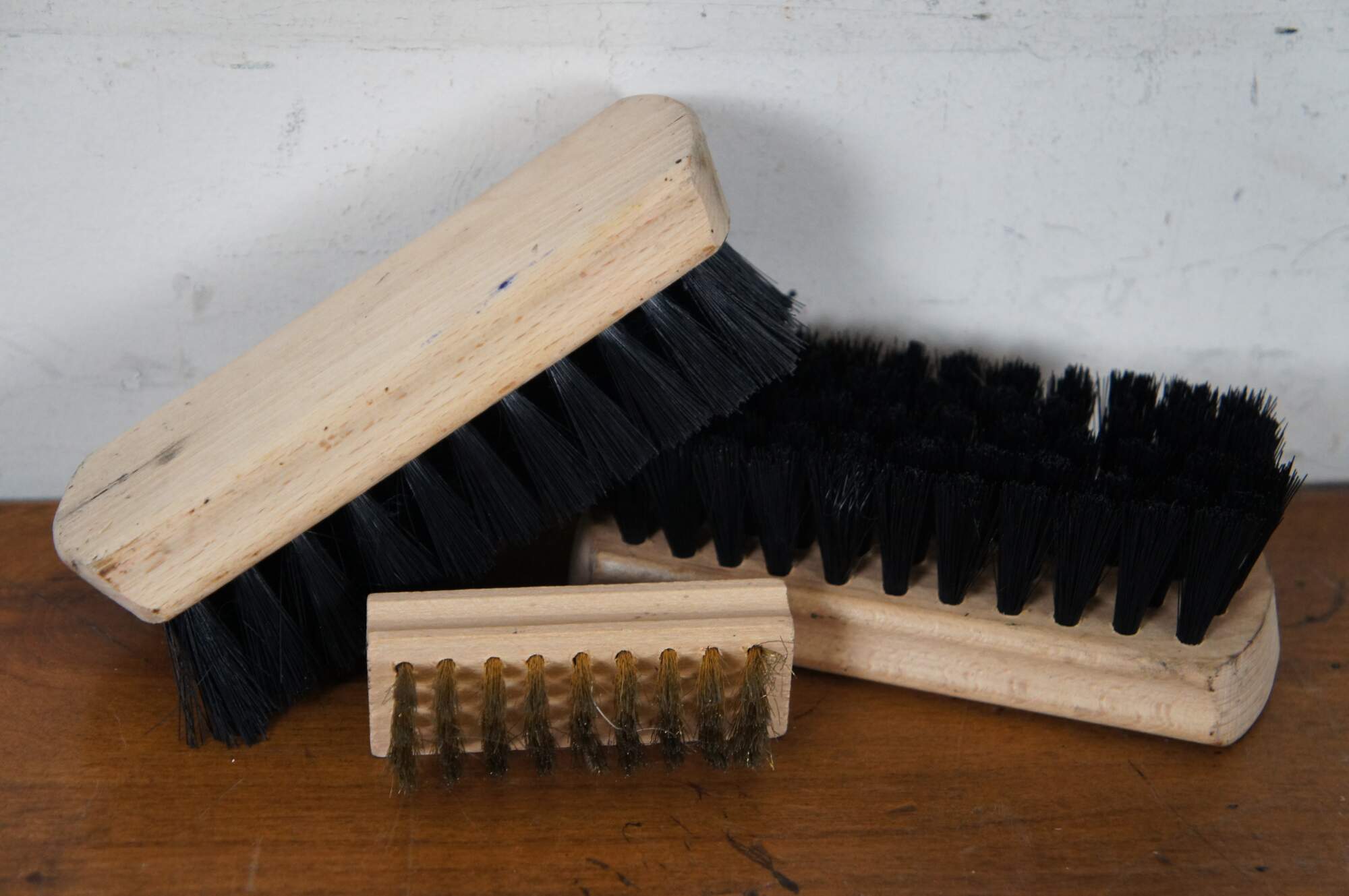Vintage shoe shine box, produced by Triangle Products of Malden, MA. Rectangular wooden box with shoe stand fixed to the top, brass hardware, stenciled in black with the words “Shoe Shine 5 Cents” in an Old West / late 19th century type font. Includes three brushes.