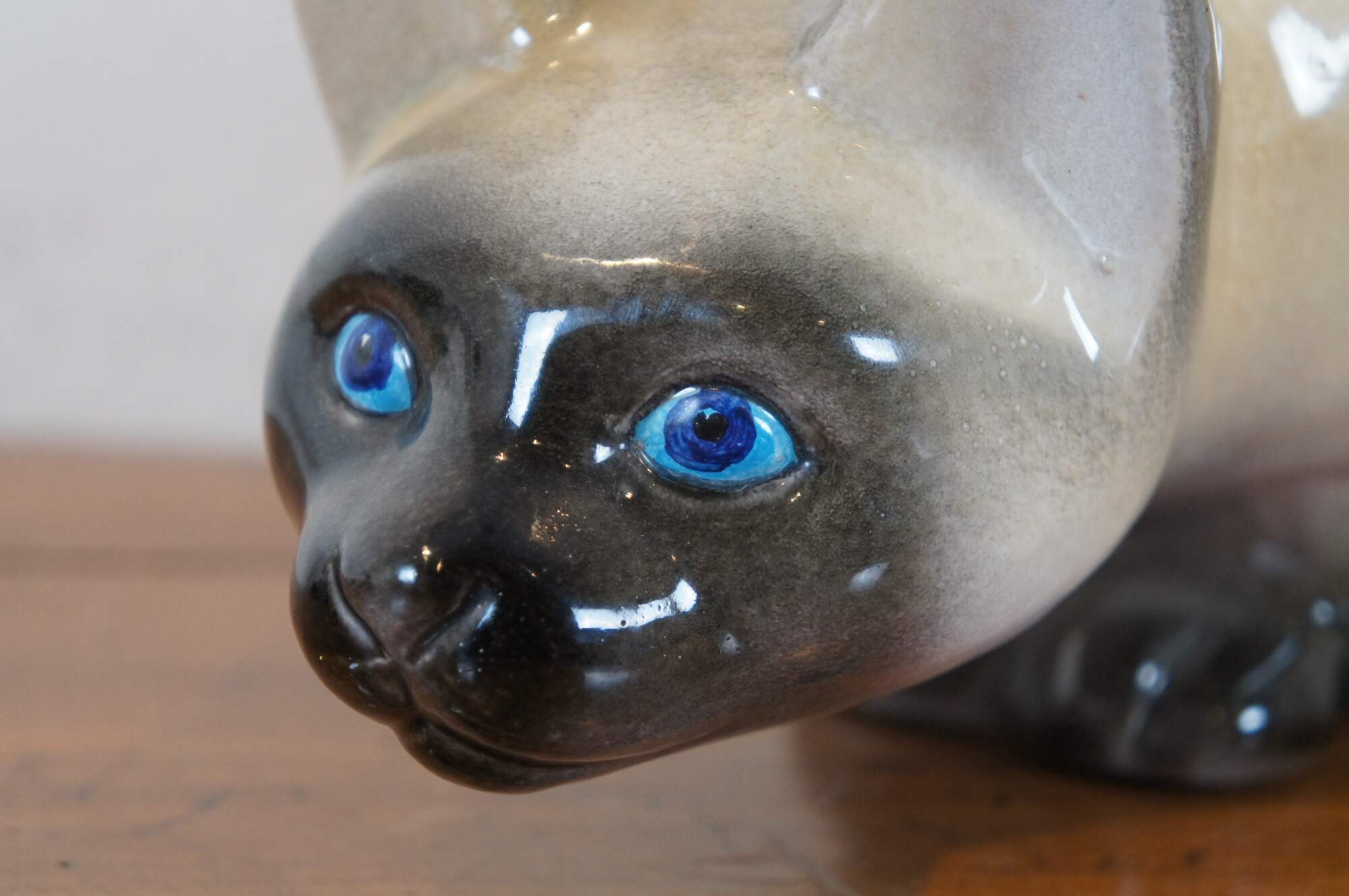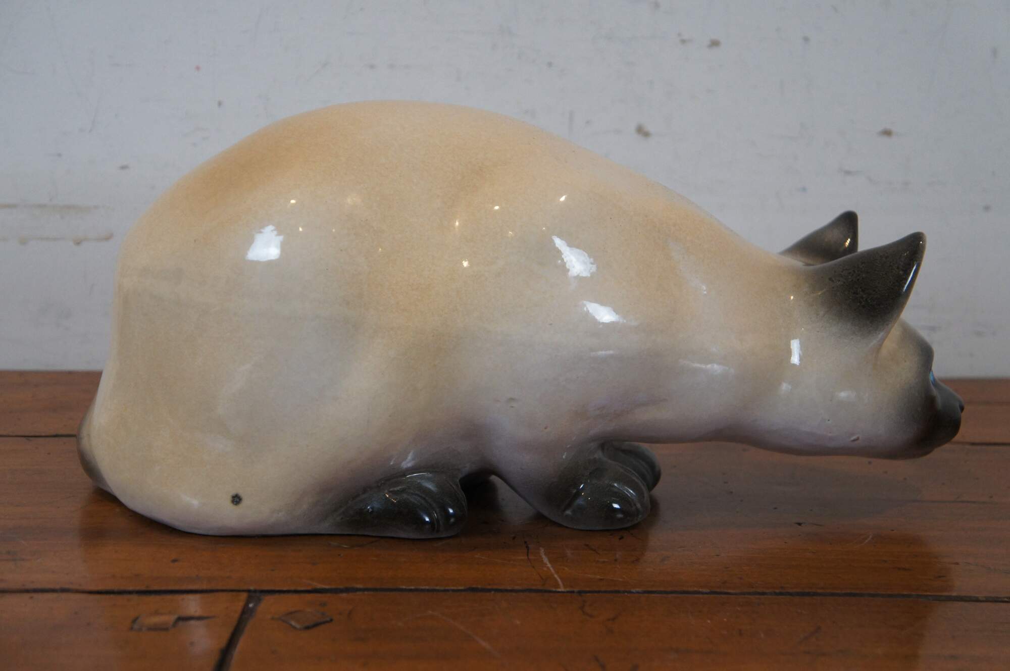 Large vintage ceramic statuette in the shape of a crouching or hunting Siamese cat, glazed with traditional cream and black coloring and bright blue eyes. Made in Italy.