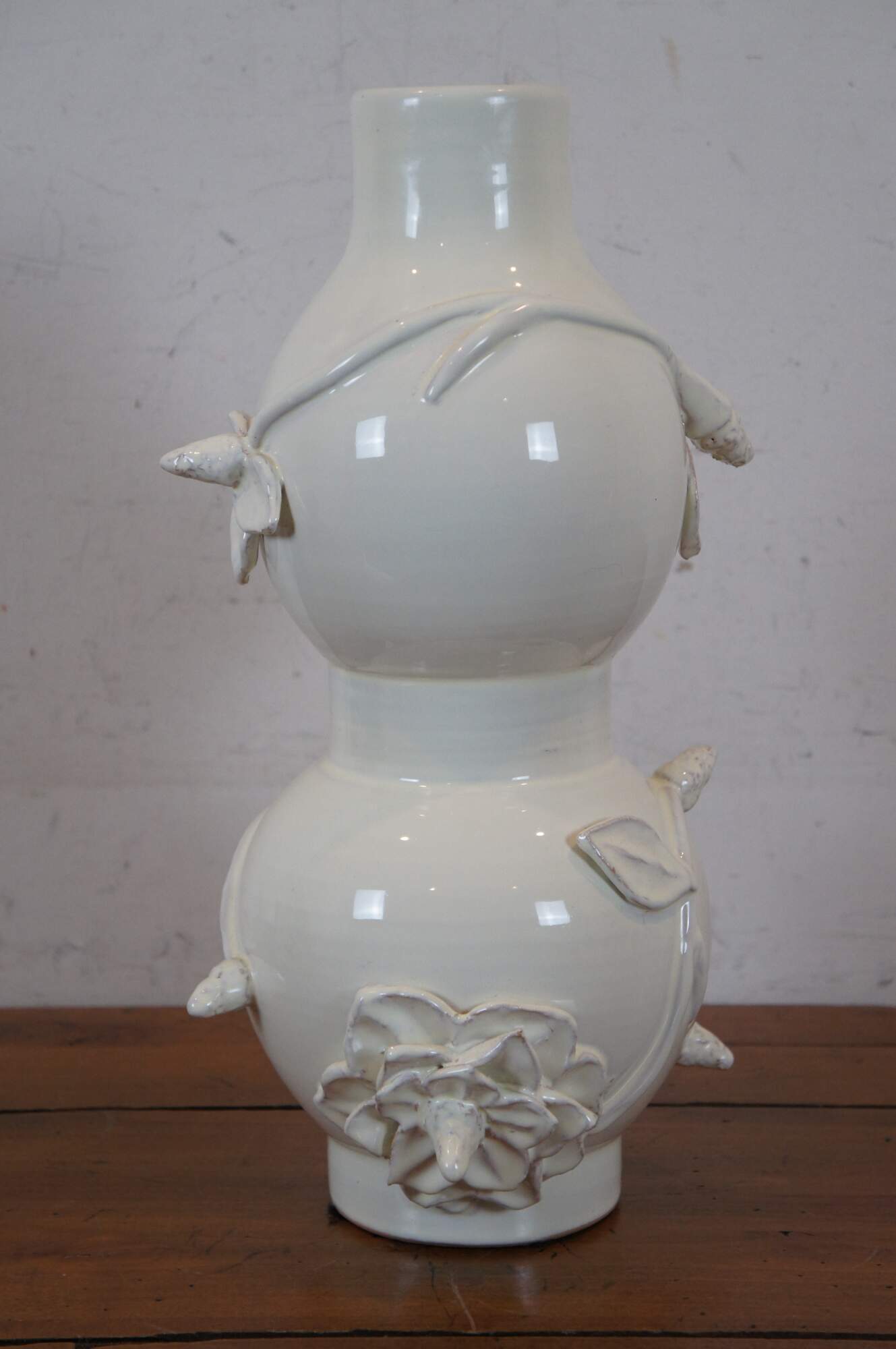 Global Views ceramic double gourd shaped vase with applied flowers, glazed in off-white. Made in Italy.