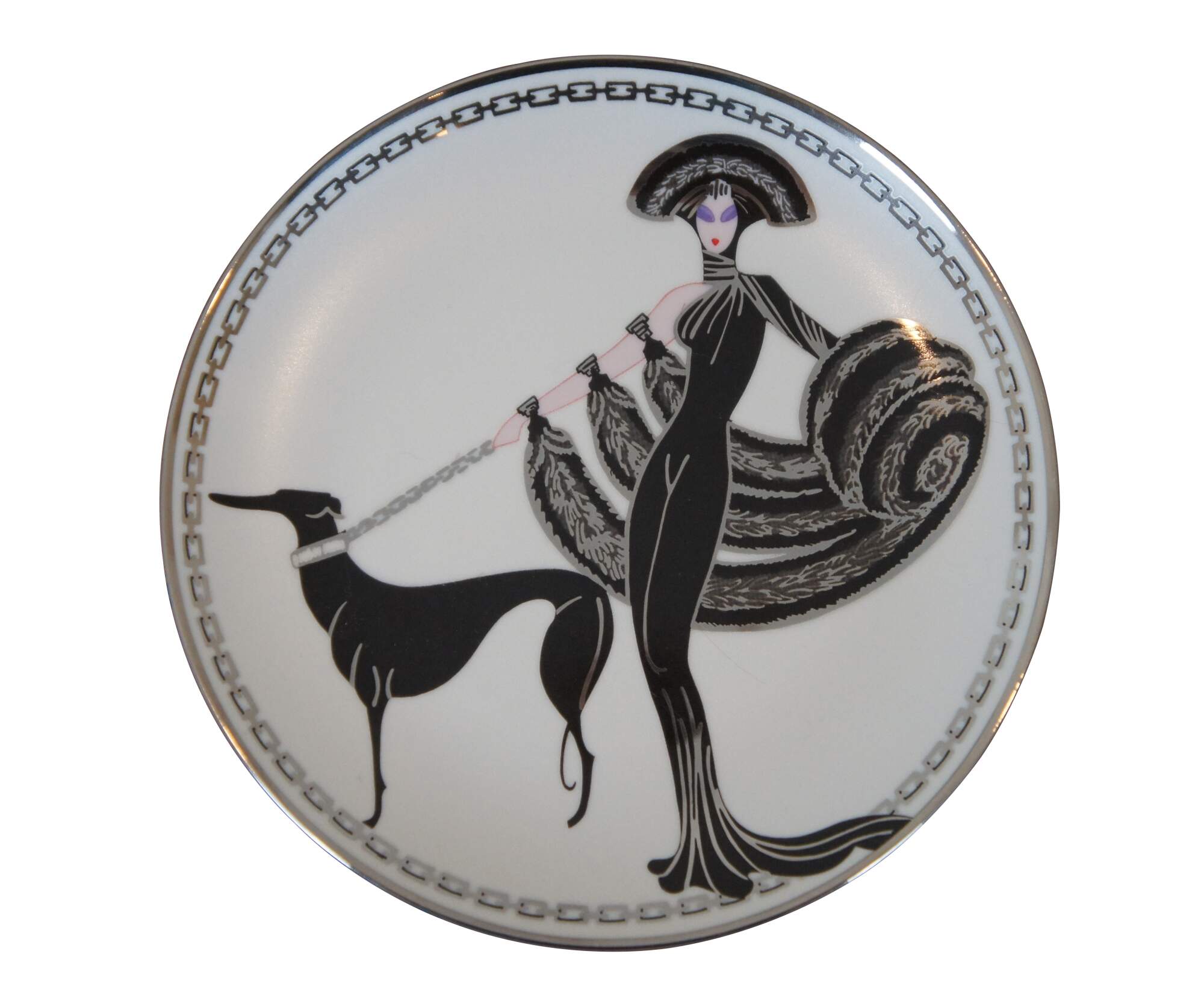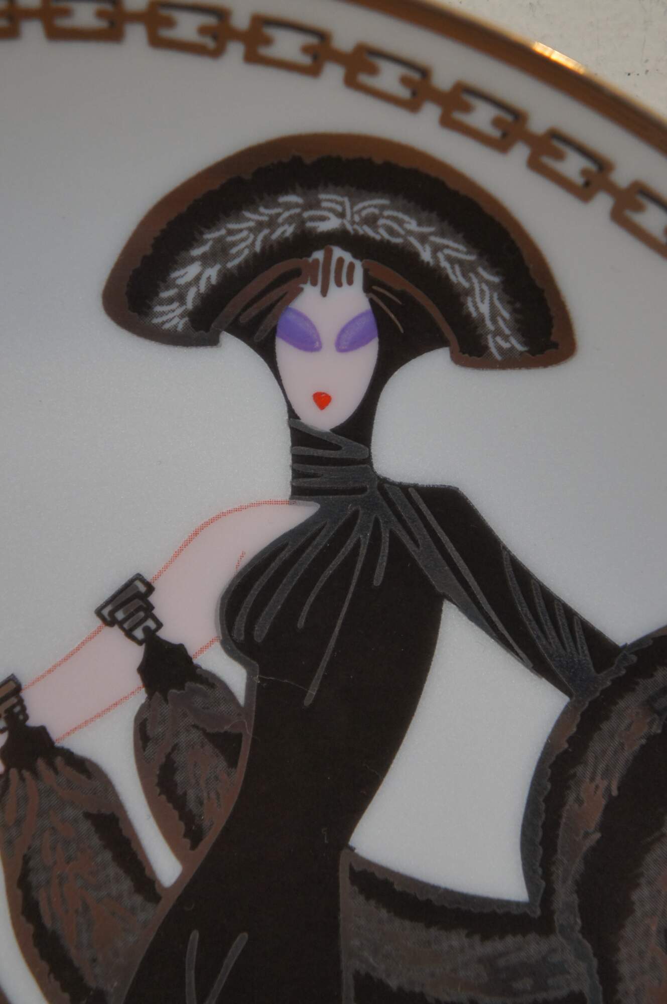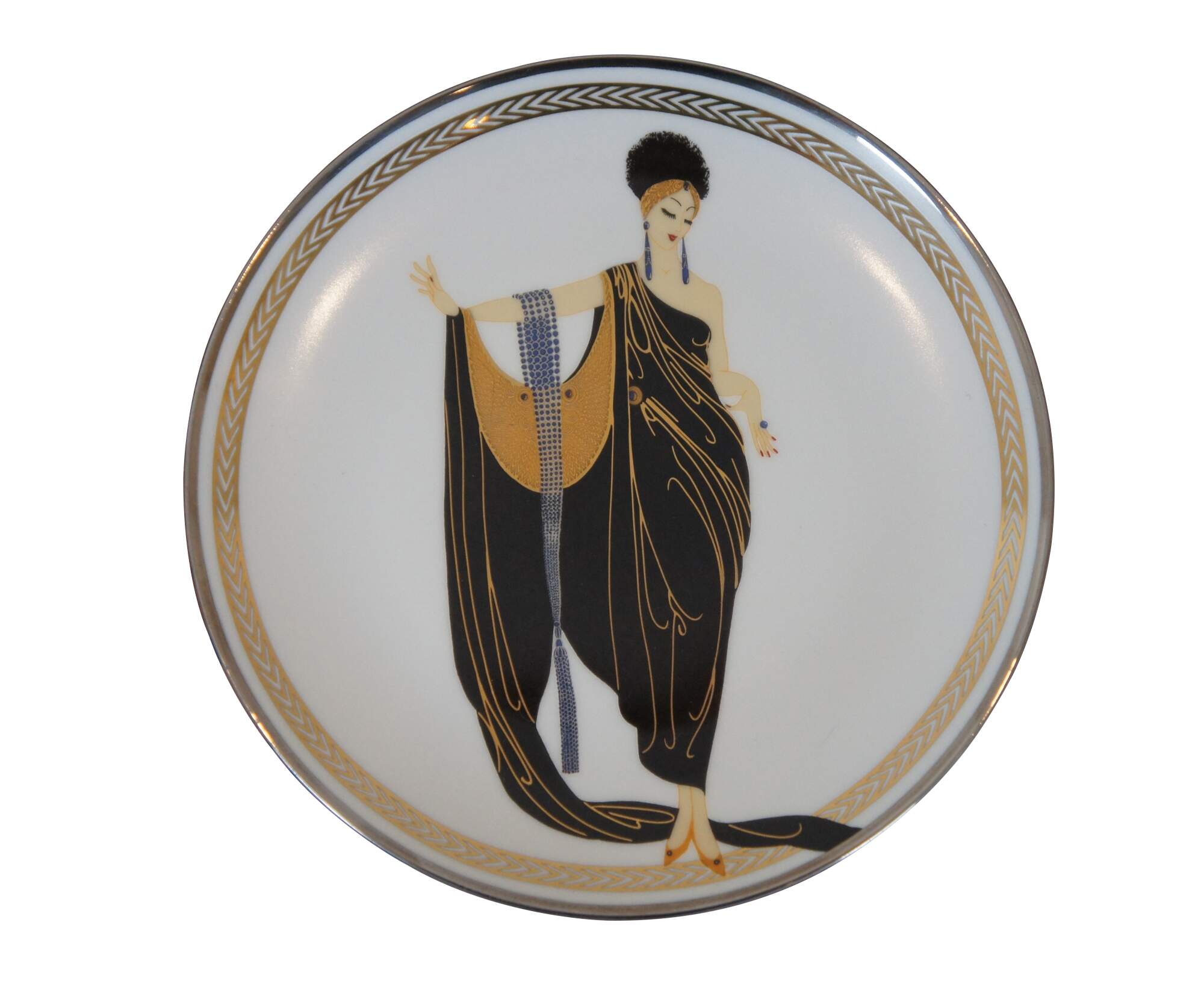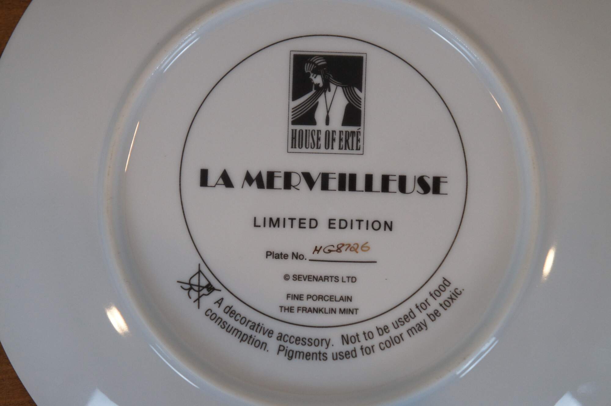 Set of three vintage Limited Edition House of Erte fine porcelain decorative plates. Trio includes: Glamour, Plate No. HD 3203; Symphony in Black, Plate No. G1230, dated 1993; and La Merveilleuse, Plate No. HG 8726. Copyright Sevenarts Ltd. Produced by The Franklin Mint. A decorative accessory. Not to be used for food consumption. Pigments used for color may be toxic.