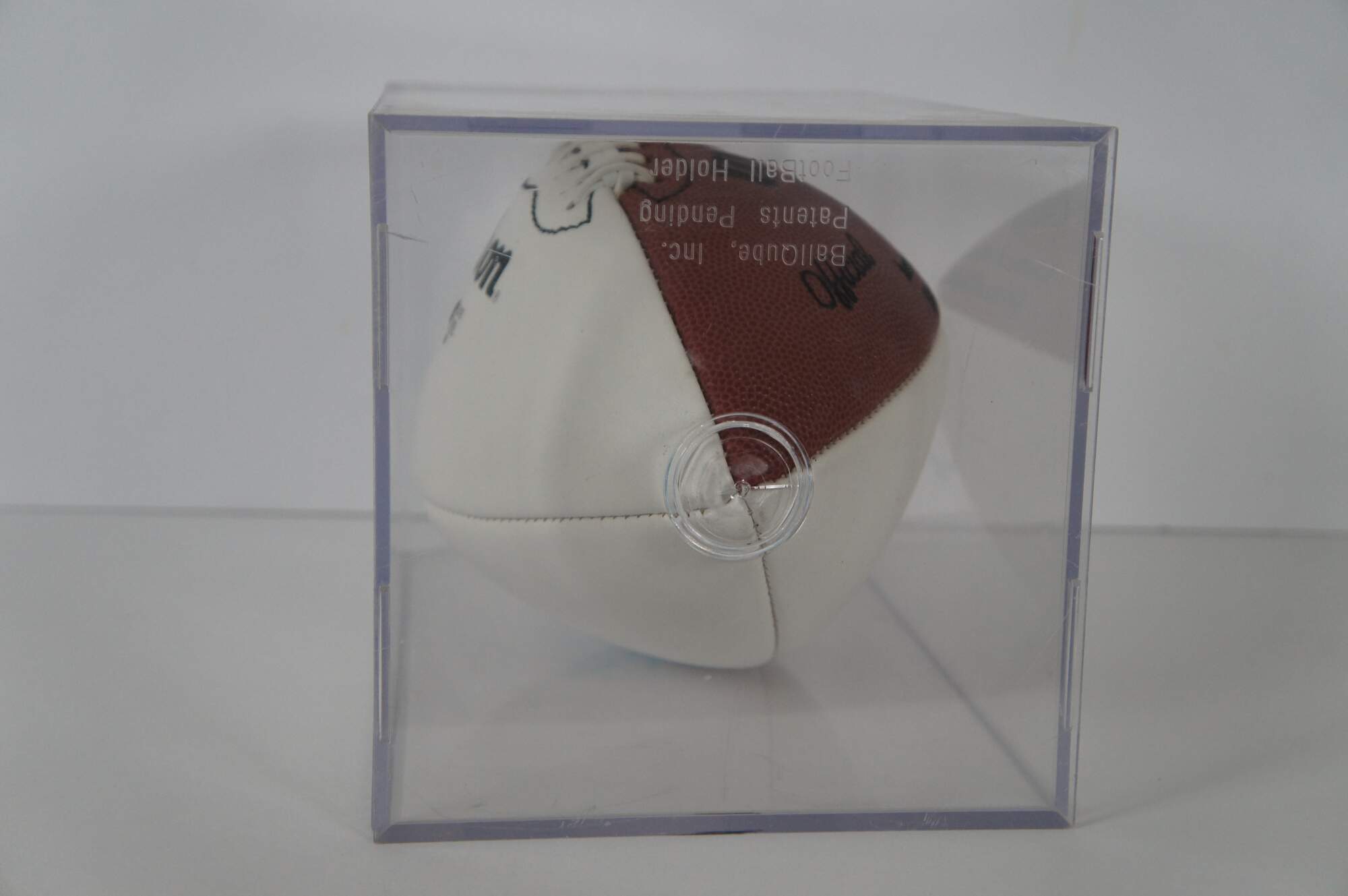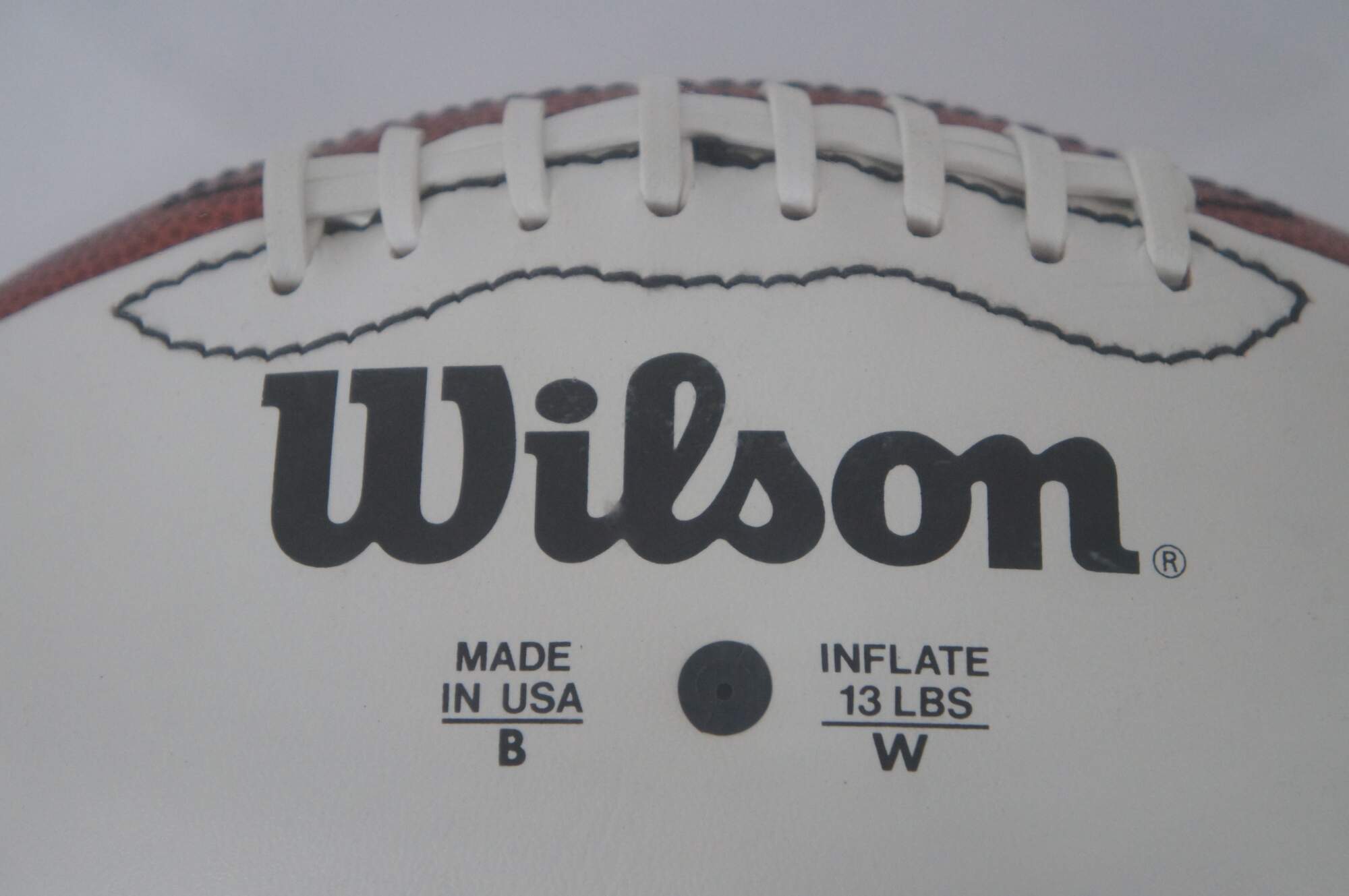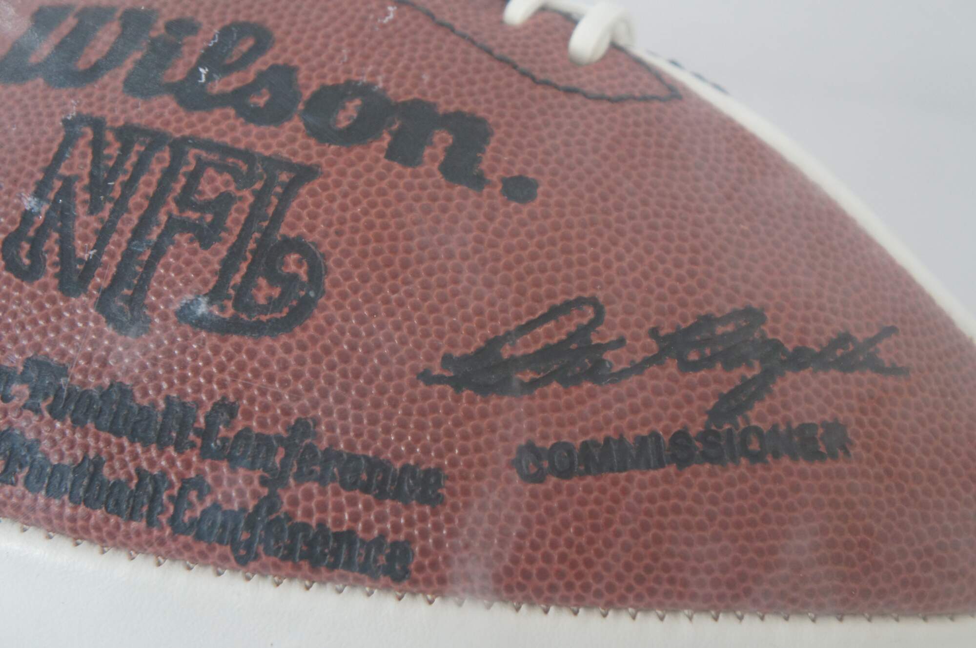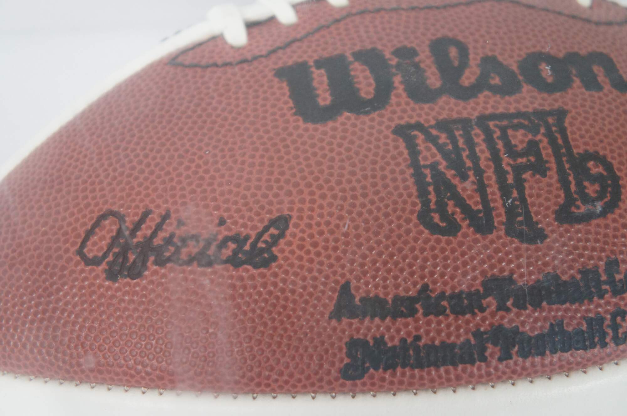 Vintage autographed / signed white and brown Official Wilson football (NFL - American Football Conference – National Football Conference – Pete Rozelle, Commissioner). Preserved / displayed in clear acrylic football memorabilia holder. Signed by Robert Cohen.