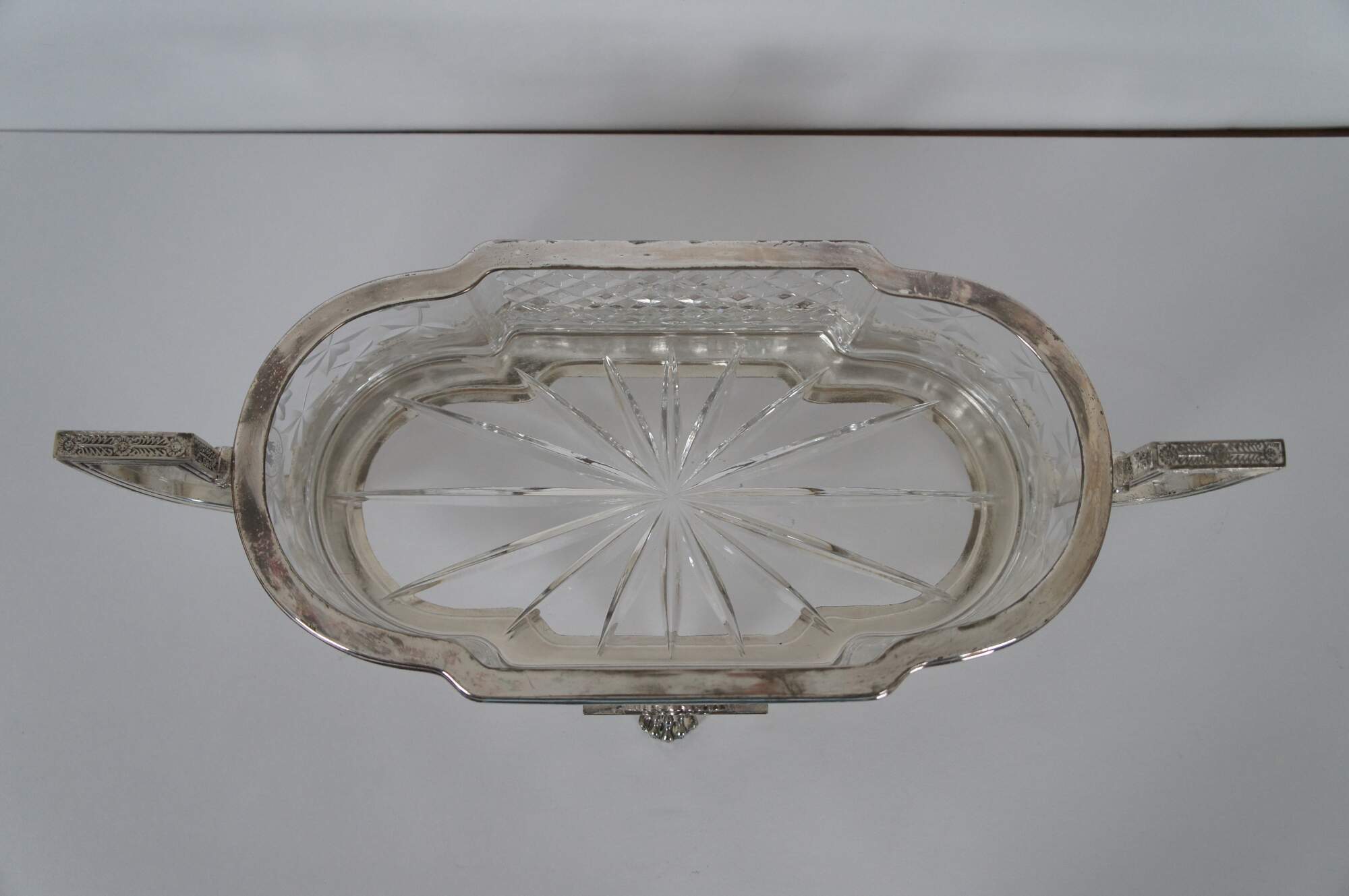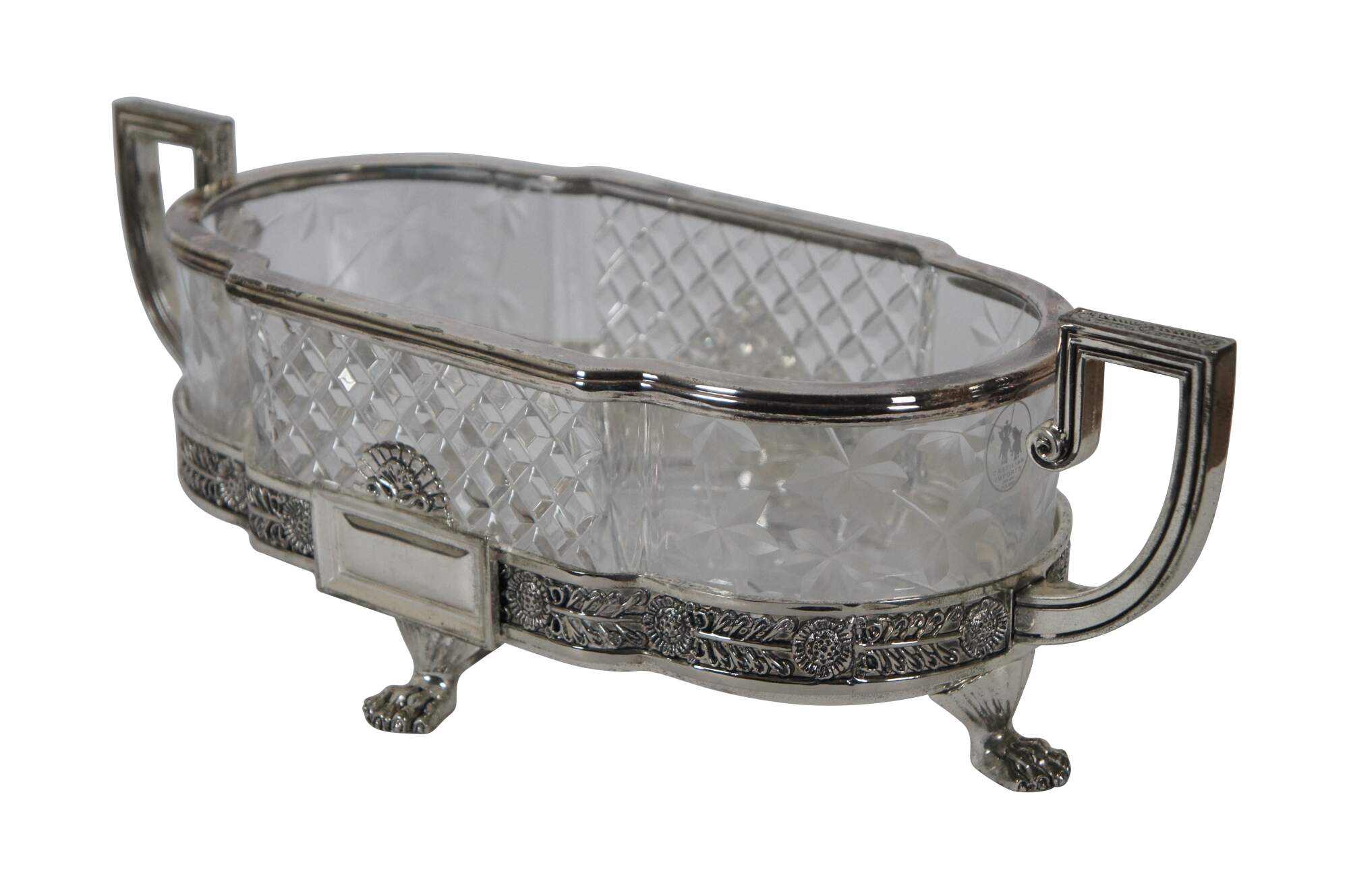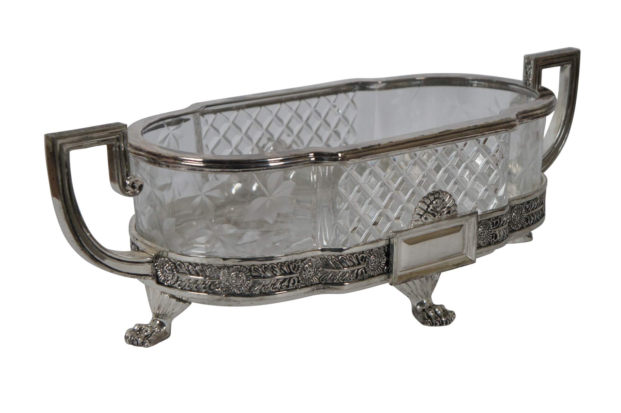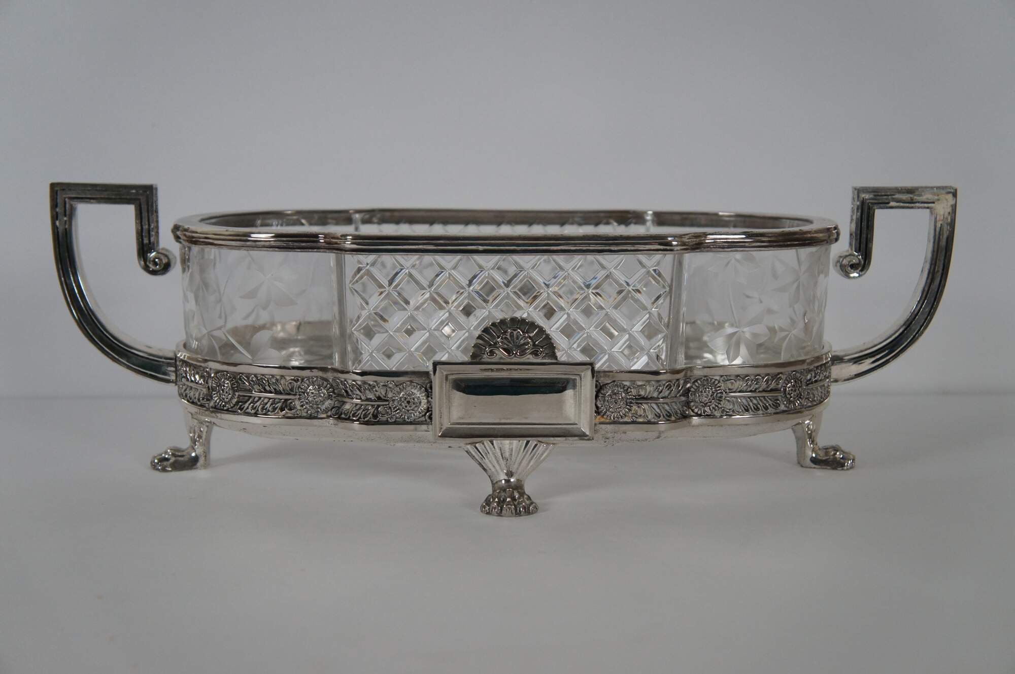 Vintage Castilian Imports cut crystal centerpiece dish in an elegant French Art Nouveau design with footed silverplate base with Greek key shaped handles, floral trim and paw / claw feet. Front and back also feature plain rectangular plates for engraving a monogram. Crystal insert made in Poland. Base made in China.